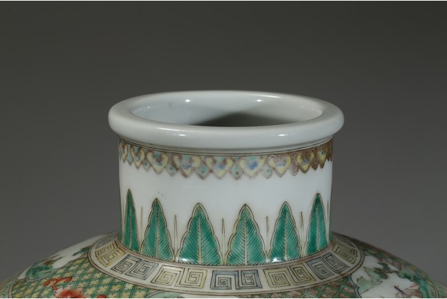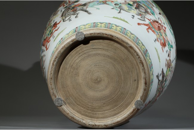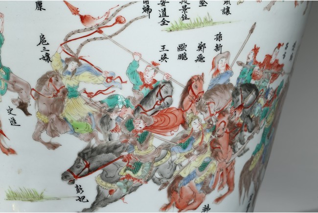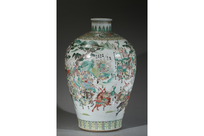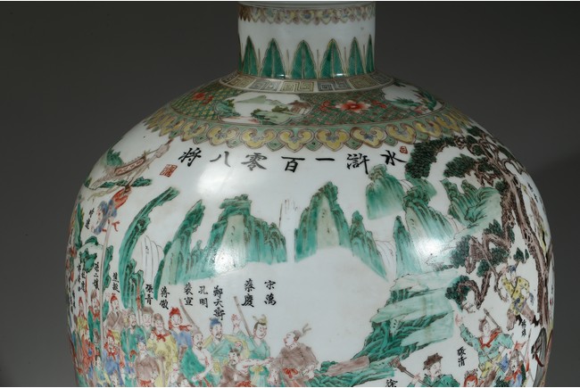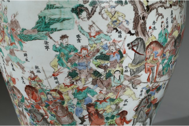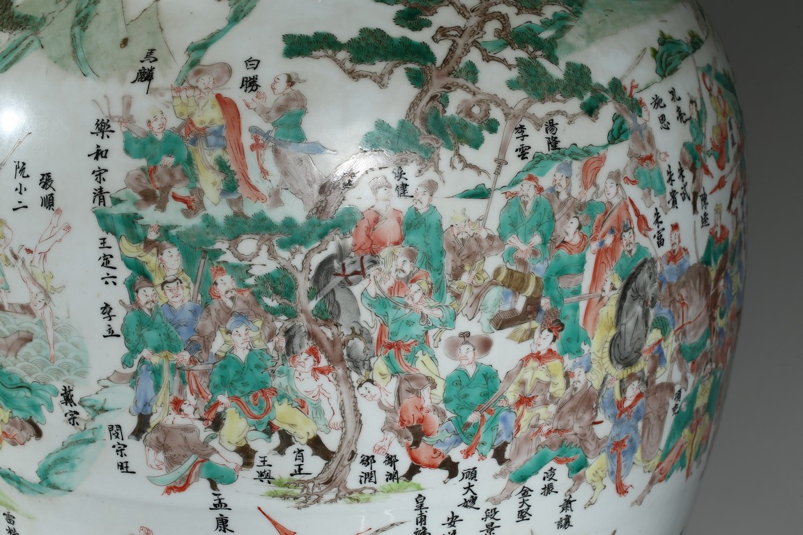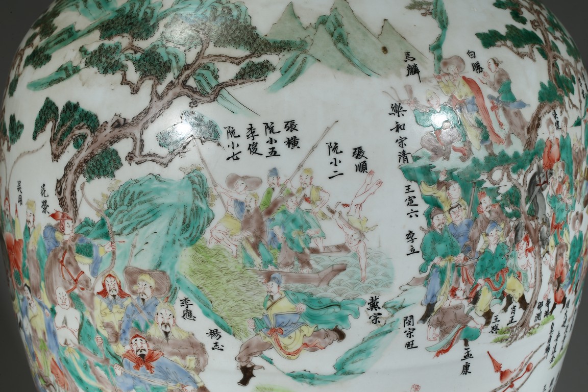 The vase is boldly decorated with a continuous scene depicting 108 heroes from the classical Chinese novel 'The Water Margin', each with name above, all set in a mountain landscape setting, below a band of ruyi lappets and shaped landscape panels around the neck. Qing Dynasty period.