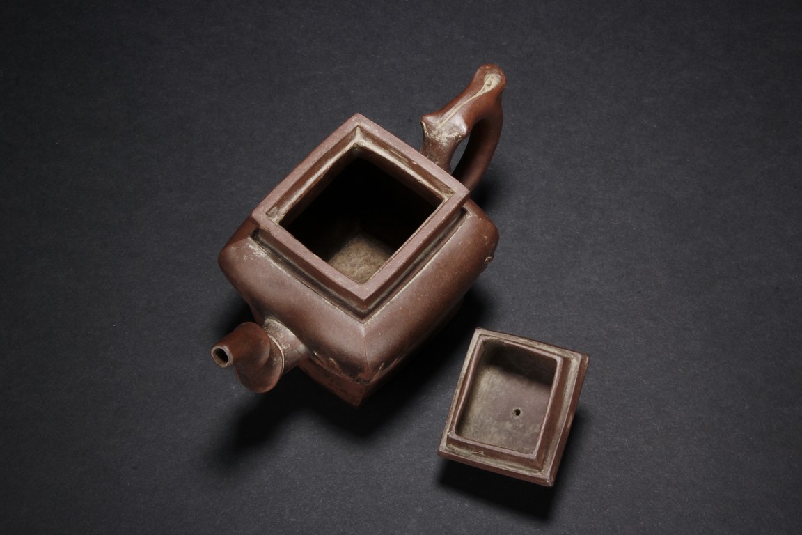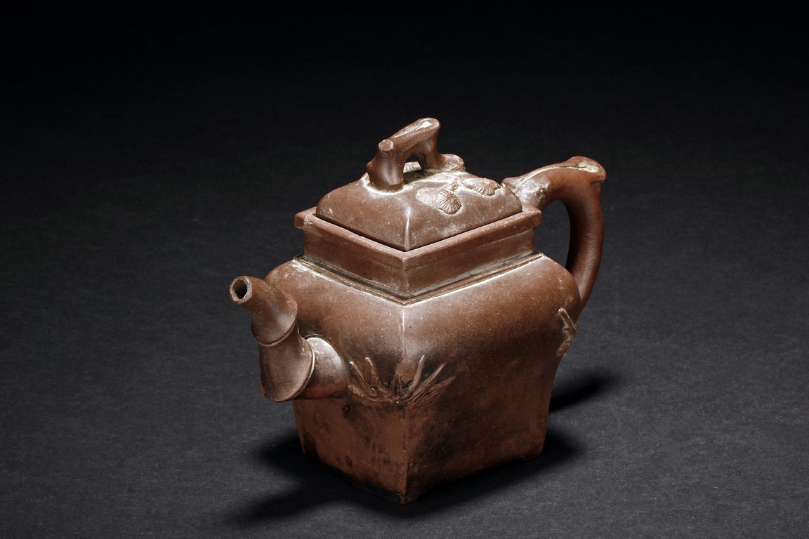 Finely modelled in square form, with bamboo shape spout, pine tree branch shape handle. Some pine needles are interspersed on the body and cover.