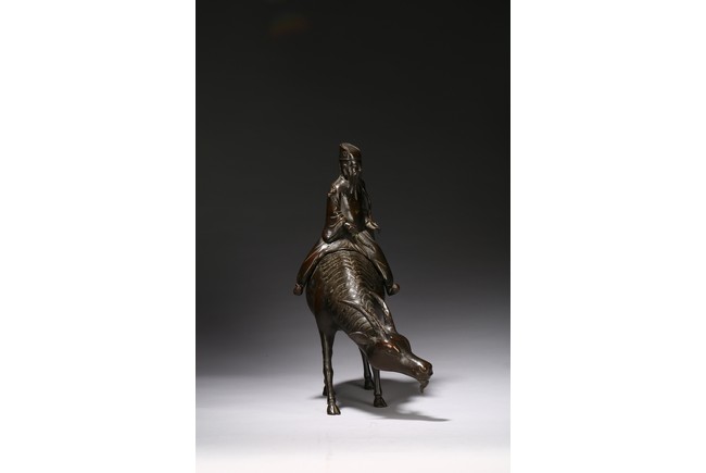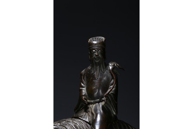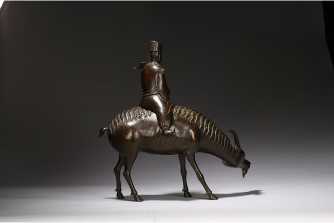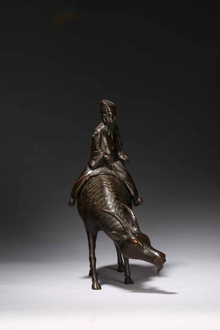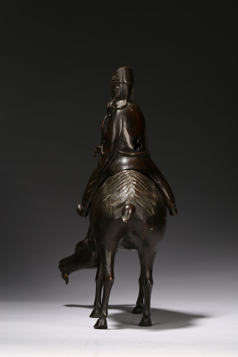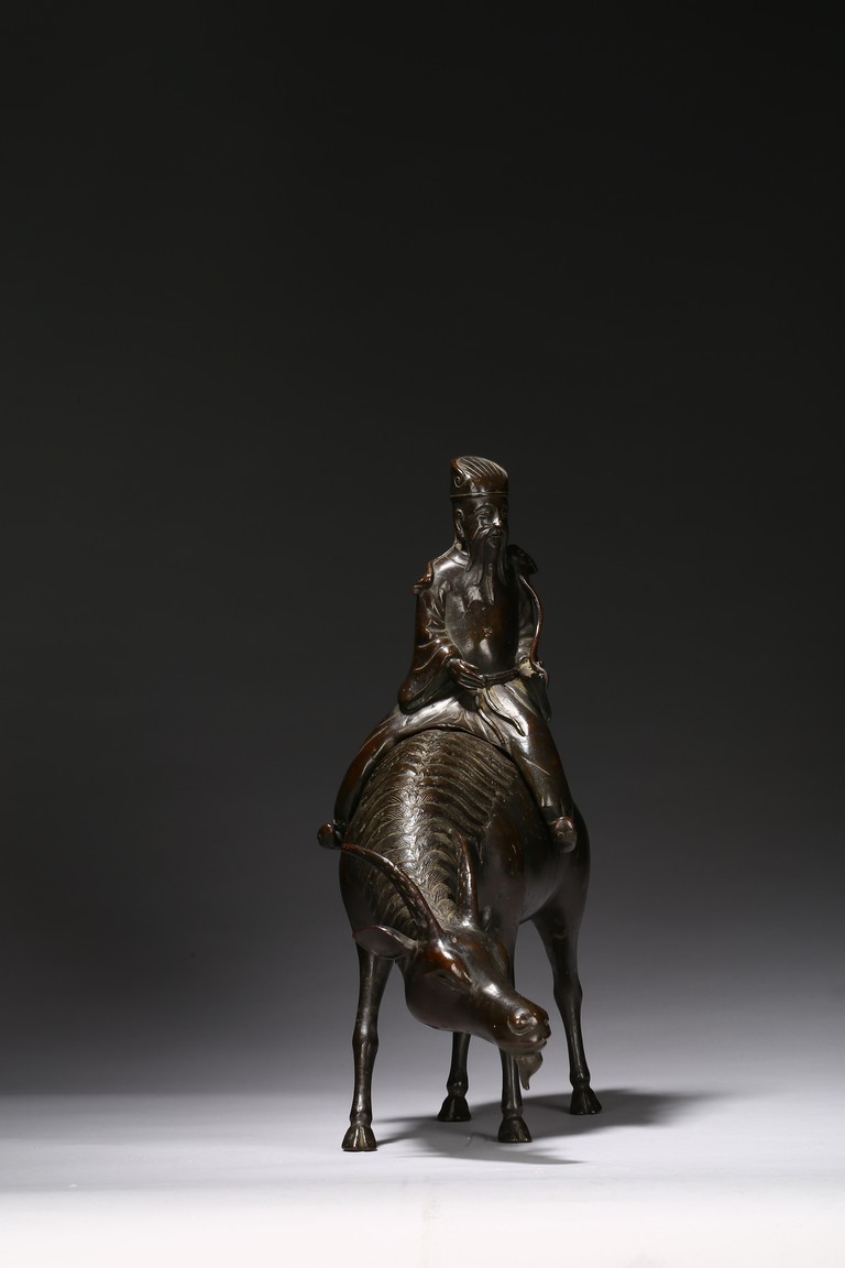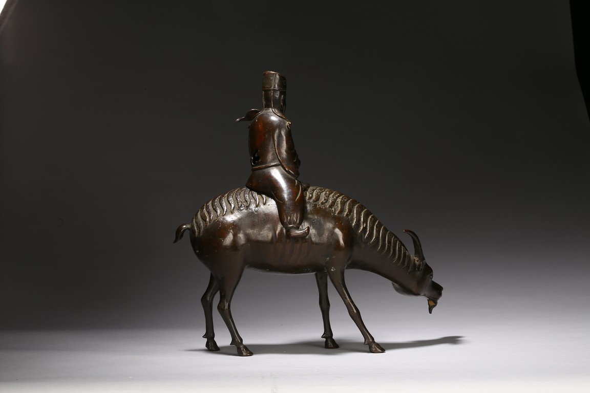 The cast figure with a detachable cover, cast in the form of the immortal elderly figure, dressed in long loose robes and wearing official's hat, with left hand holding a long ruyi scepter, fitted to the back of the hollow ram standing foursquare. Ming Dynasty period.