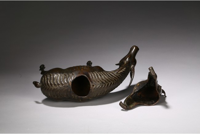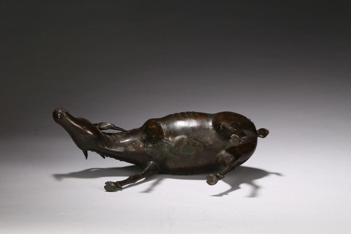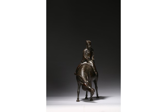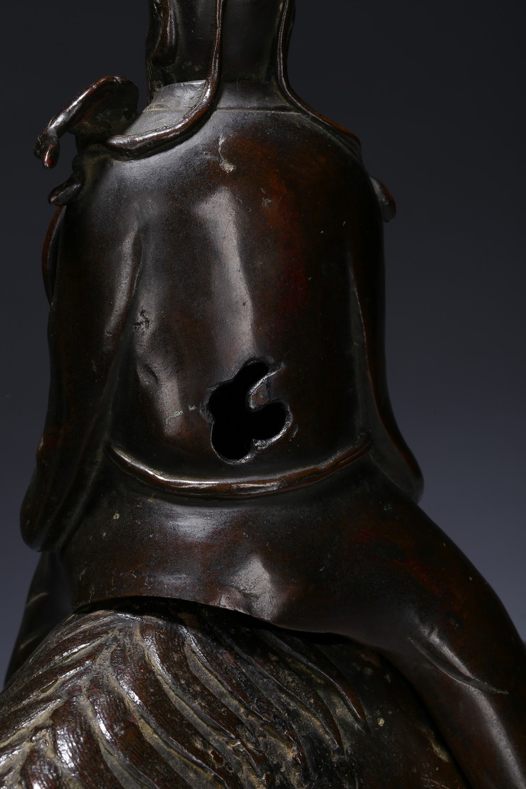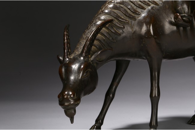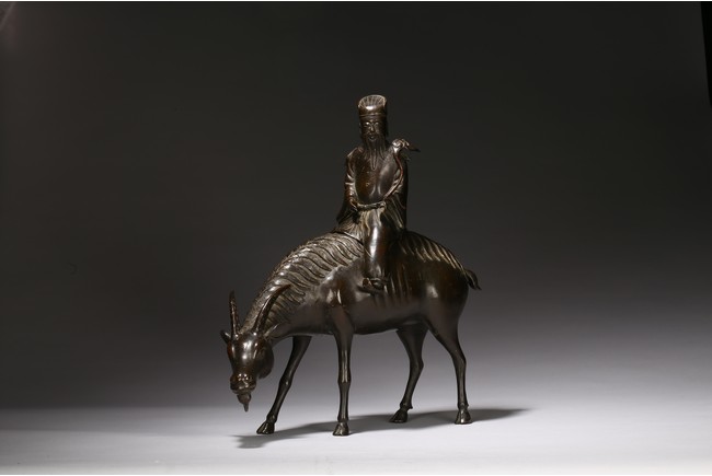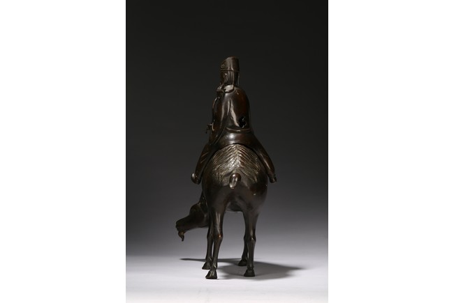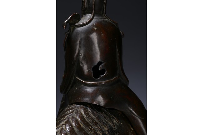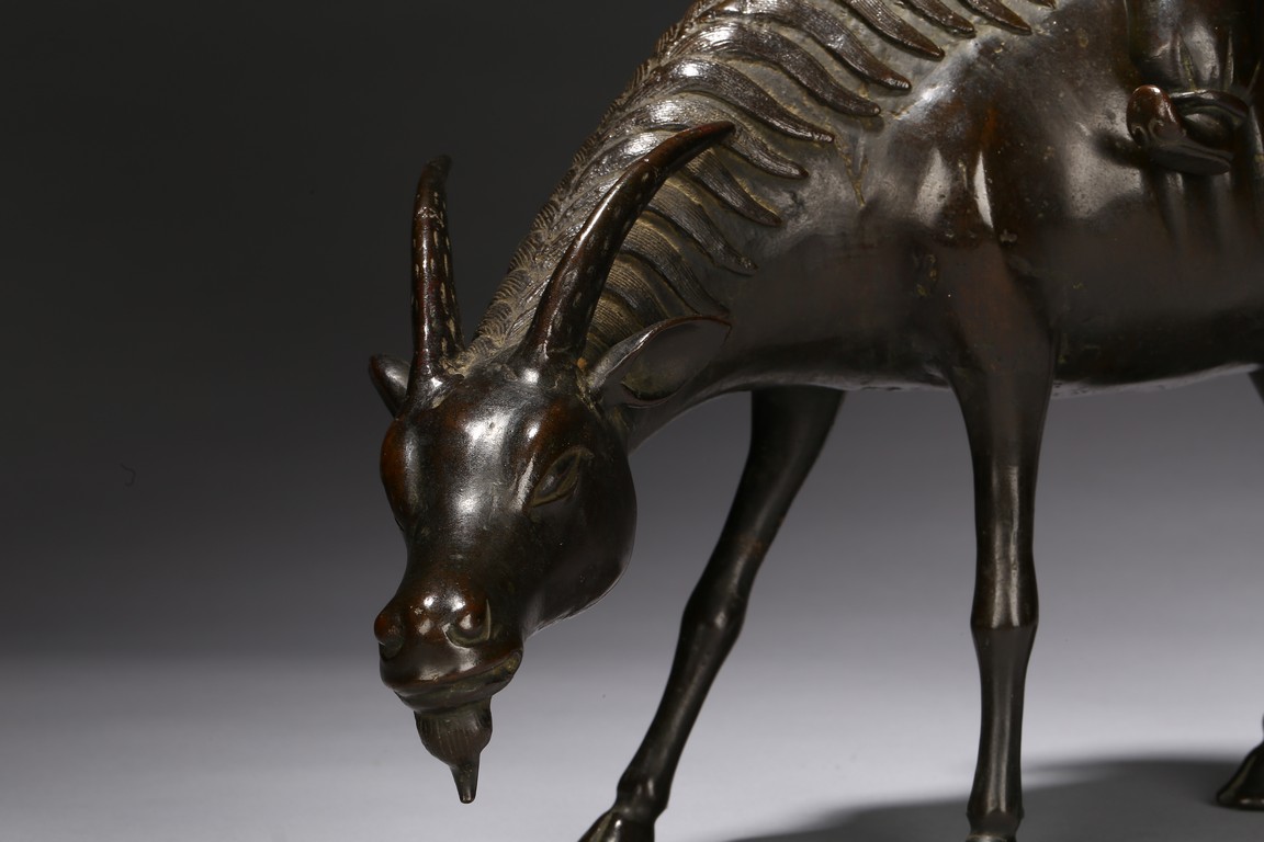 The cast figure with a detachable cover, cast in the form of the immortal elderly figure, dressed in long loose robes and wearing official's hat, with left hand holding a long ruyi scepter, fitted to the back of the hollow ram standing foursquare. Ming Dynasty period.