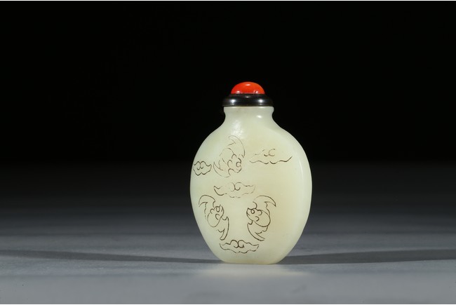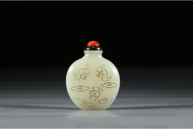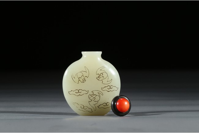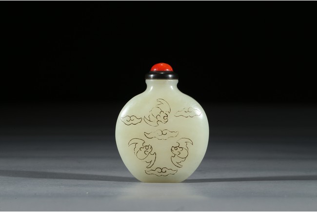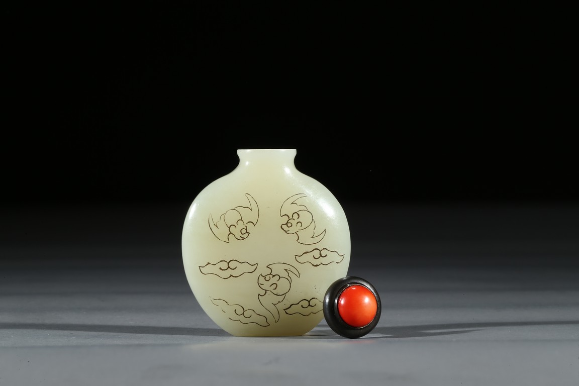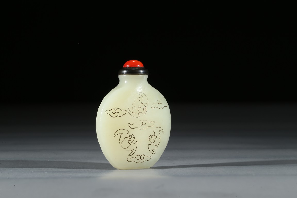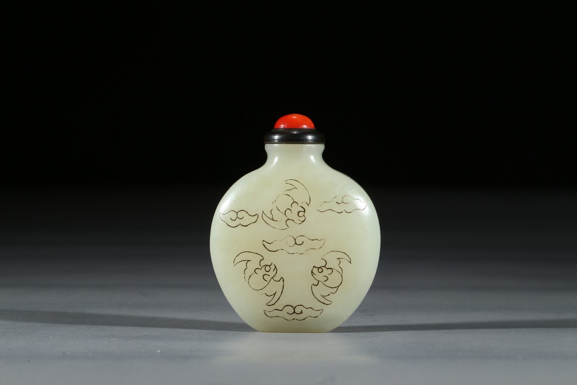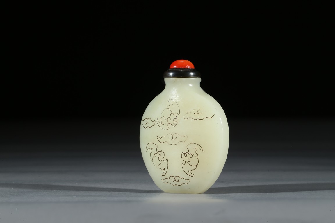A WHITE JADE 'BAT' SNUFF BOTTLE 清 白玉扁體蝠雲紋鼻煙壺