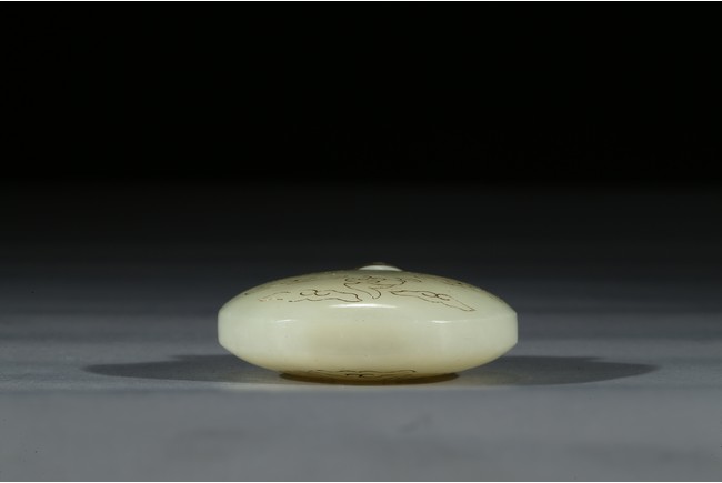 Of flattened round form, incised with auspicious bats in cloud. Qing Dynasty period.