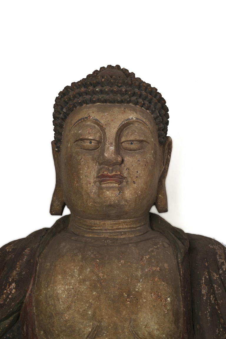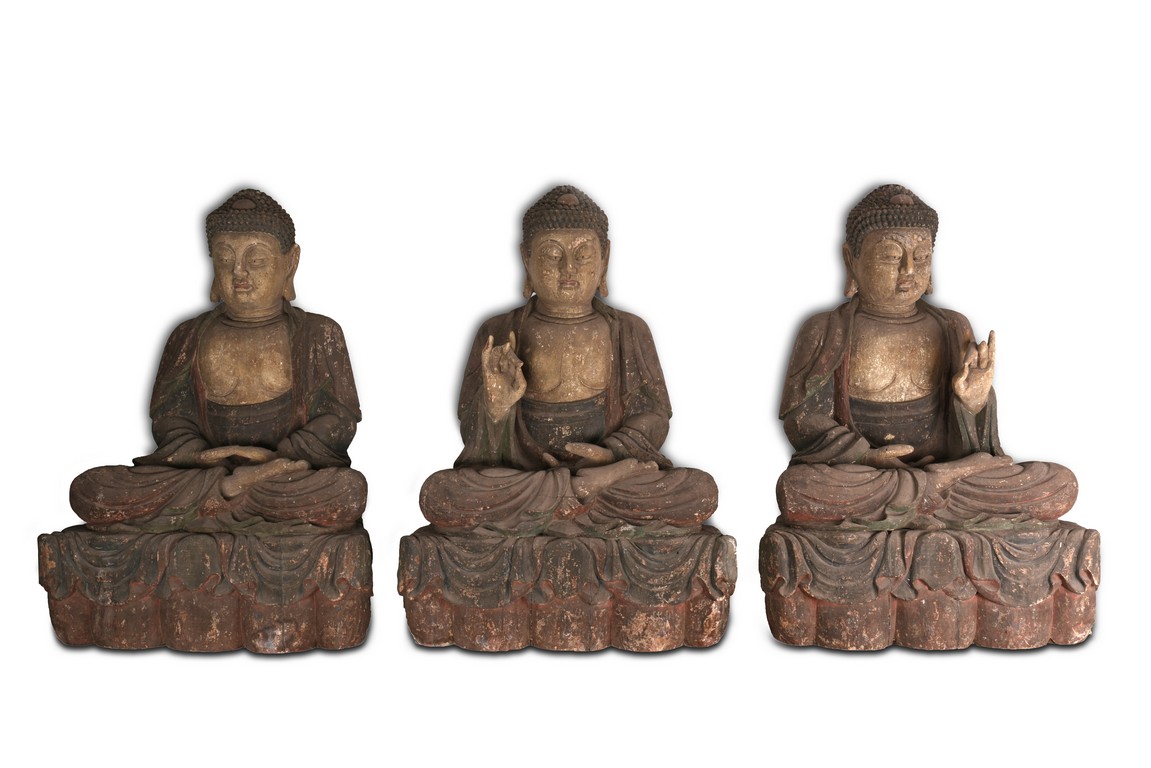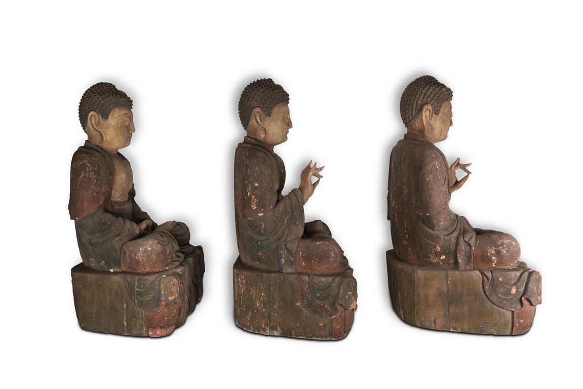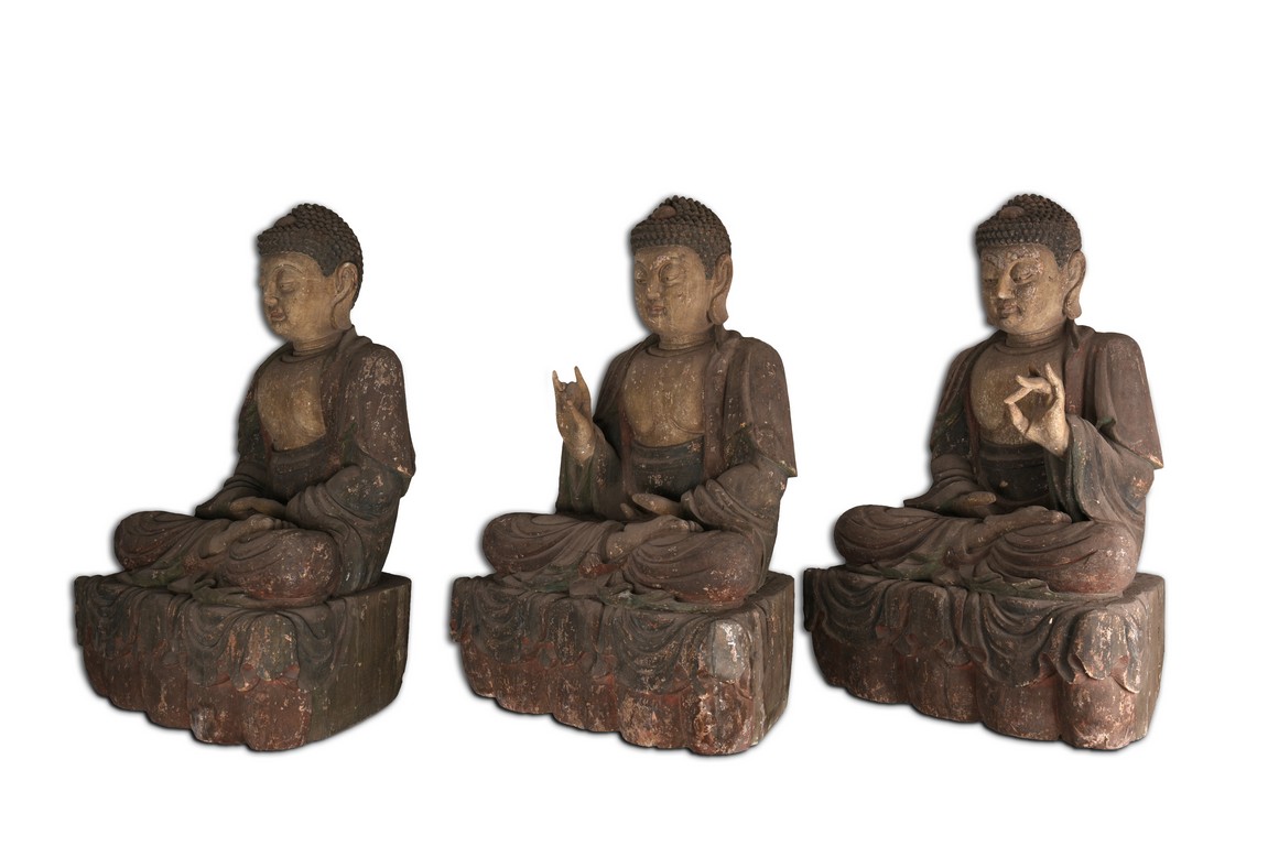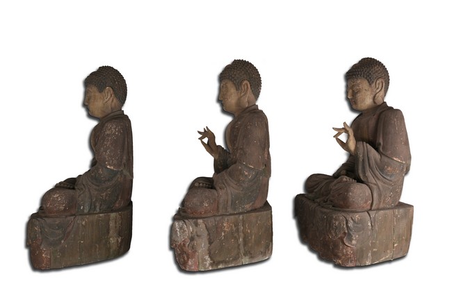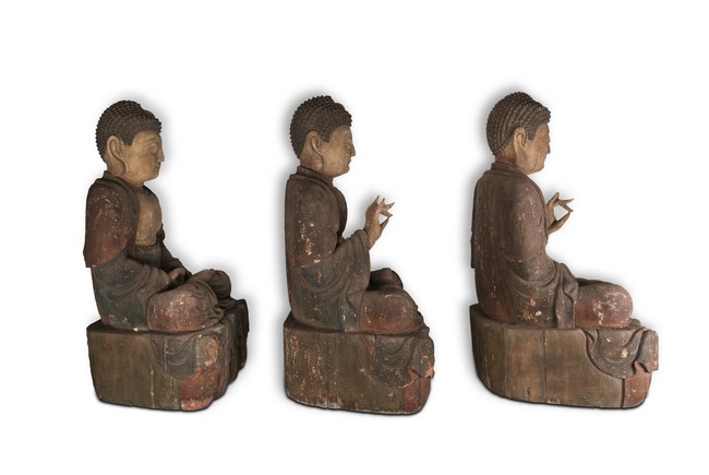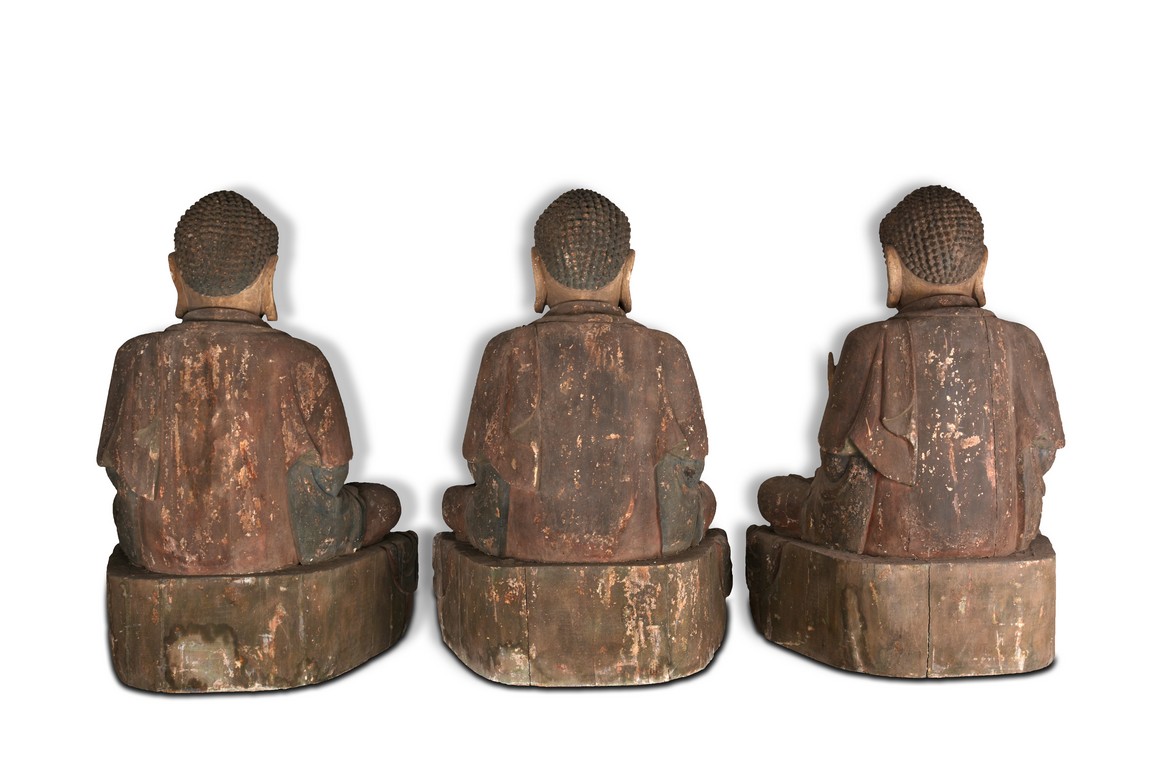 Three large wooden figure of buddha, each is shown seated in dhyanasana upon throne, wearing loose-fitting robe draped from shoulders, the serene face with gentle smile ,the head with ushnisha with tight curls flanked by two pendulous earlobes, their hands in different mudras.