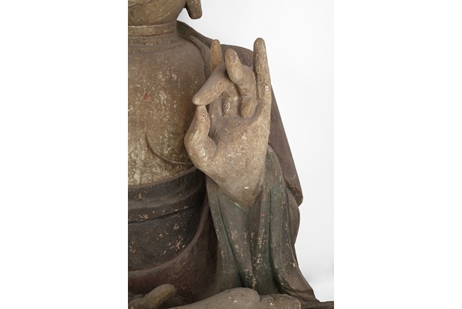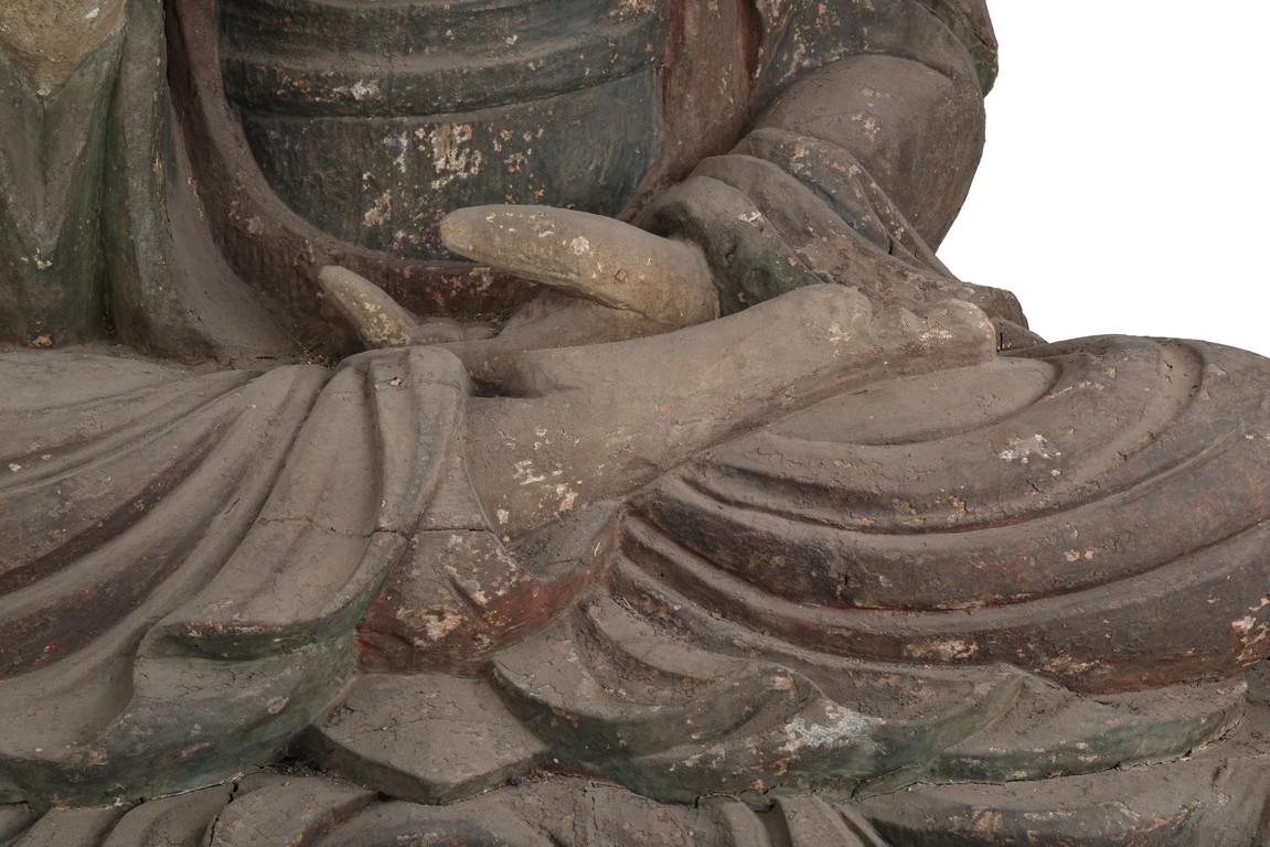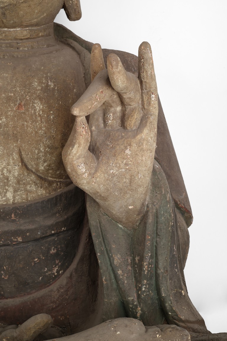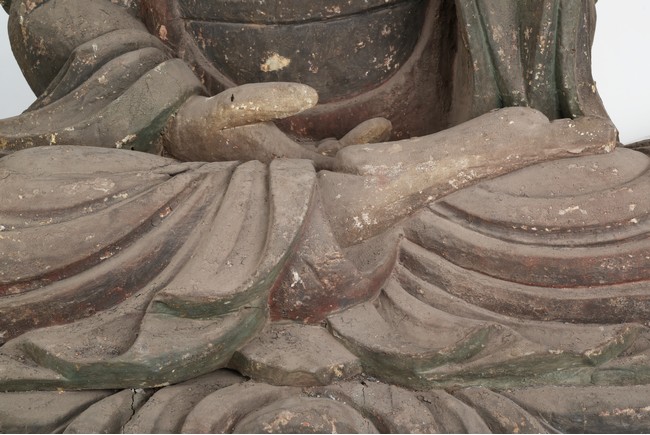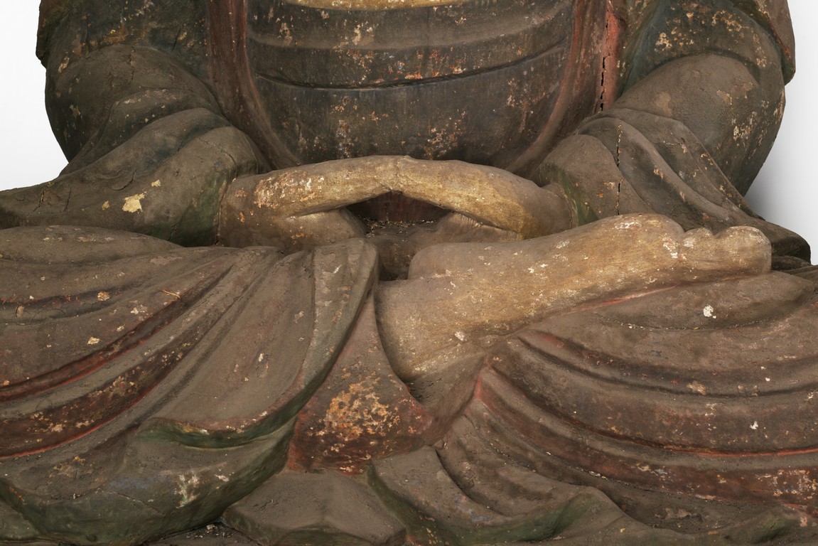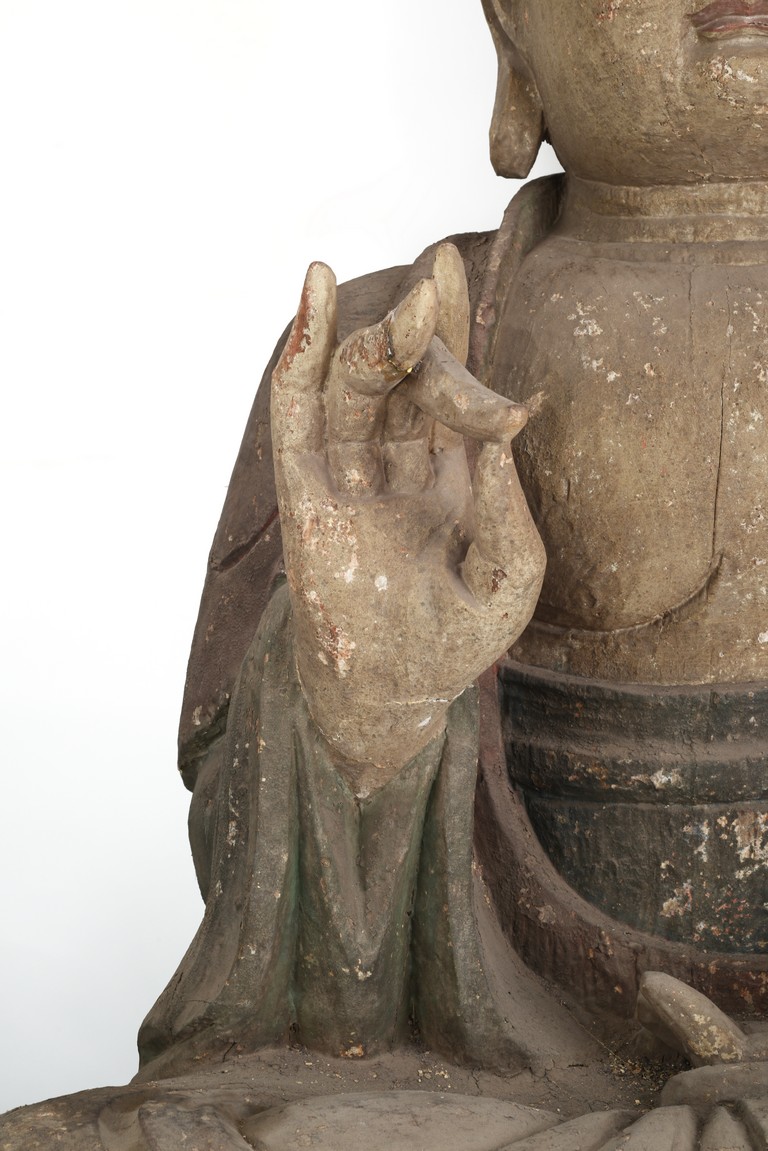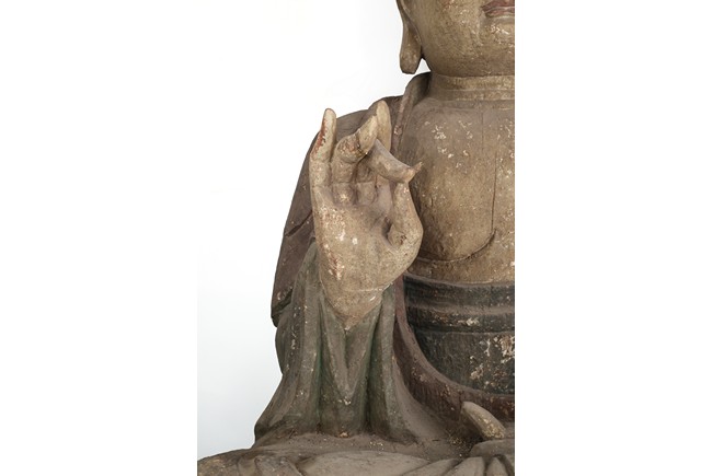 Three large wooden figure of buddha, each is shown seated in dhyanasana upon throne, wearing loose-fitting robe draped from shoulders, the serene face with gentle smile ,the head with ushnisha with tight curls flanked by two pendulous earlobes, their hands in different mudras.