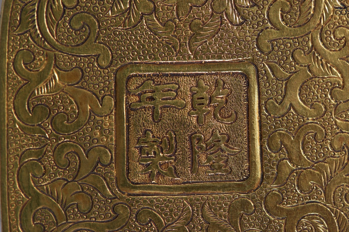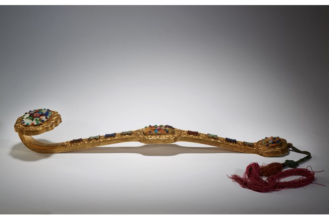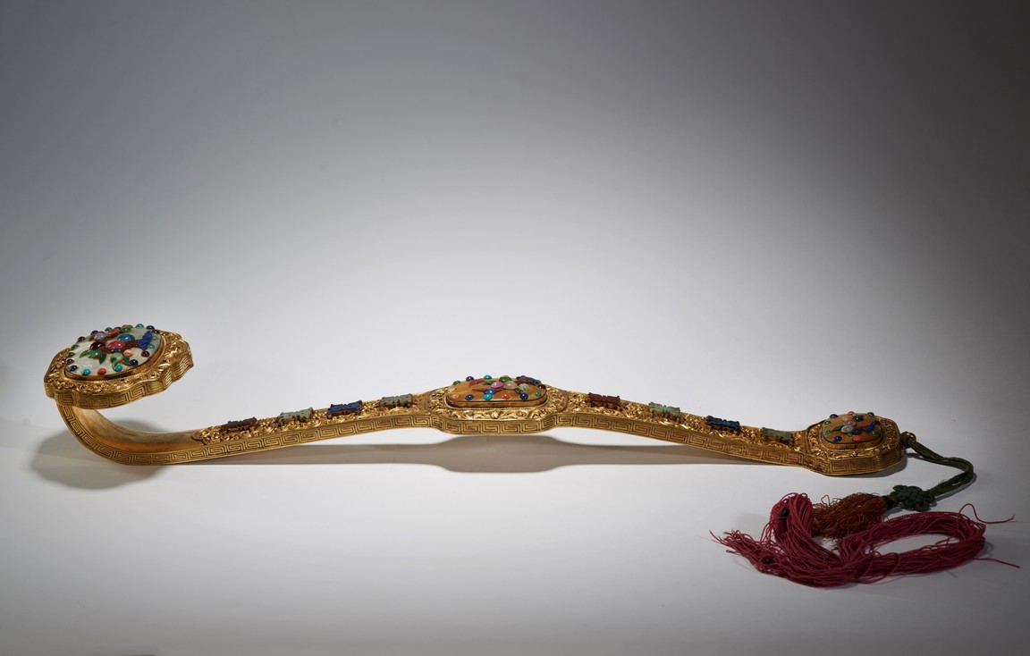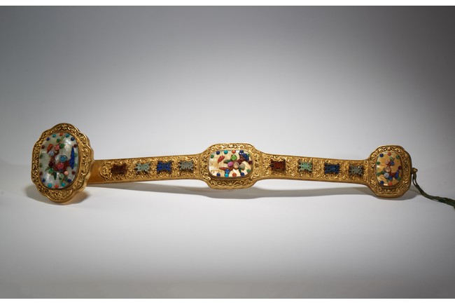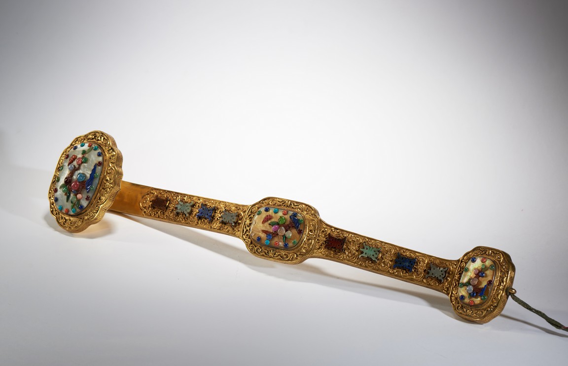 The head,center section,and tip inset with mother-of-pearl plaques,all inlaid with various jades and semi-precious gems including turquoise,jadeite,agate,lapis lazuli with scenes incorporating peach trees and auspicious bats,the shaft inlaid with stylized shou characters inlaid with similar gems against raised lotus floral scroll ground. Qing Dynasty period.