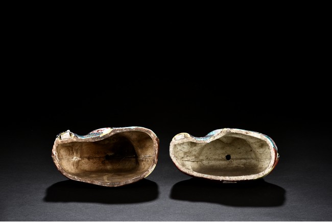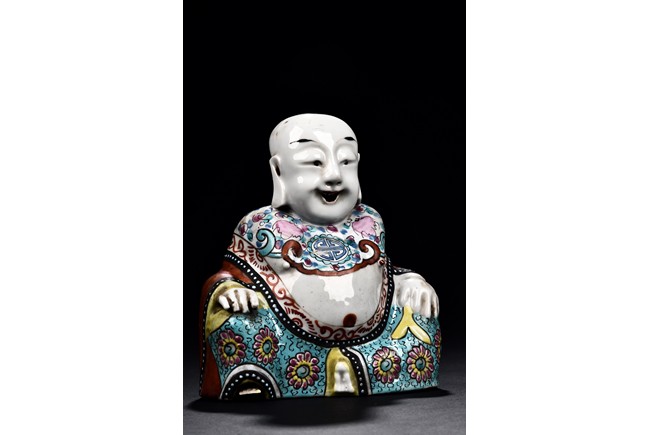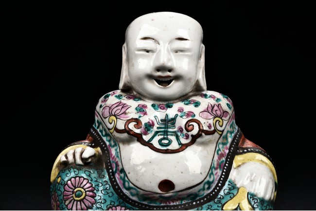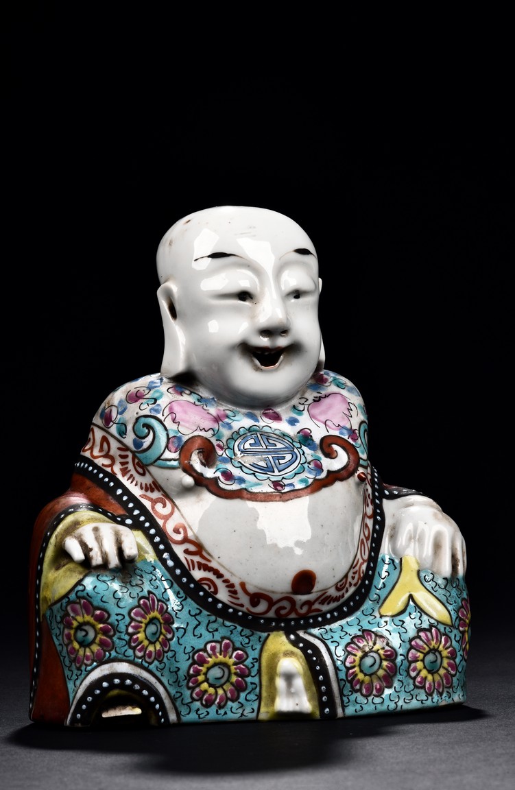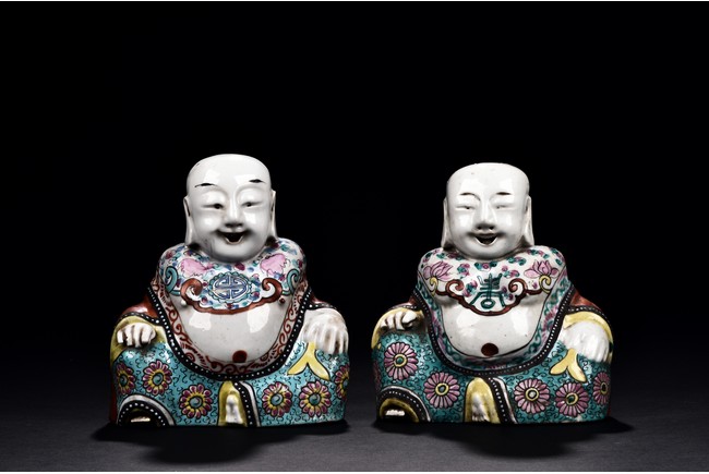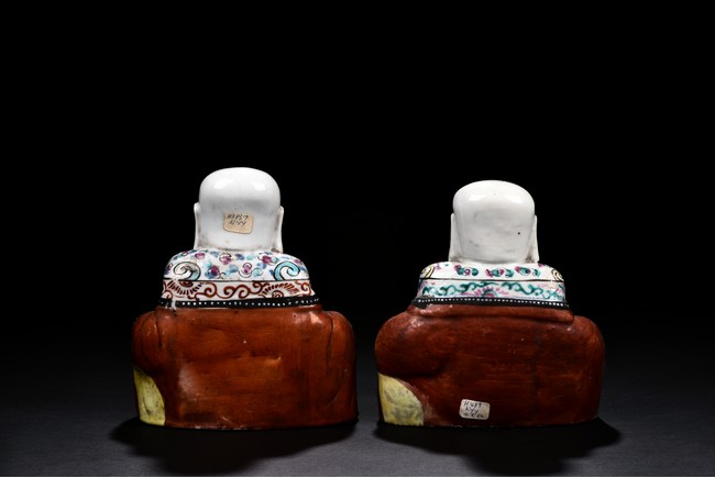 Each modelled seated with hands rested on knees, the robe decorated with lotus flower and collar with shou character, face with joyful expression.