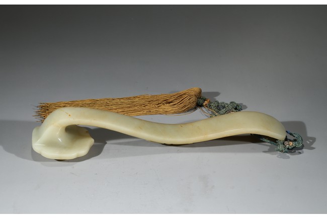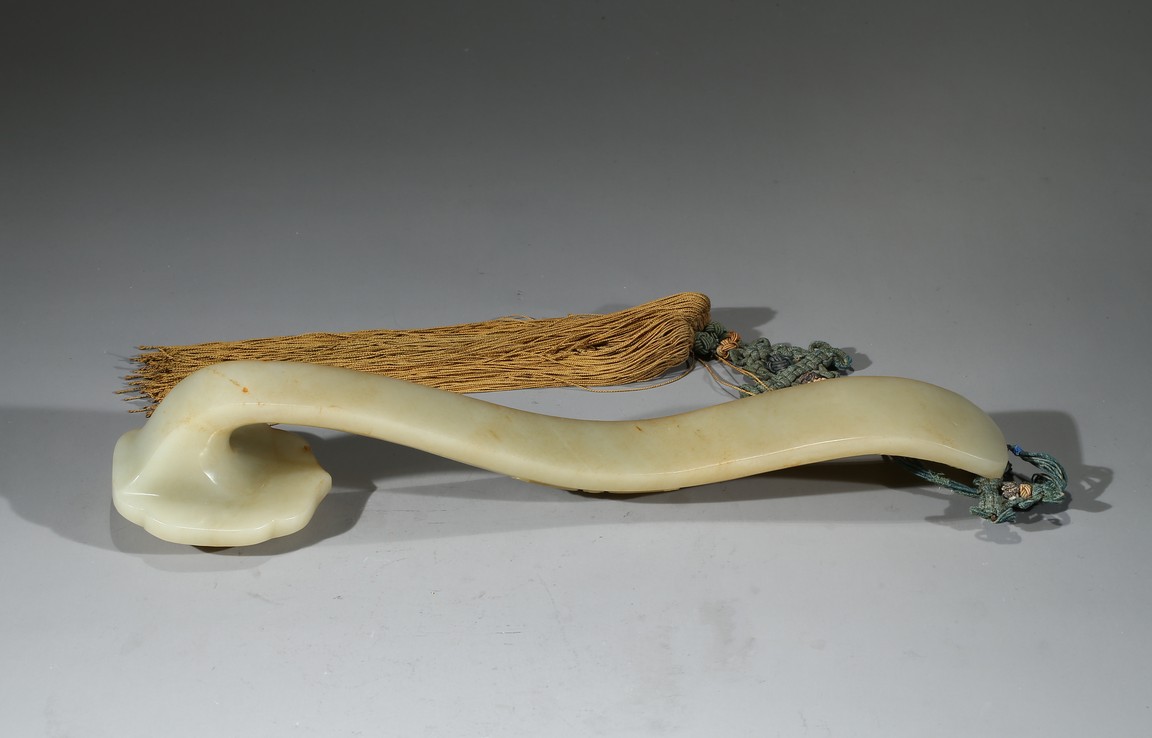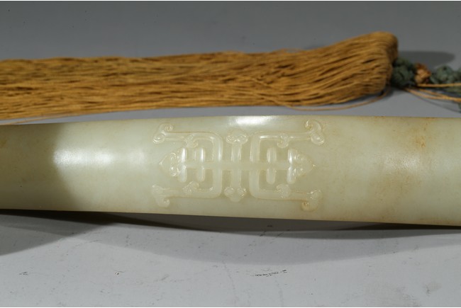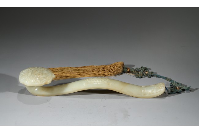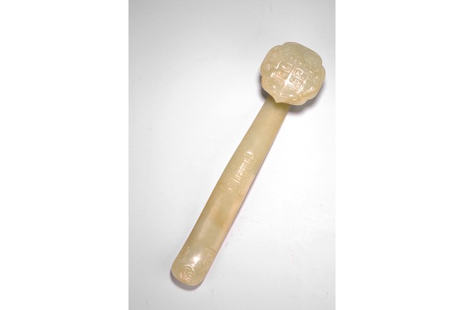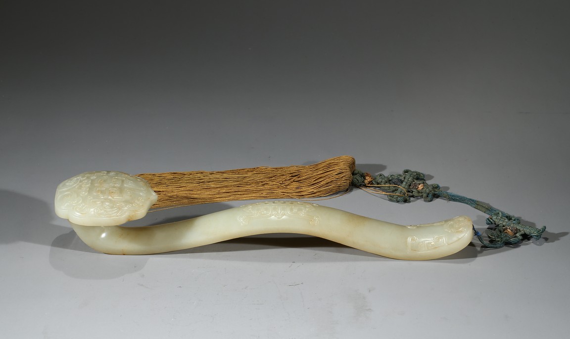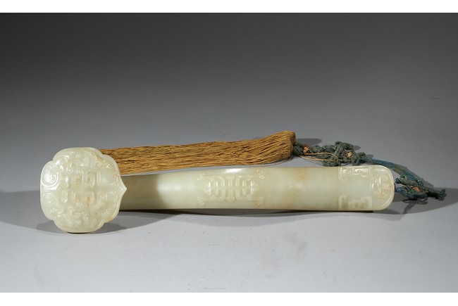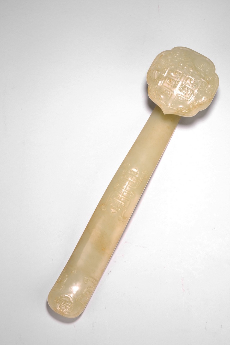 The large ruyi-shaped head delicately carved in relief with an archaistic taotie mask, the arched shaft carved with a stylized shou character in relief, the end further decorated with a smaller ruyi-shaped motif. The stone is of slightly pale celadon white tone. Qing Dynasty Qianlong period.