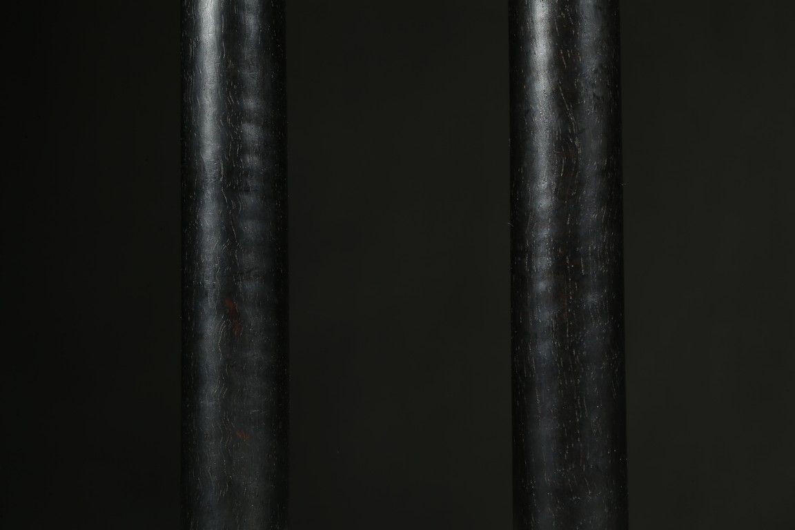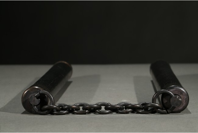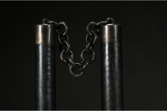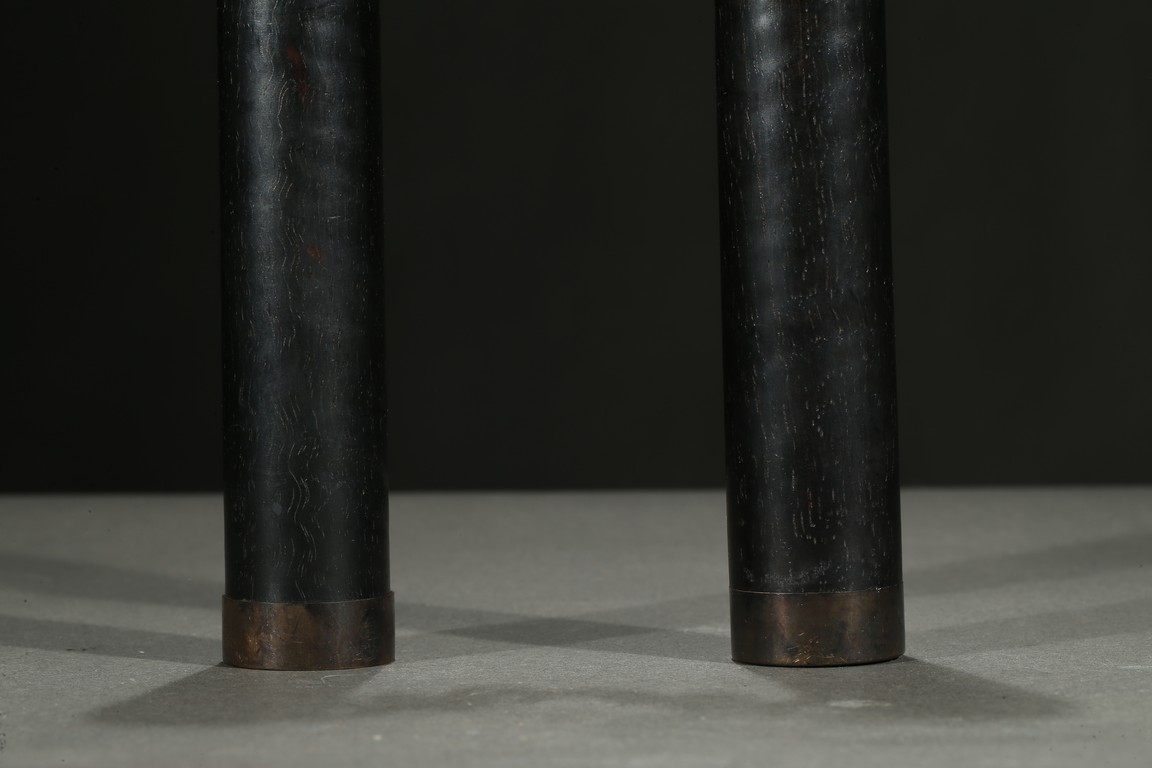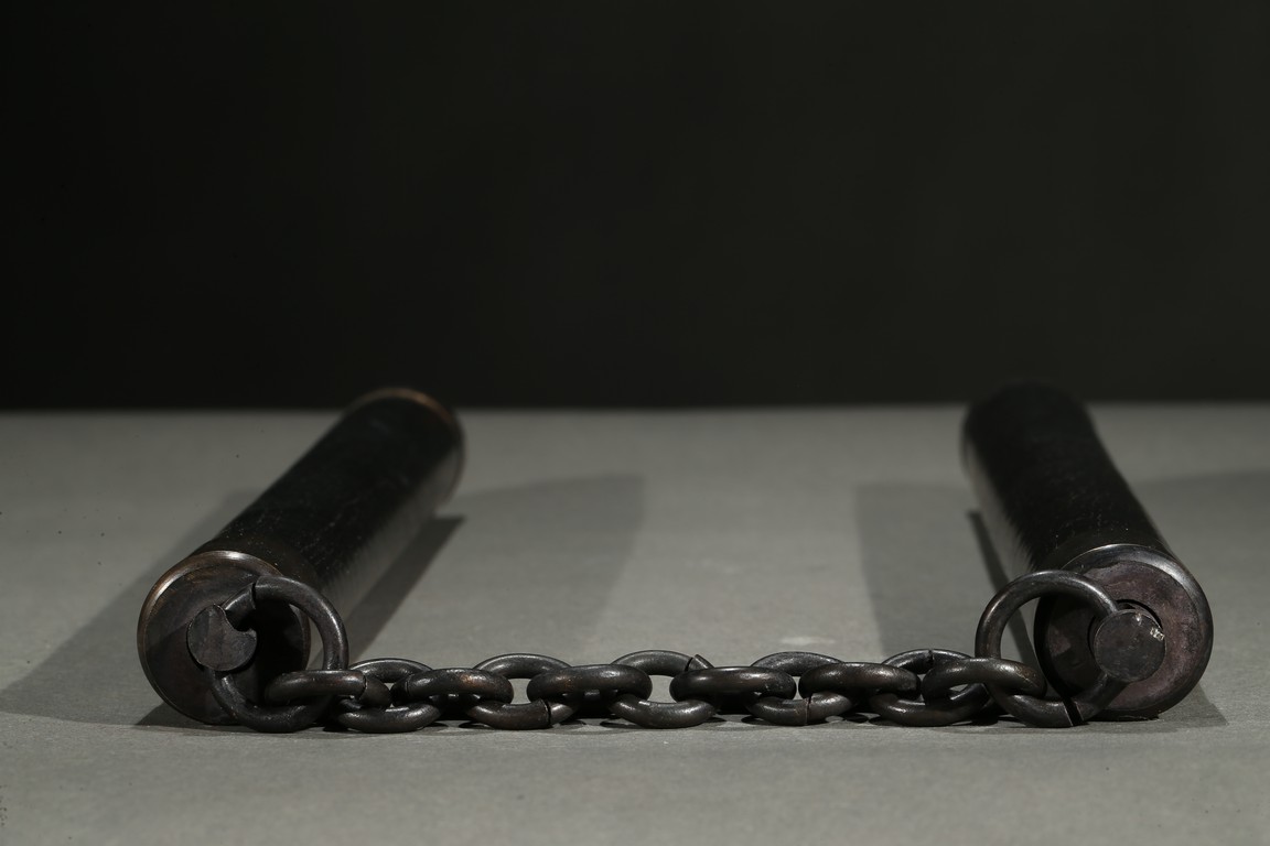 Cylindrical hardwood handles inlaid bronze on four ends, and connected two ends with a bronze chain.