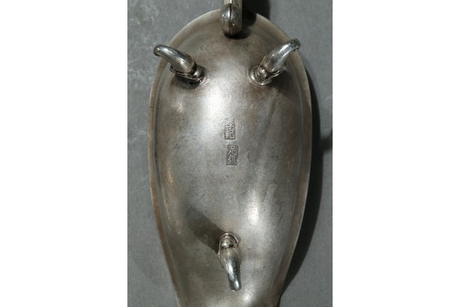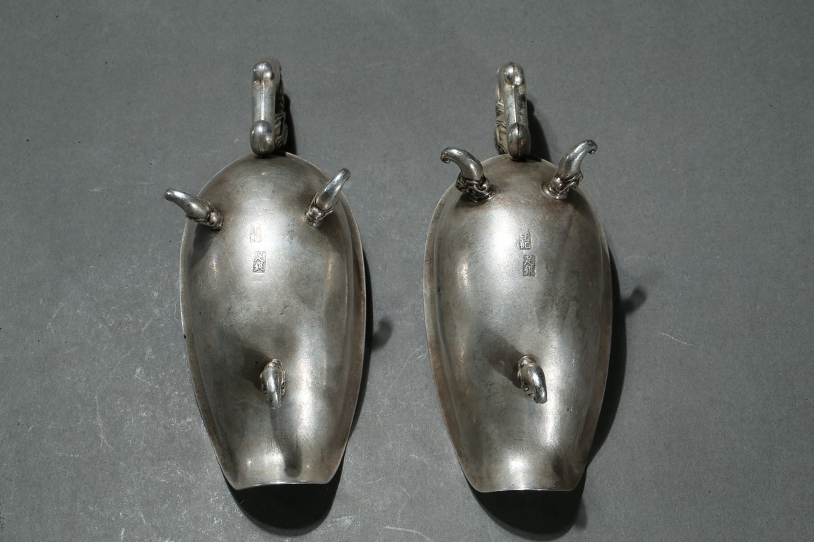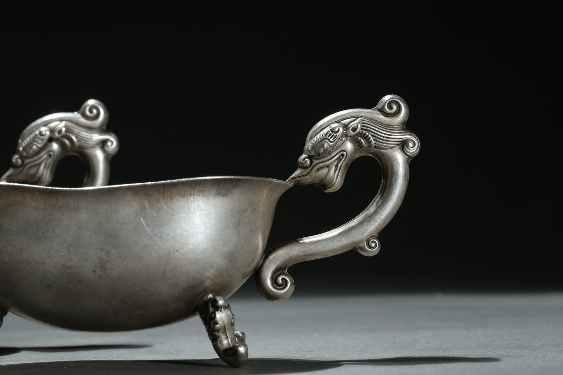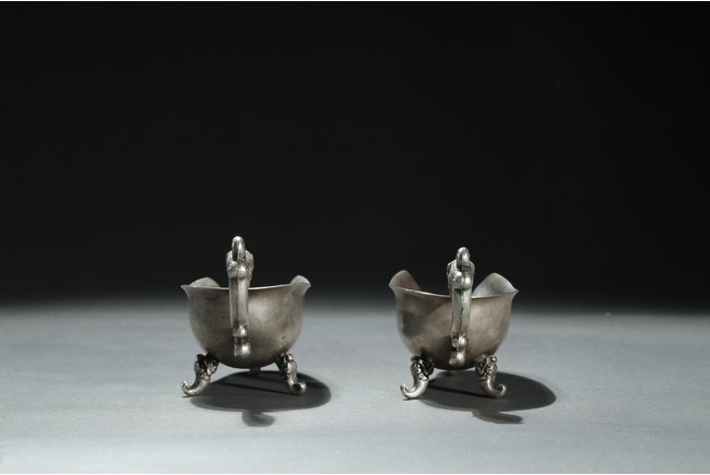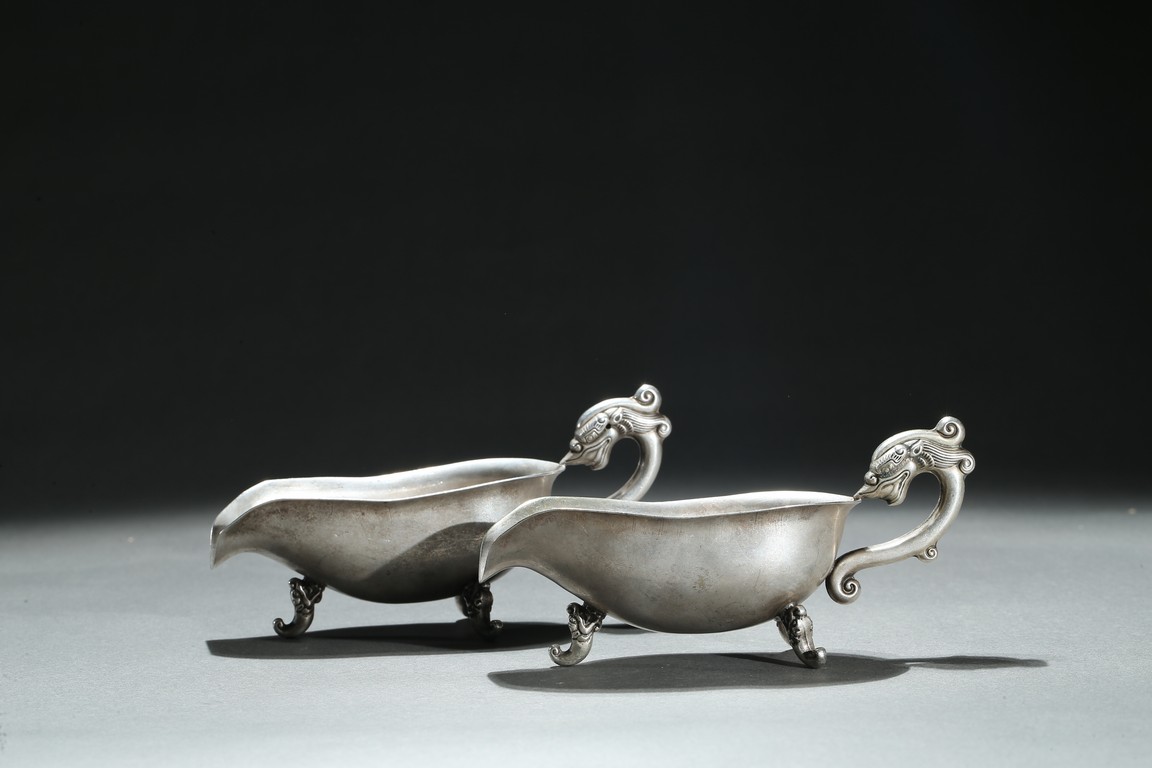 Each with widely flaring rim and spout,the side with a curved handle in the form of dragon head,the cup supported by three animal mask foot,the base impressed with two marks 'Li Ji' and ' Zu Yin'. Late Qing Dynasty period.