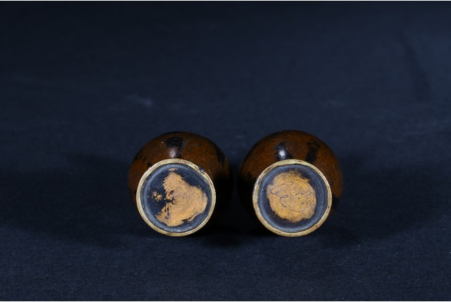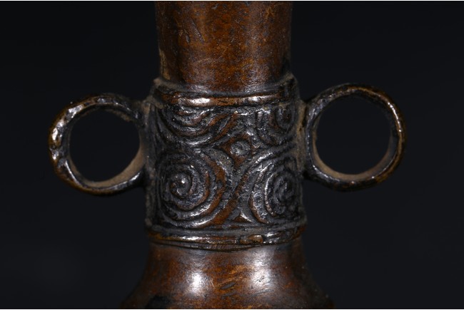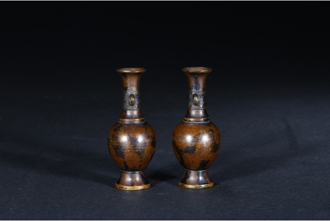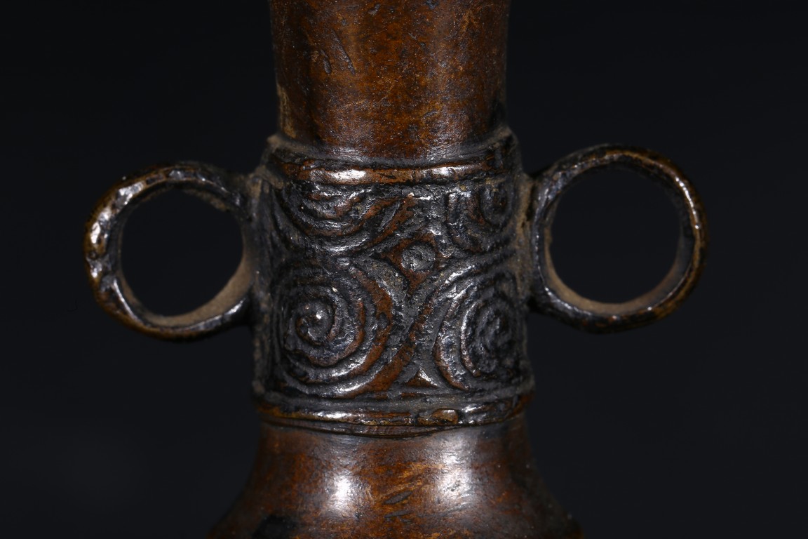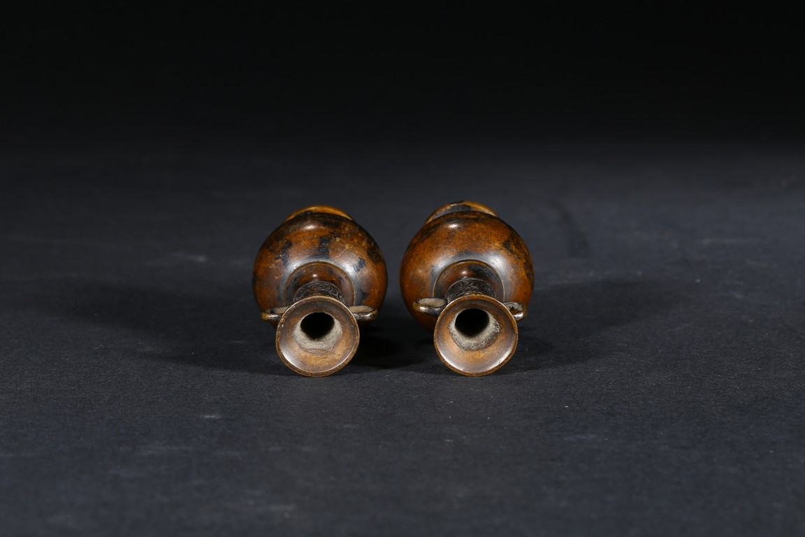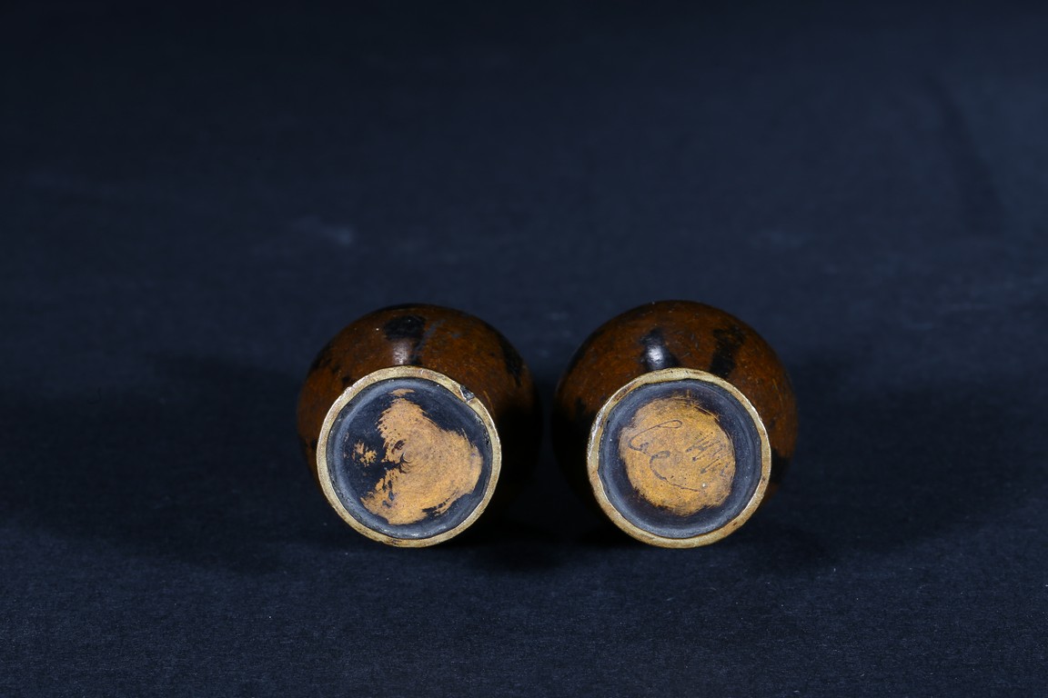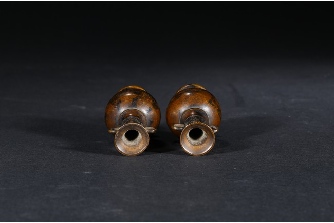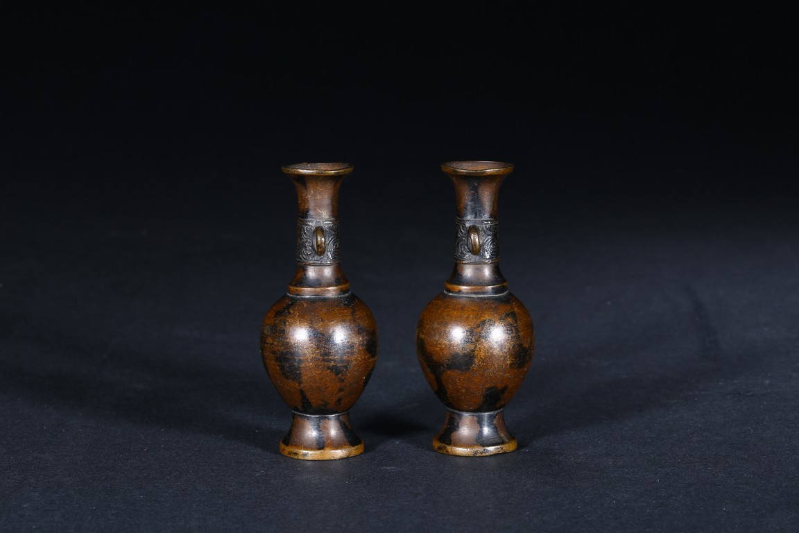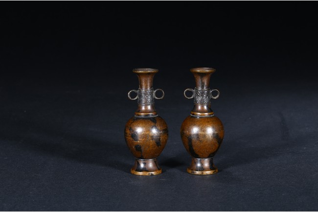 Each of bulbous form,neck flanked by circular handles,decorated with scrolled pattern. Qing Dynasty period.