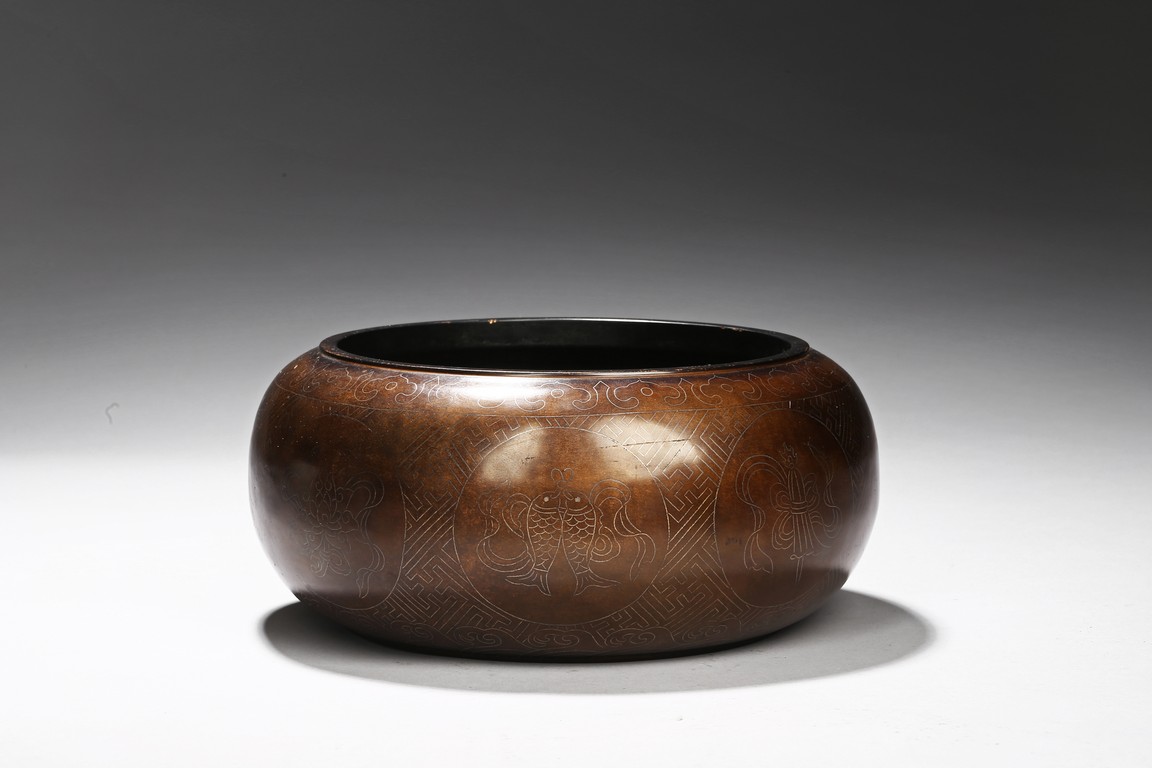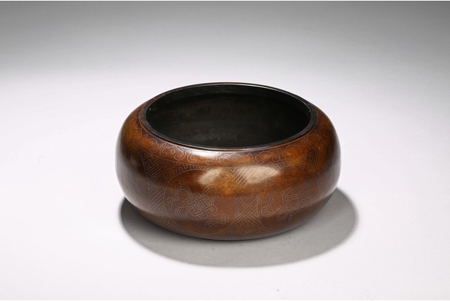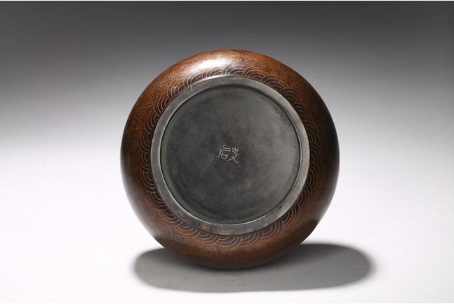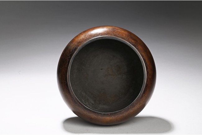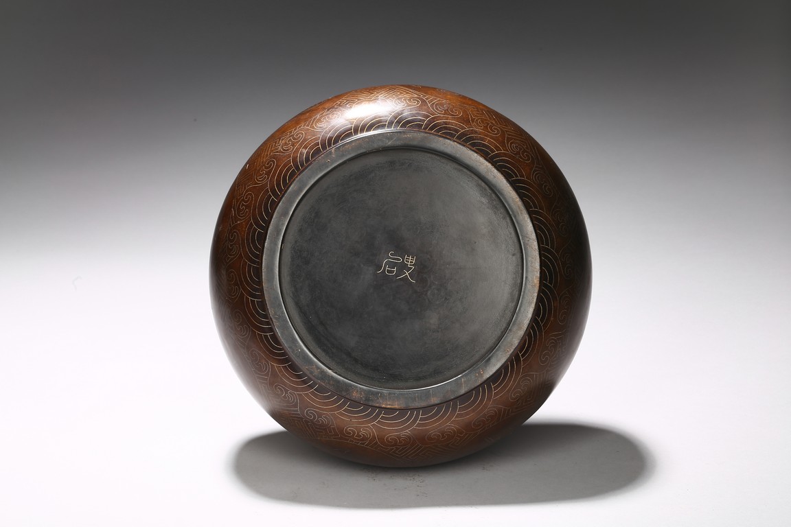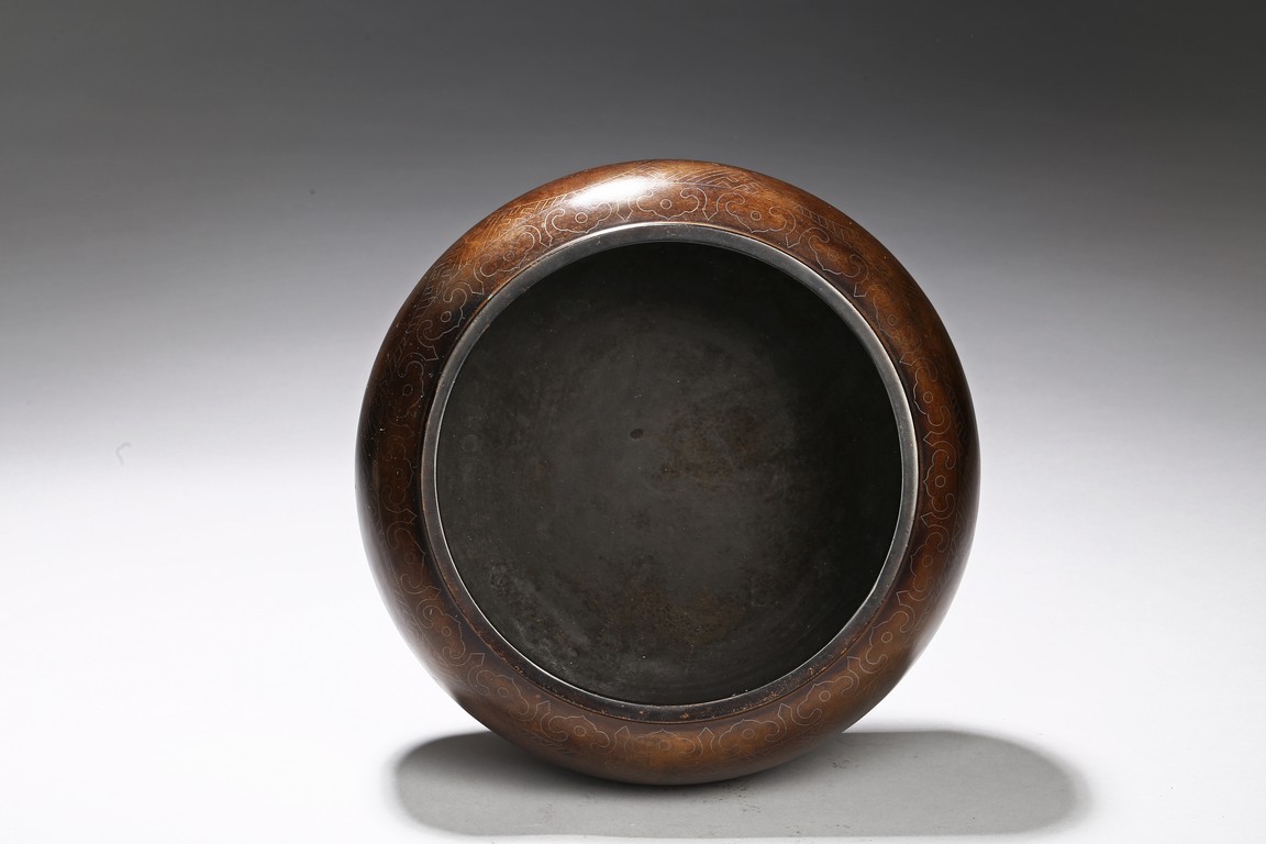 Of compressed globular form, the body inlaid with silver wire around the exterior the eight auspicious emblems enclosed in medallion, the base with two character shi sou mark. Qing Dynasty period.