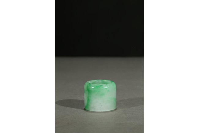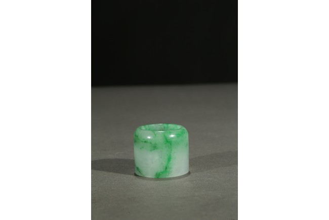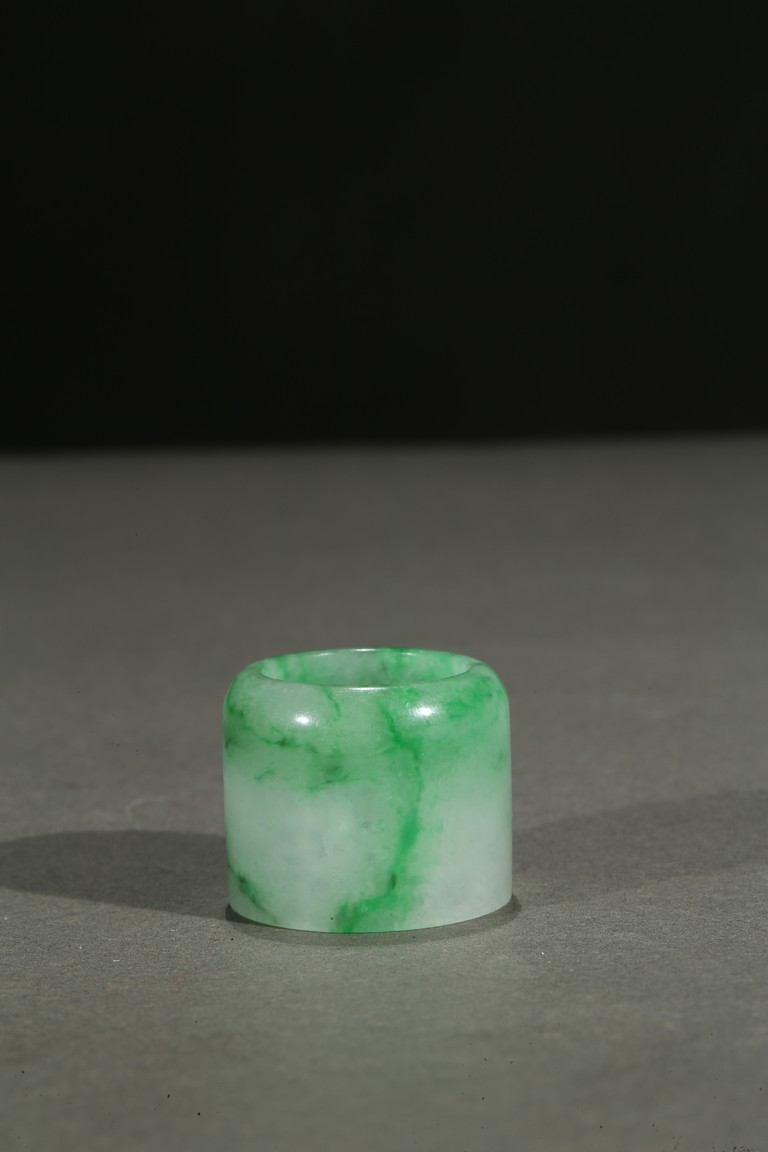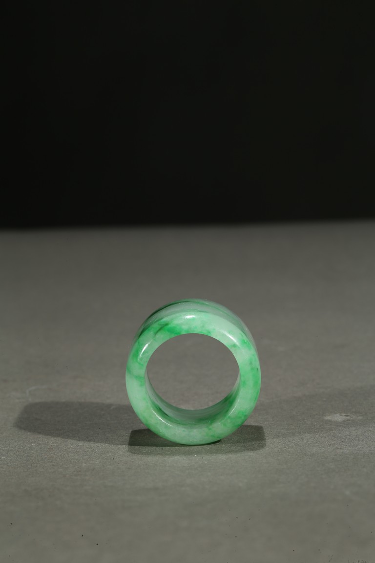 The ring with sides undecorated and with a soft polish,the translucent stone suffused with apple-green inclusions throughout. Late Qing Dynasty period.