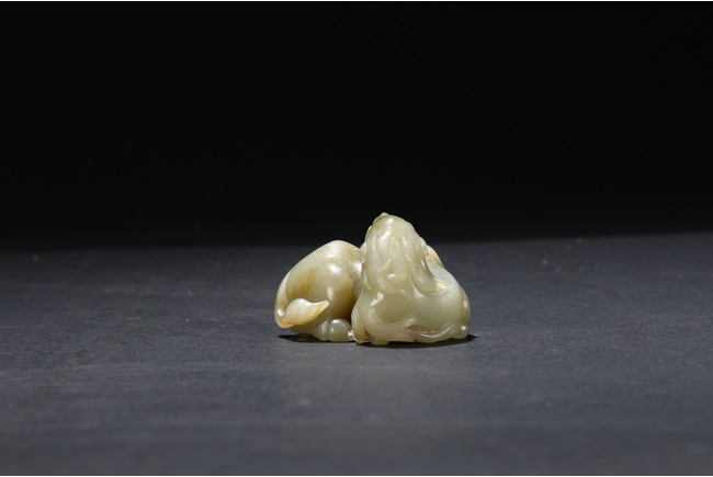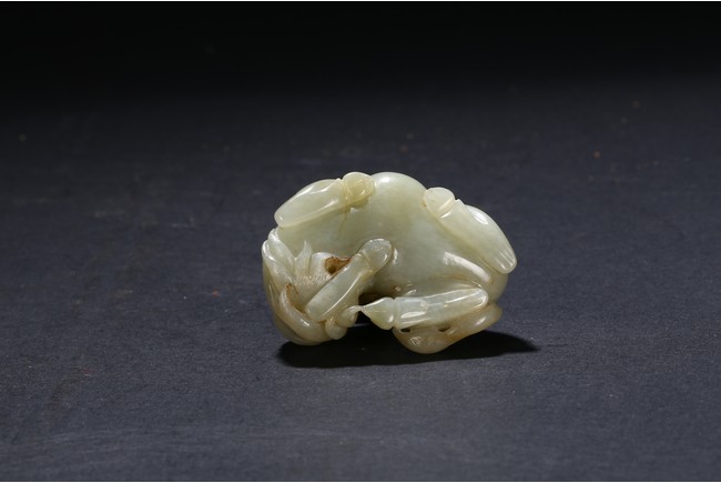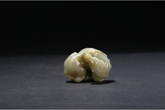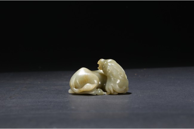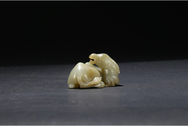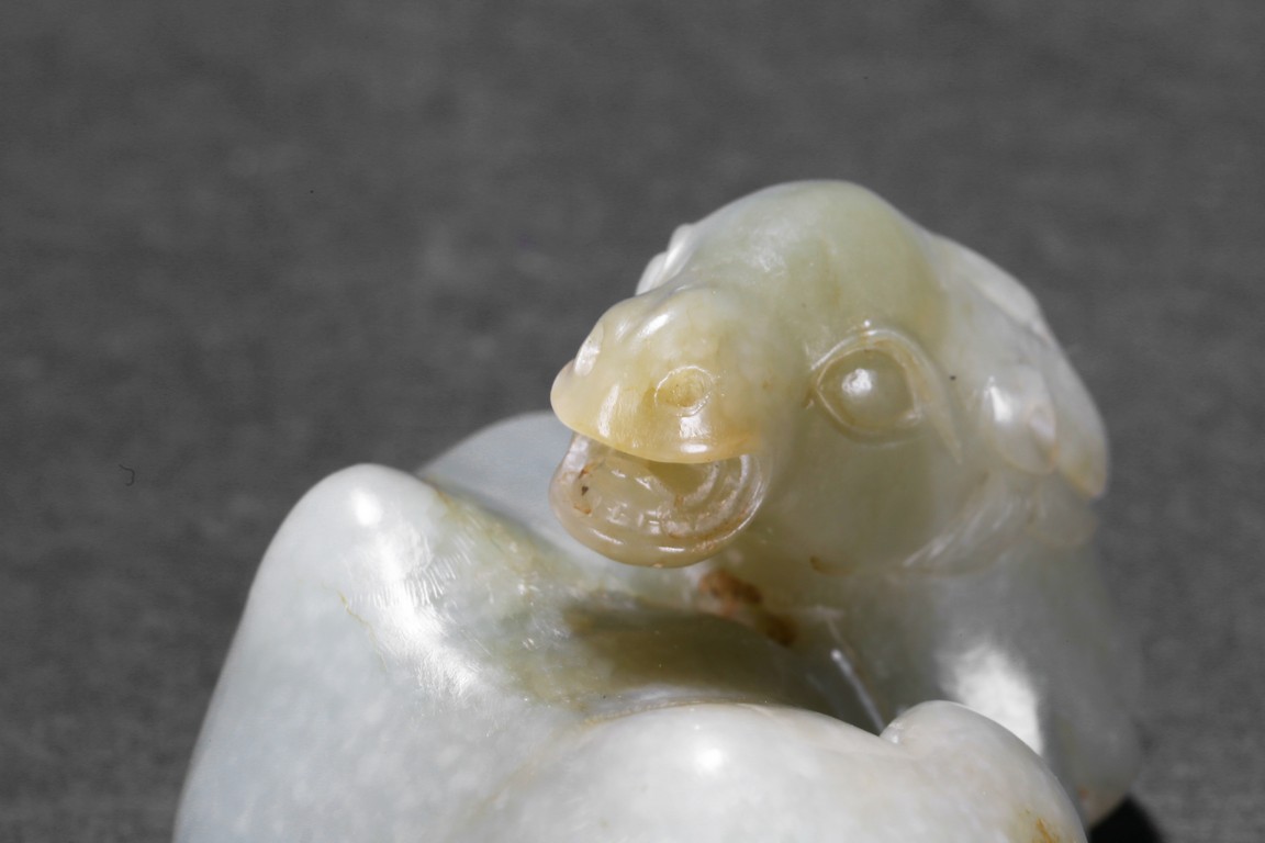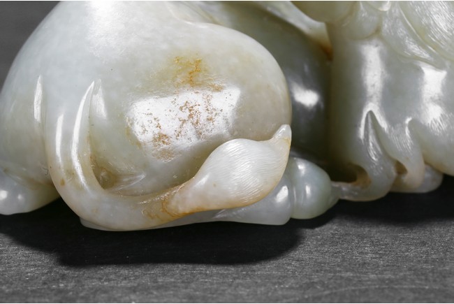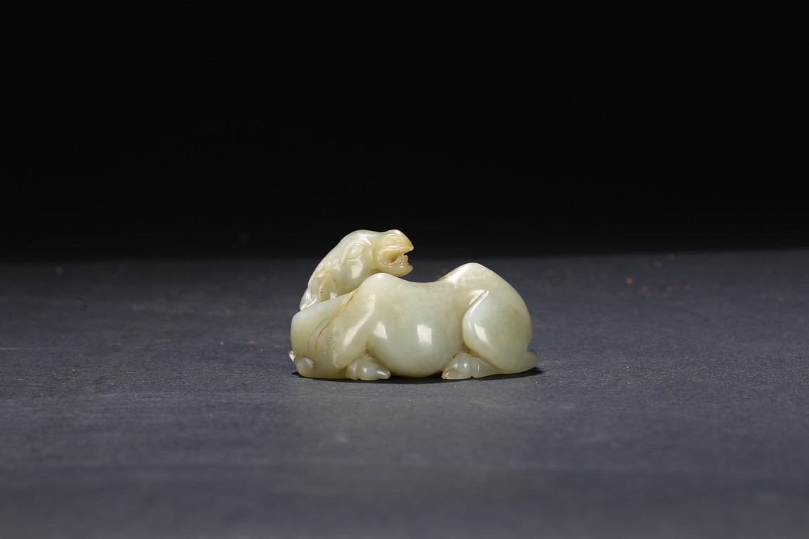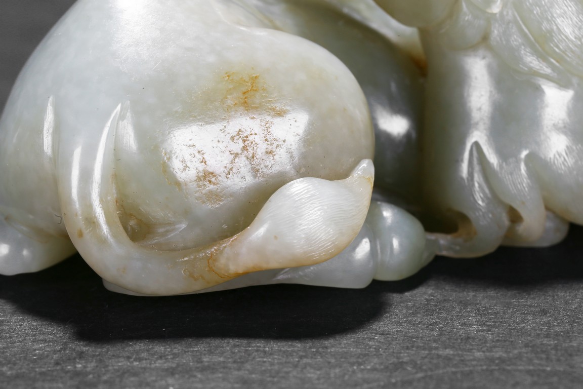The horse is carved seated with the feet tucked,turned head back to his body, mouth opened. The stone of celadon tone with russet inclusions.