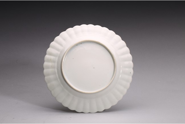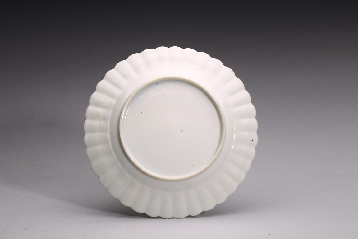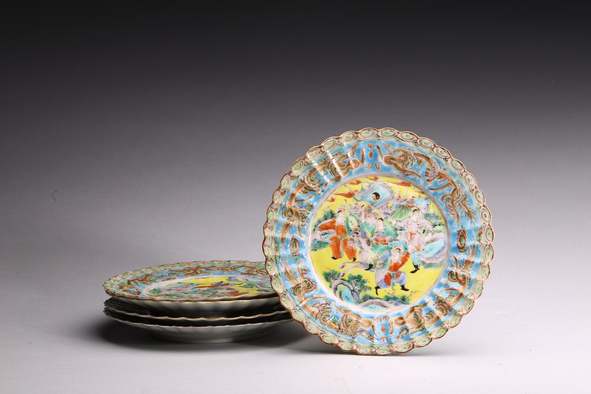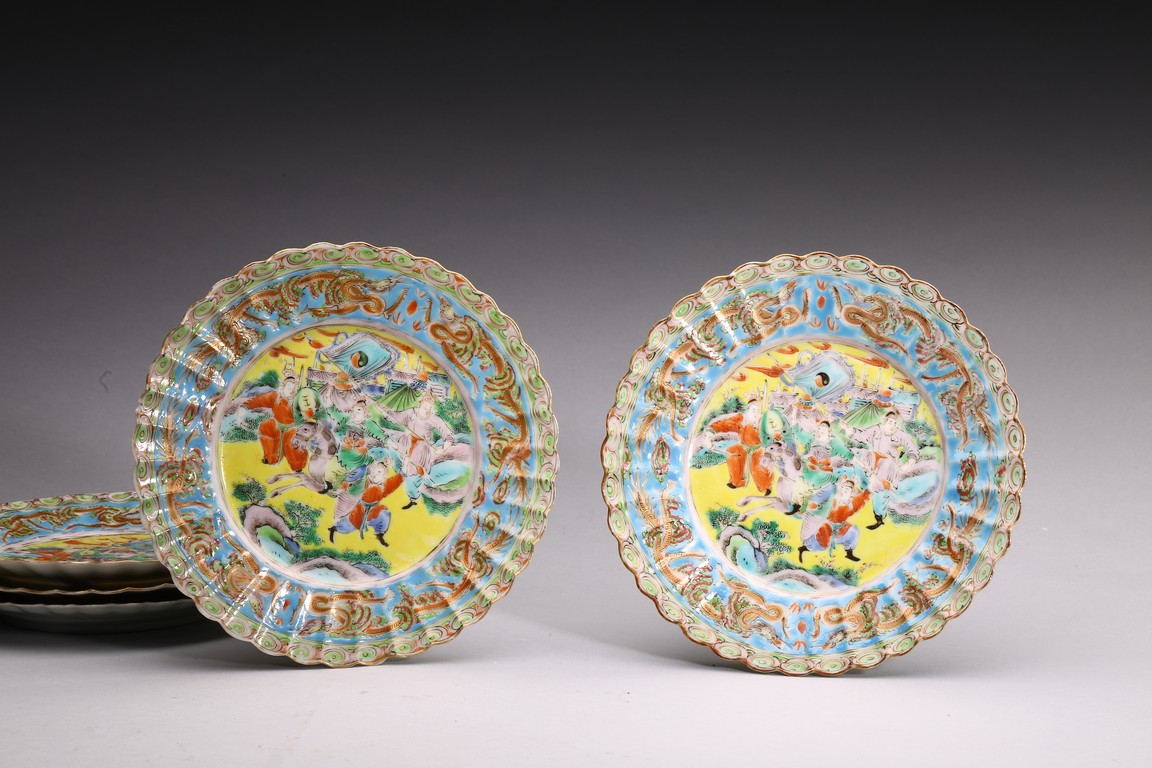 Each of the well potted chrysanthemum dishes painted with a figural medallion in the center, and circled by two pairs of dragons pursuing the sacred pearls. Qing Dynasty period.