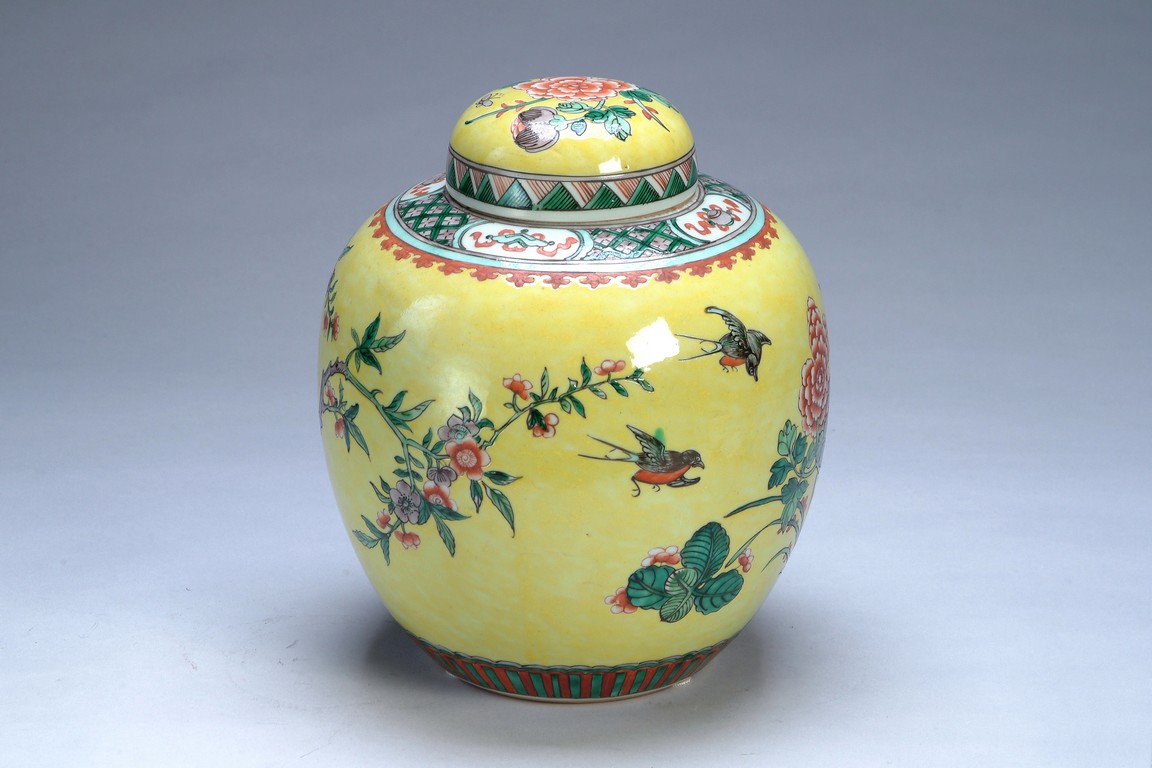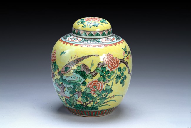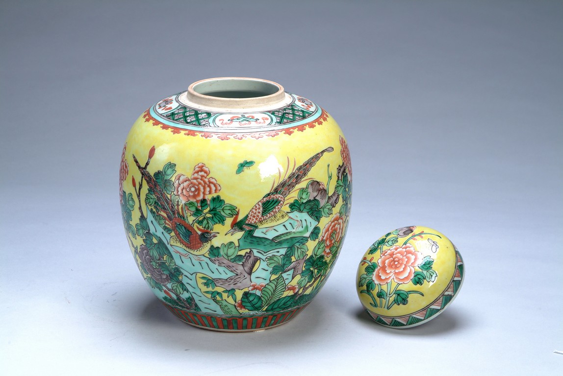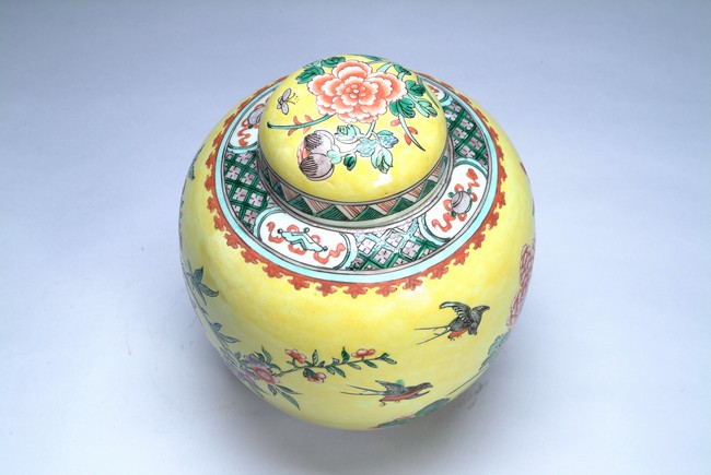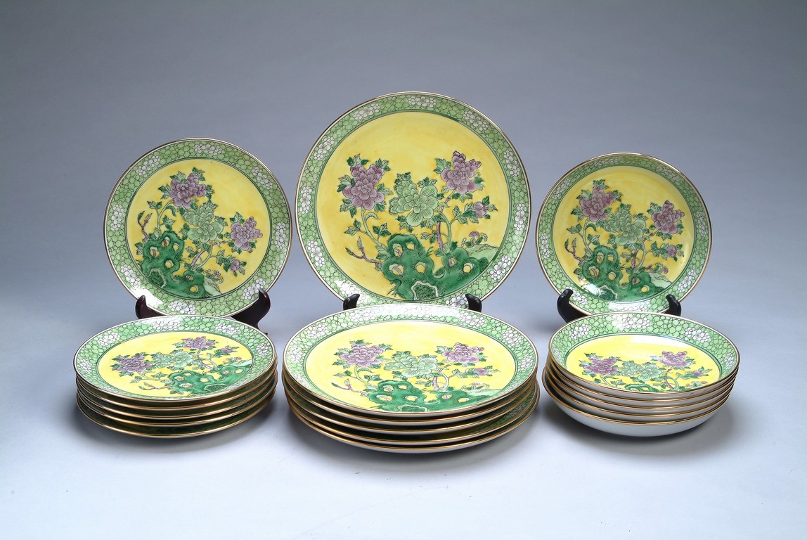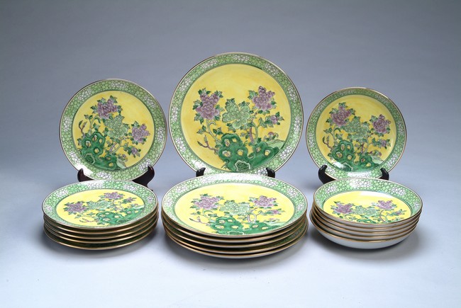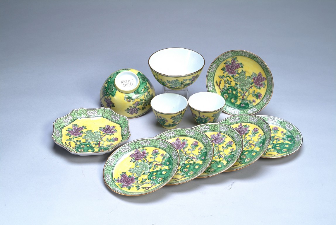 This dinnerware set includes one jar with cover, two bowls, two cups, and twenty-five dishes; all decorated with yellow glaze, green flowery edge patterns, and flowers in the center; mark of 'KREISS CHINA' at bottom. The jar features short neck, globular body, and flat base. Republic period.
