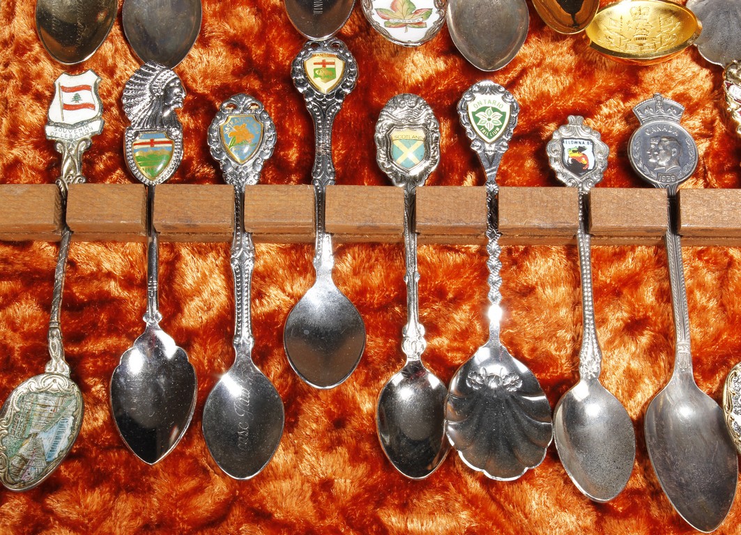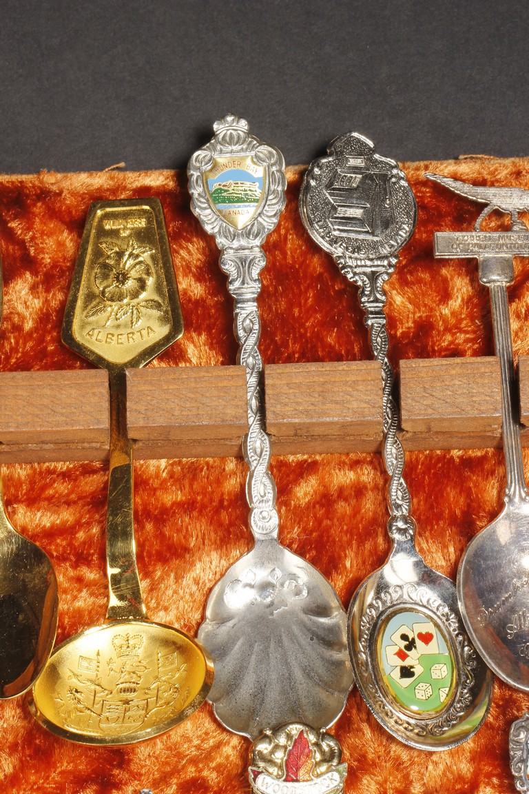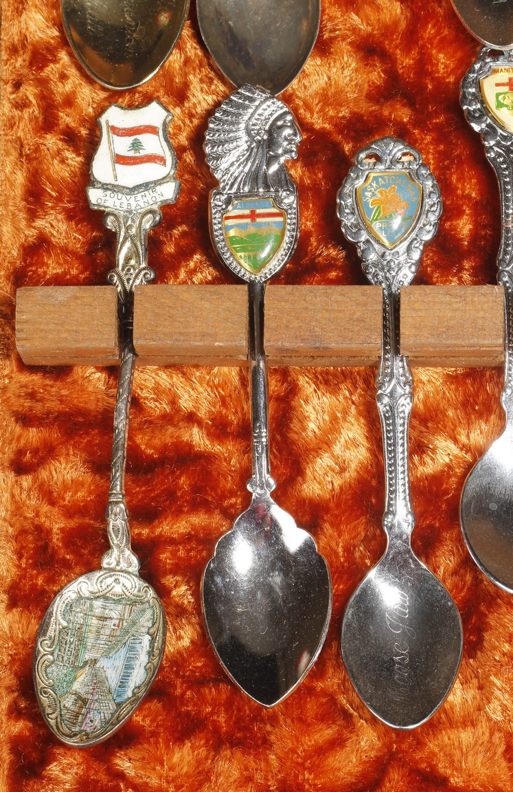 This box contains a set of silver spoons, each with different size, shape, and design theme. Majority of these spoons of the Canadian origin.