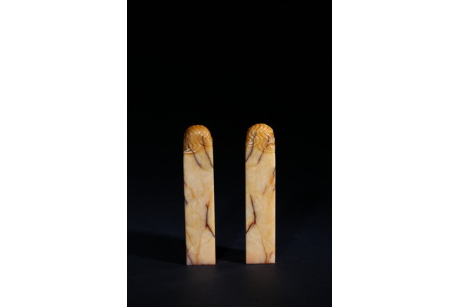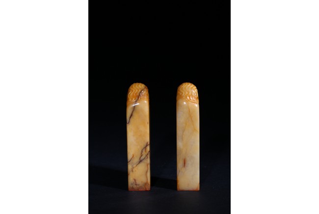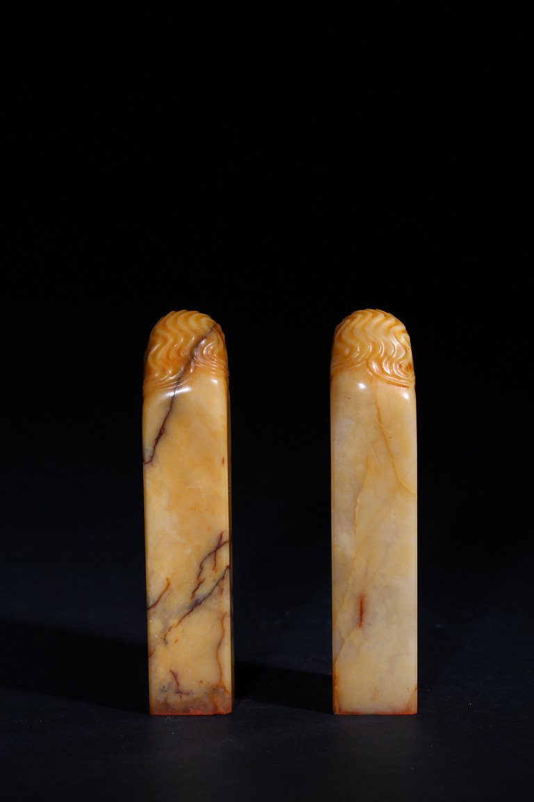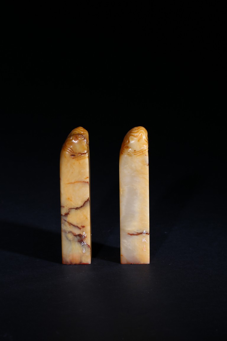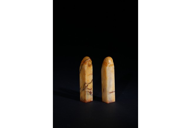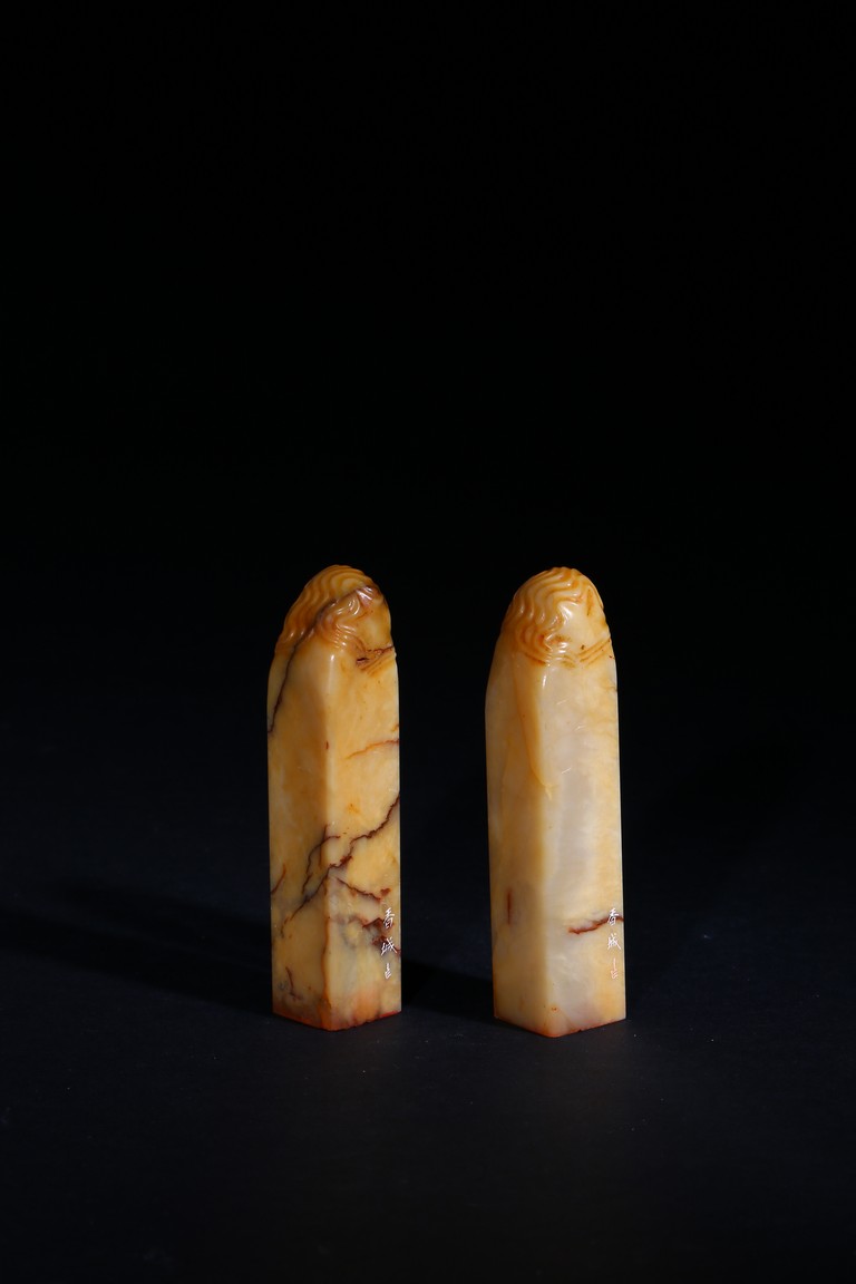 Each of square section with an irregularly shaped top carved with cloud pattern, inscribed to the lower side with three character mark, seal face carved with two and four characters respectively. Qing Dynasty period.