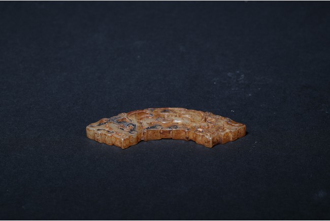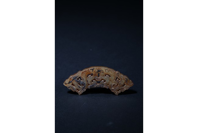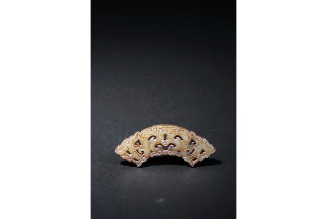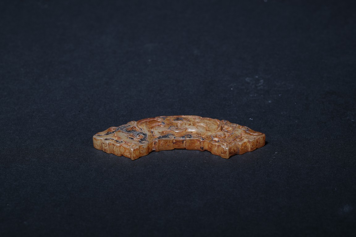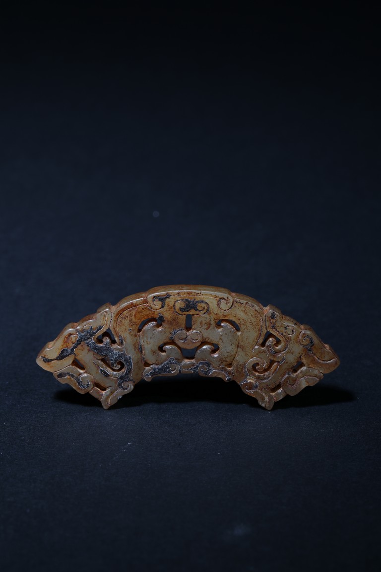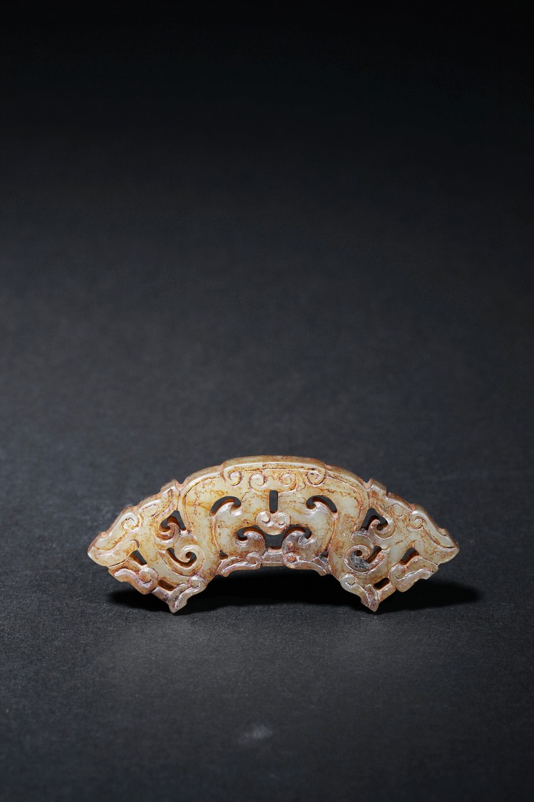 The arc-shaped pendant finely carved on both sides with a central taotie mask flanked by pair of dragon heads,divided by the fluted ribs,the stone of yellowish-green color with areas of dark brown and russet inclusion. Warring State period.