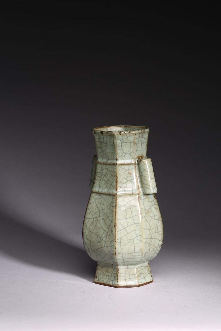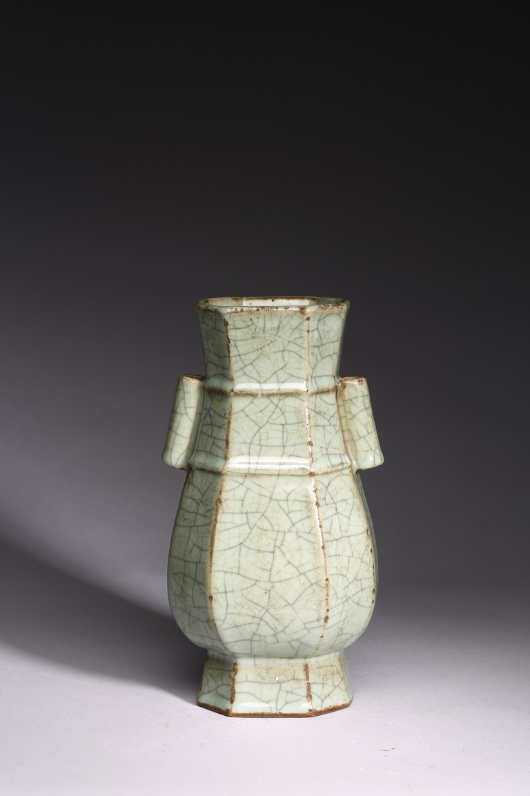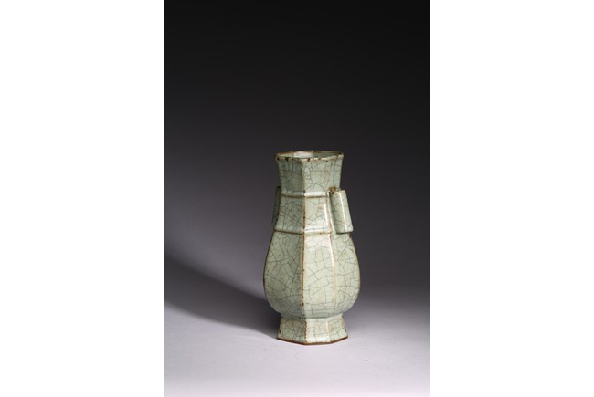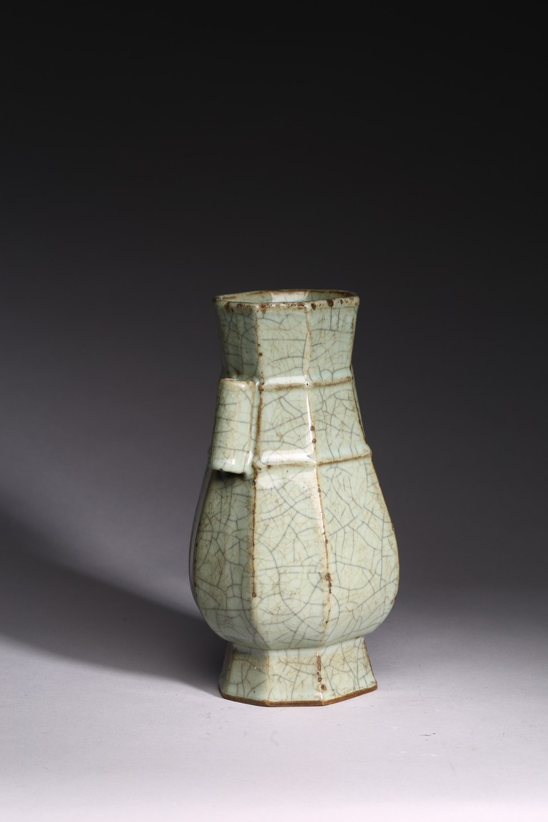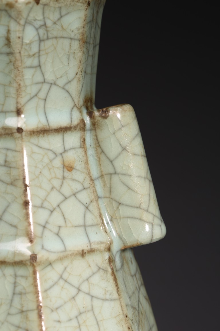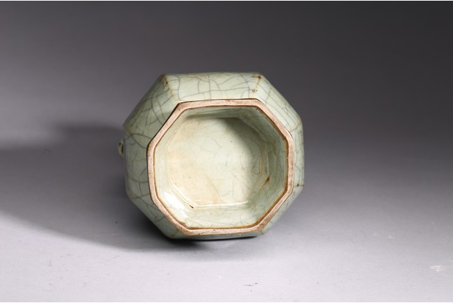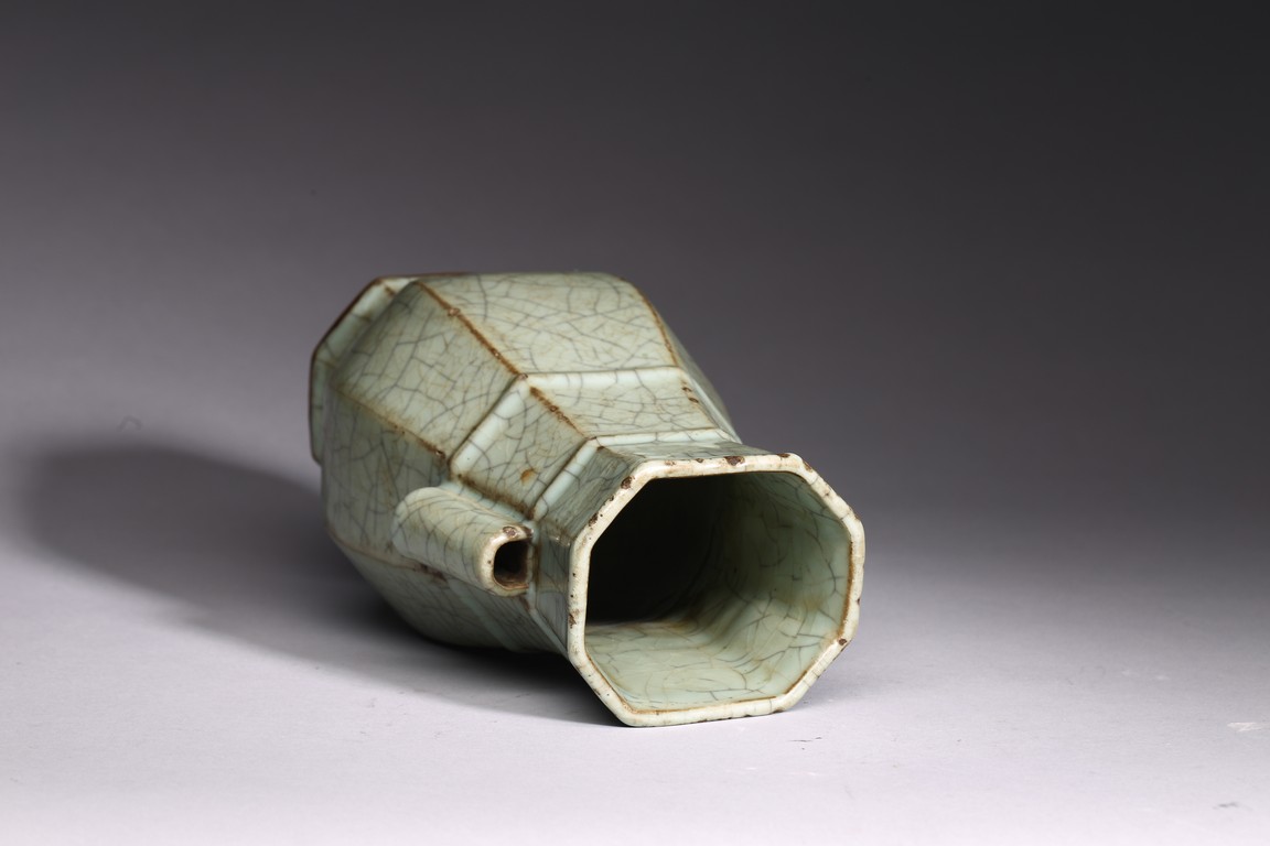 Of octangle form, framed with two handles on two sides of its neck, suffusing irregular crackle pattern on celadon glaze ground.