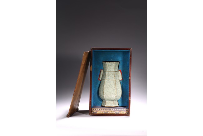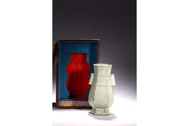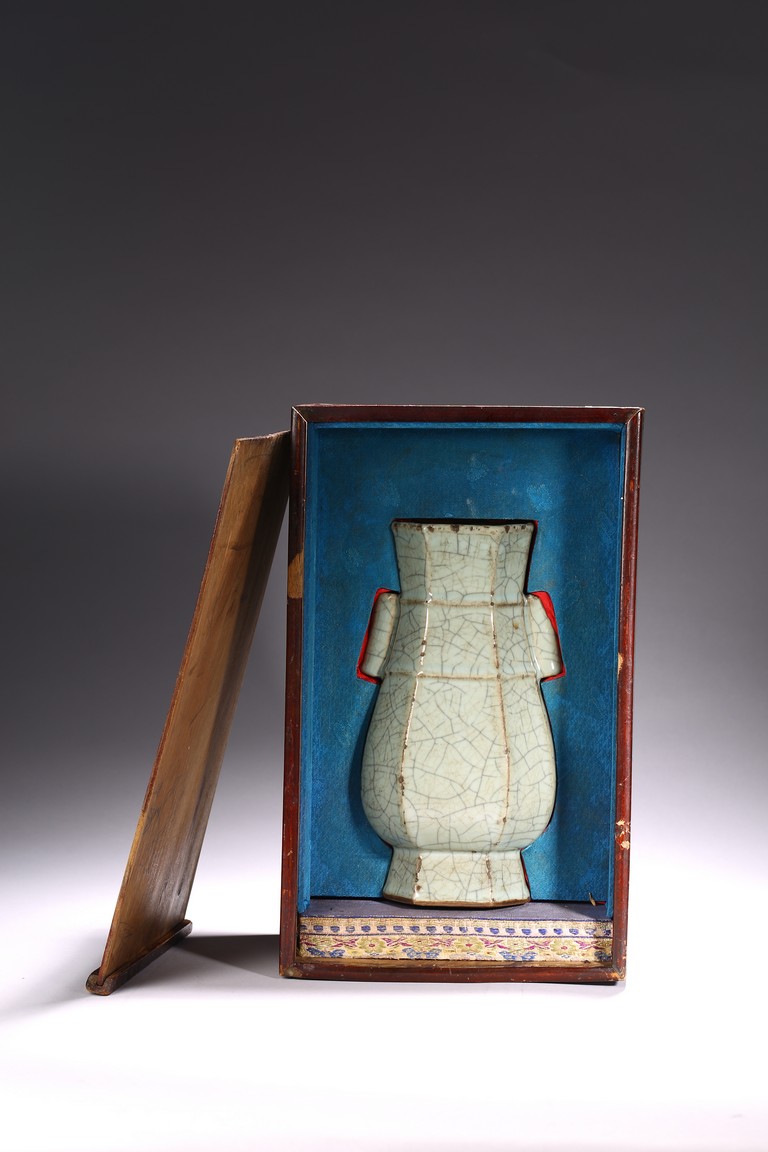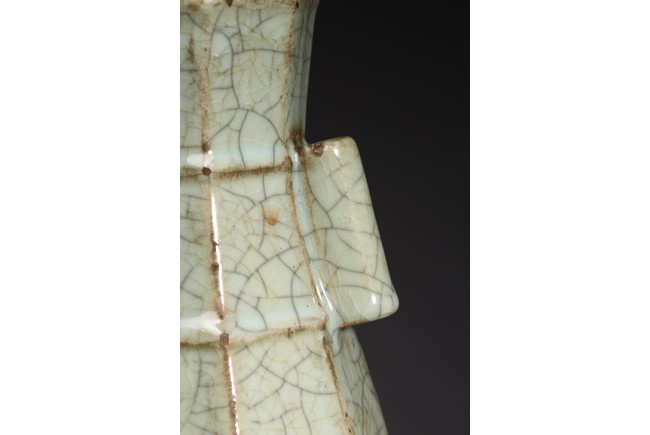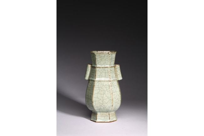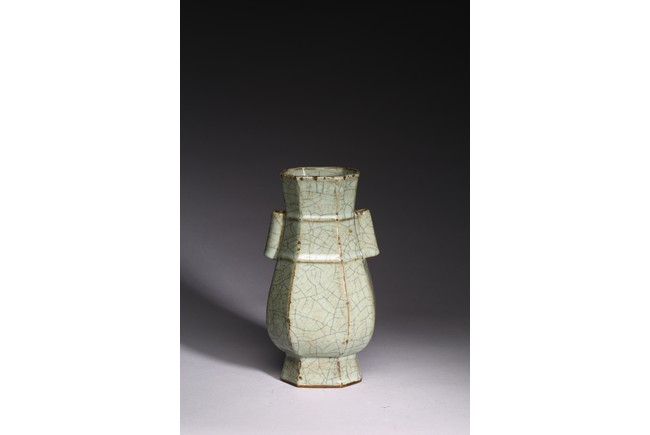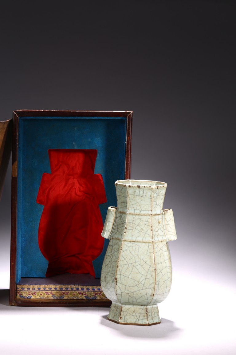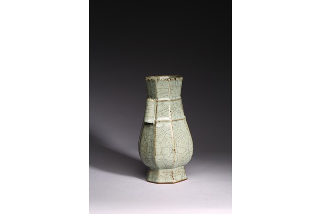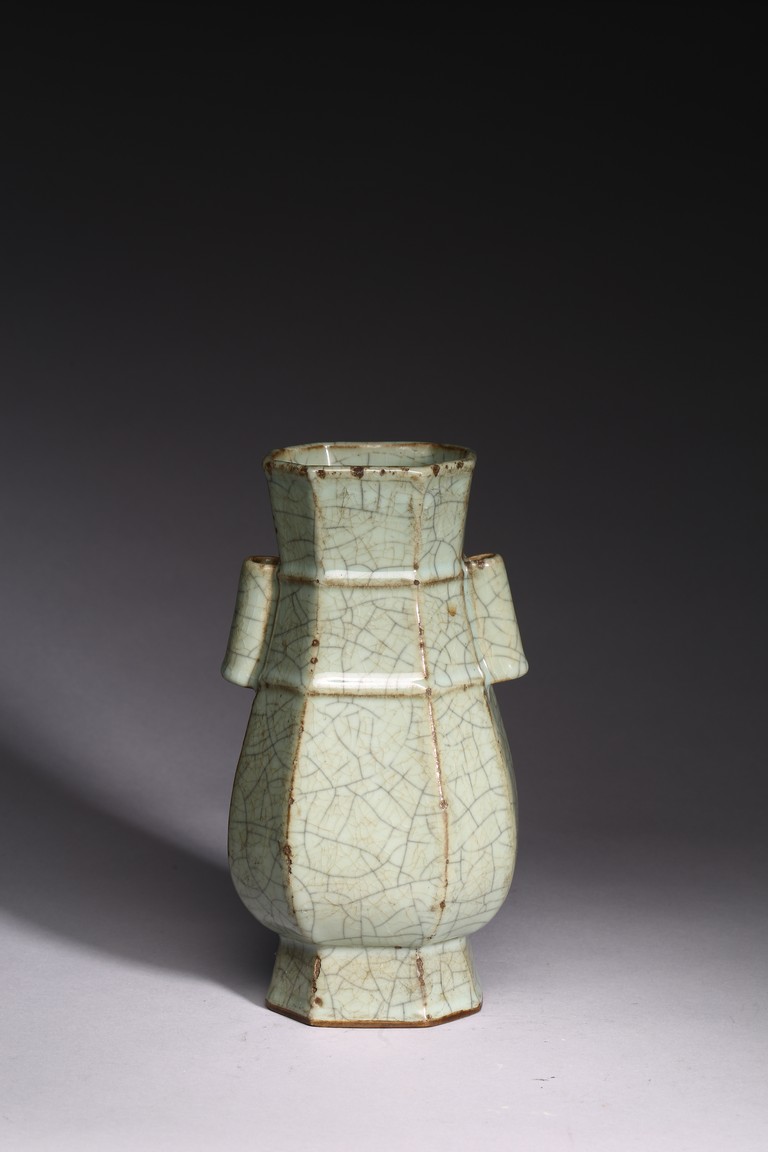 Of octangle form, framed with two handles on two sides of its neck, suffusing irregular crackle pattern on celadon glaze ground.