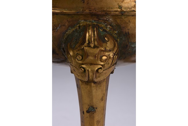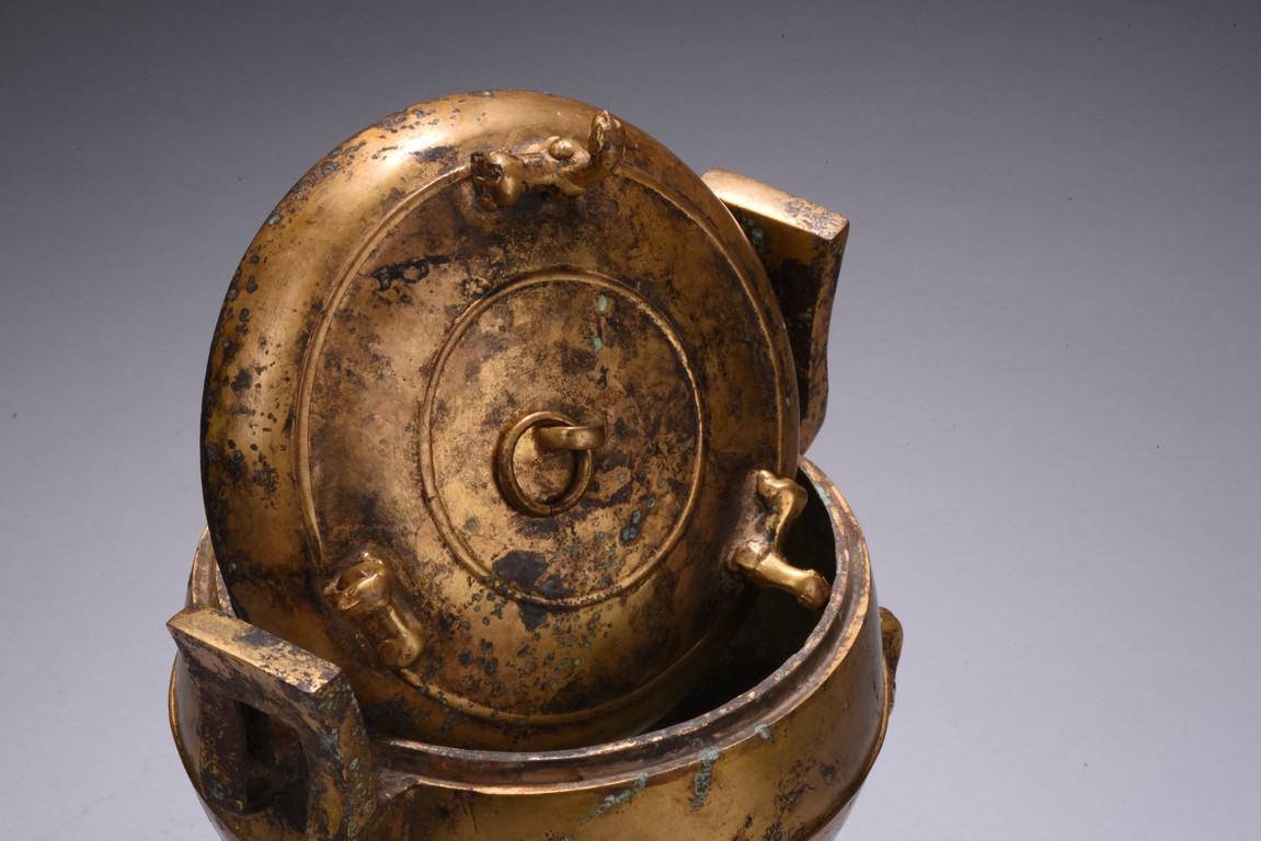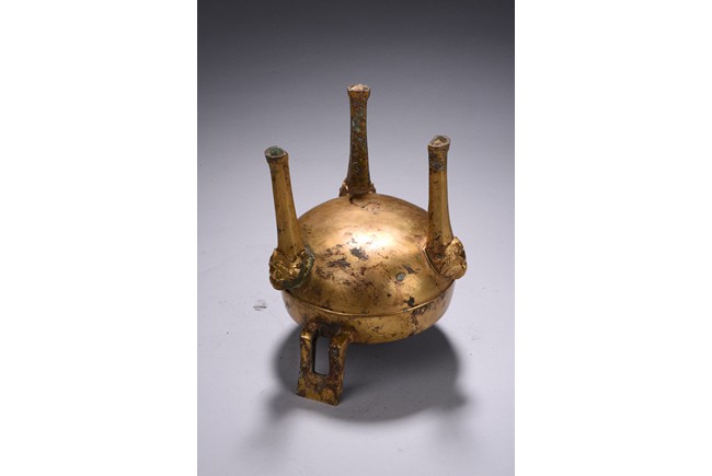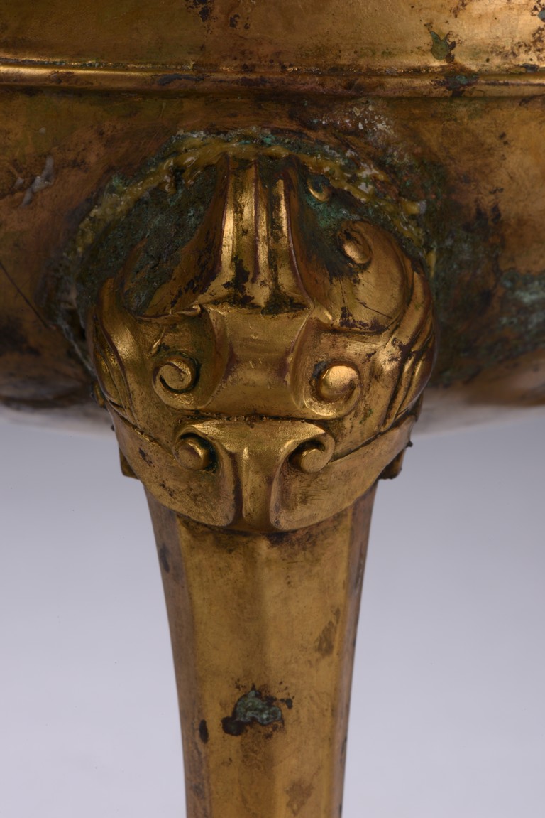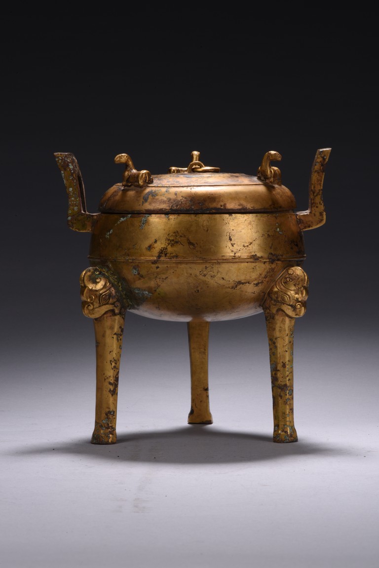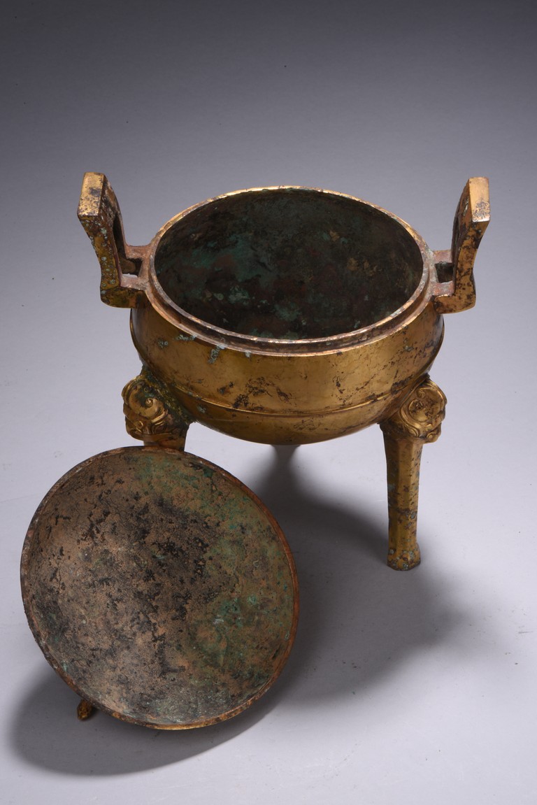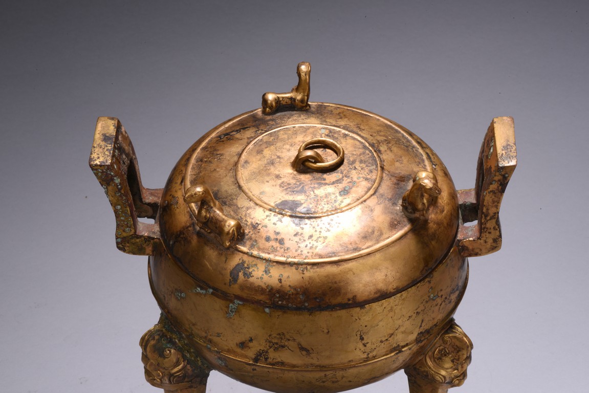 Of compressed globular form,supported on three long feet from beast masks,the body flanked by two arched upright handles,the cover further surmounted with three seated deer,overall covered in gilt. Qing Dynasty period.