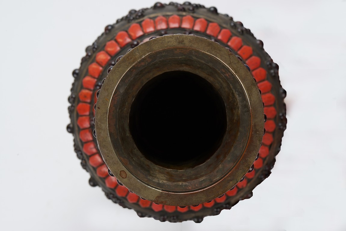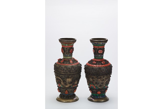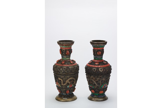 Each supported on spreading feet, the body with two raised dragon chasing a flaming pearl in repousse relief, overall embellished with coral, amber, turquoise, lapis lazuli in the form of beads, lappet, and figural carving. Qing Dynasty period.