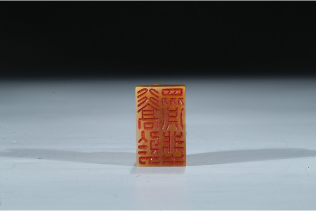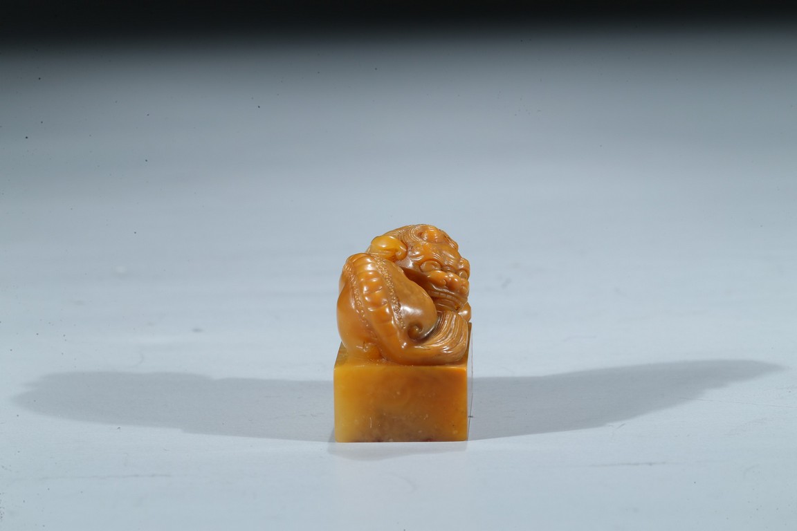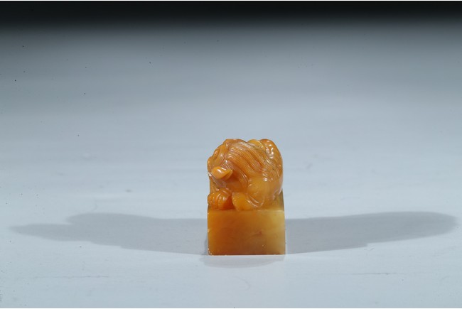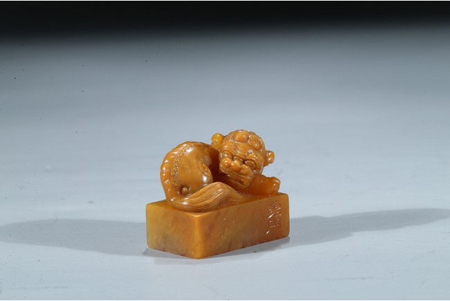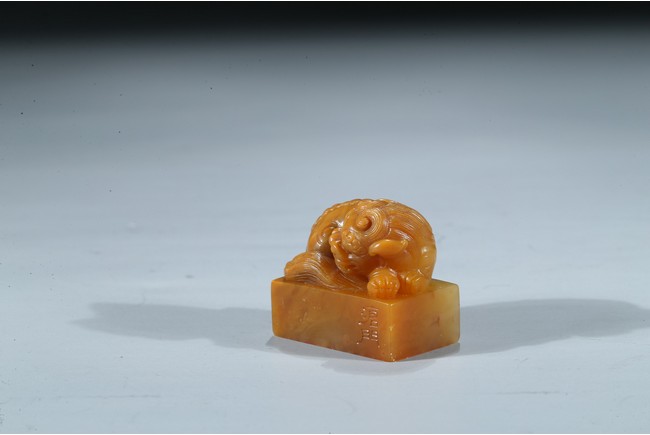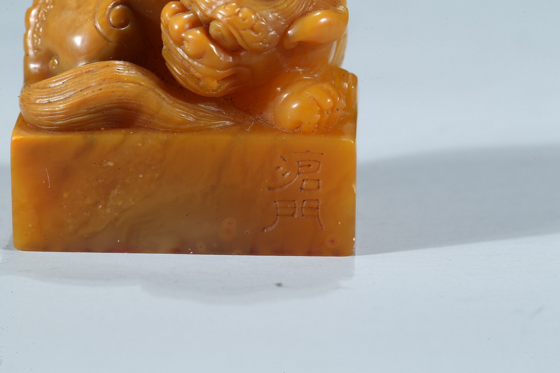 Of rectangular section, the side inscribed with two character 'Cang Men', the top surmounted with a recumbent lion with head turned to the side, the mane and tail highly detailed with incised lines. Qing Dynasty period.