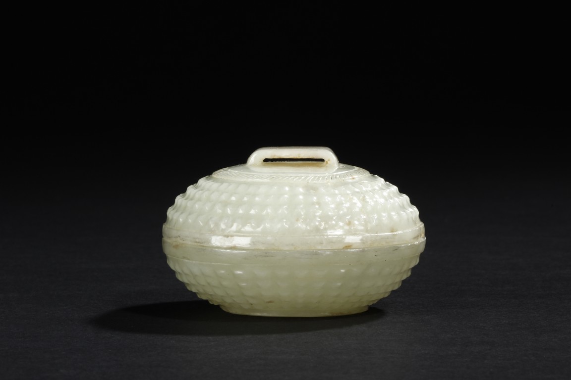 Of compressed globular form the exterior covered with bumped rectangular patterns, the finial in the form of a low and wide bridge, the stone of celadon color with slight russet. Qing Dynasty period.