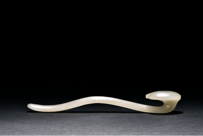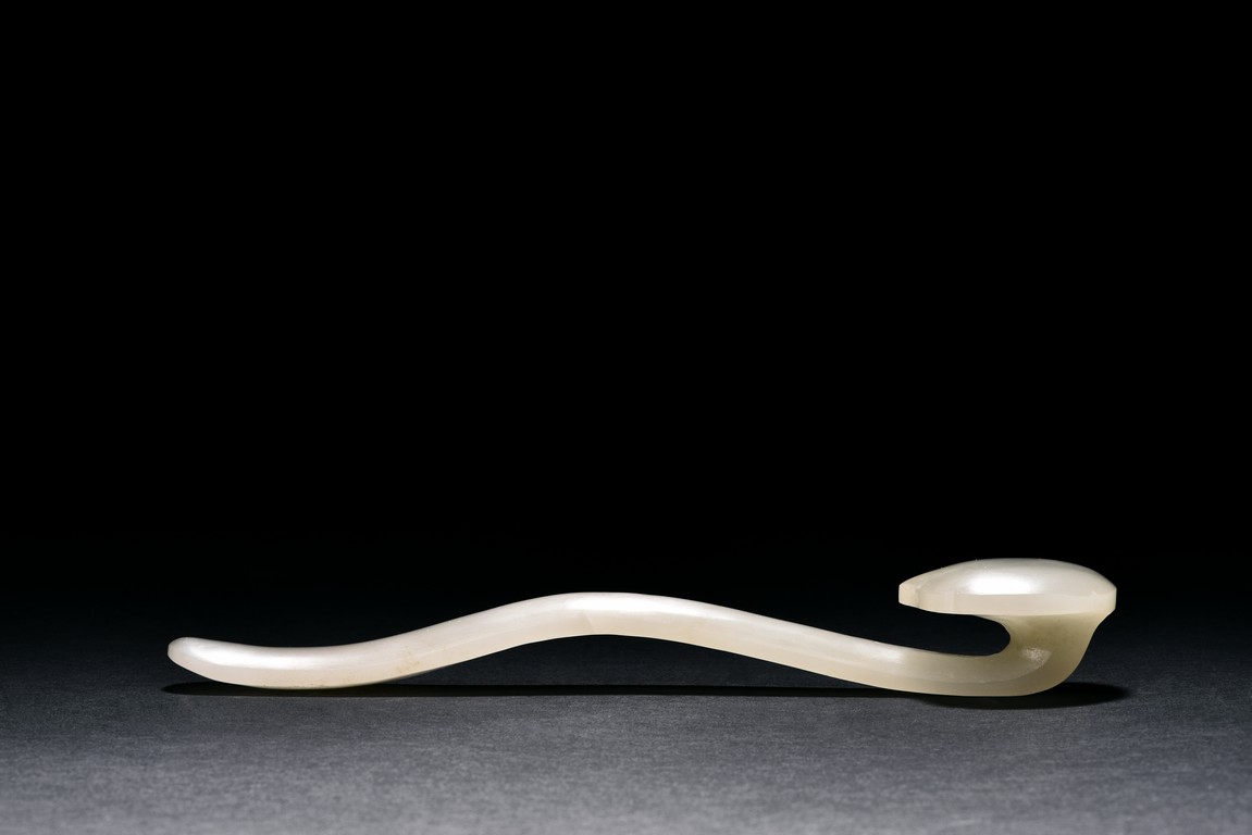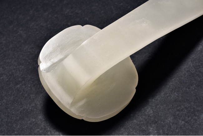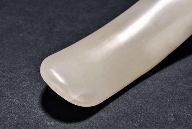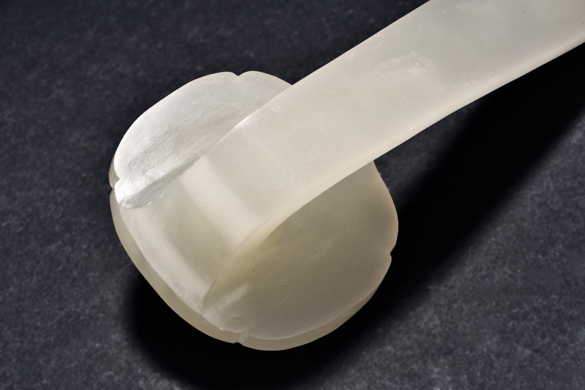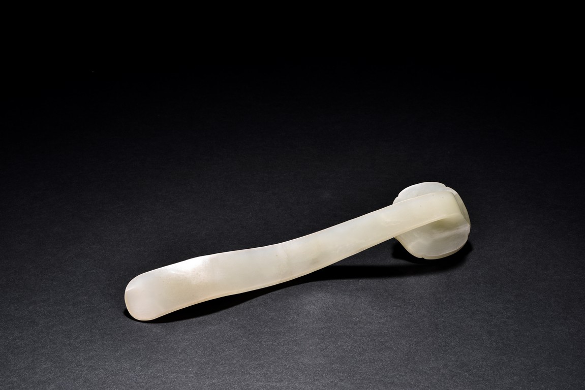 Of plain design, the ruyi scepter is carved with a ruyi-shaped terminal and an arched shaft. The stone is of smoothly polished, semi-translucent even white tone. Qing Dynasty period.