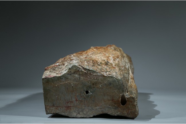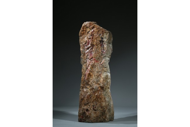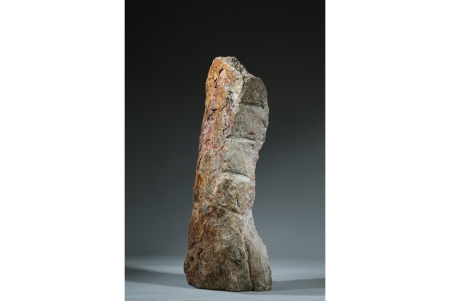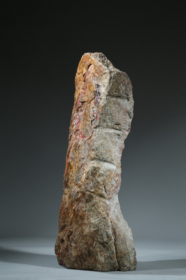 Of naturalistic irregular form, this rare large upright boulder with ochre tone skin exposed to reveal the inside bright red 'chicken-blood' inclusions. 'chicken-blood' is one of the most valued material in Chinese culture, and red is traditionally considered symbolic of good luck, soapstone of this color was gifted on occasions of marriage, birthdays, promotions and success.