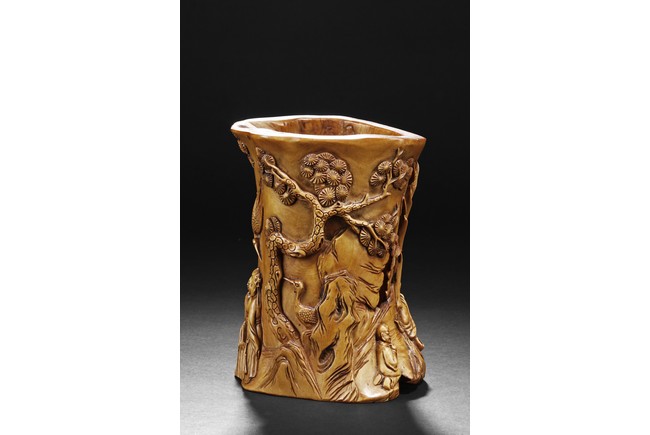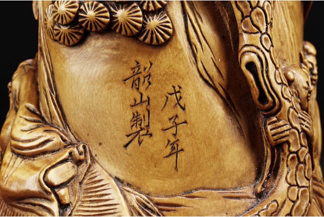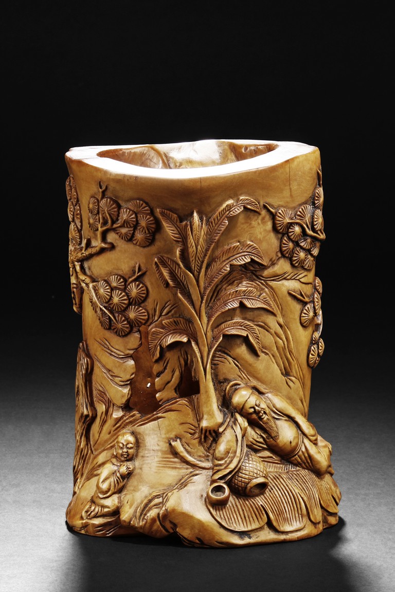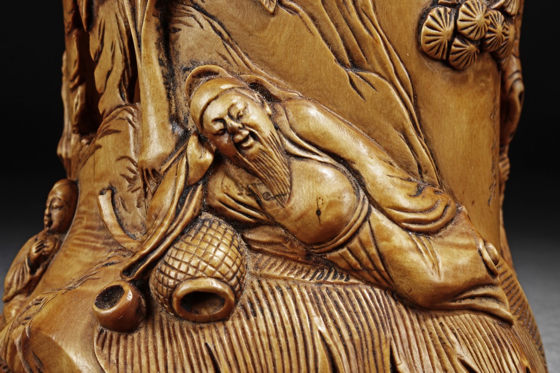 The exterior deeply carved in relief to depict a scholar wearing a loose robe pointing his finger up, asking a young child grabbing the pine trunk nearby, and further detailed with a crane in flight on the top; on the reverse it is carved to depict a reclining scholar under a banana tree on a daybed with a young attendant on the side. One side with inscription. Republic period.