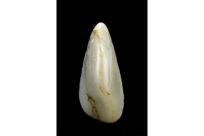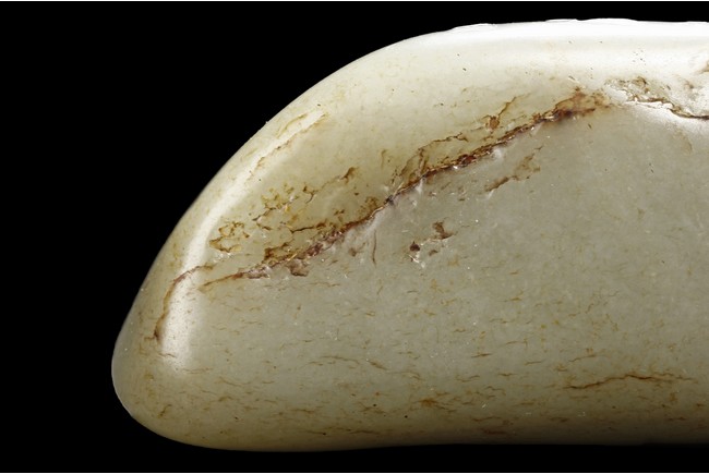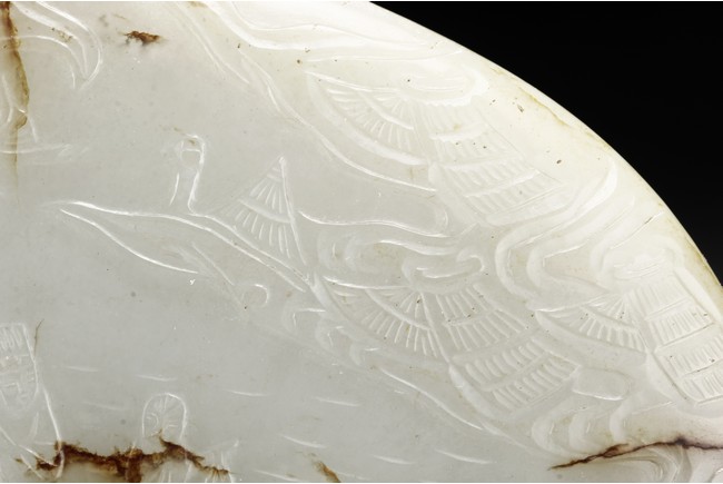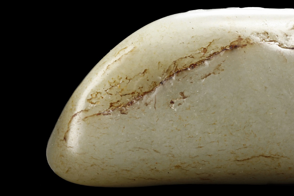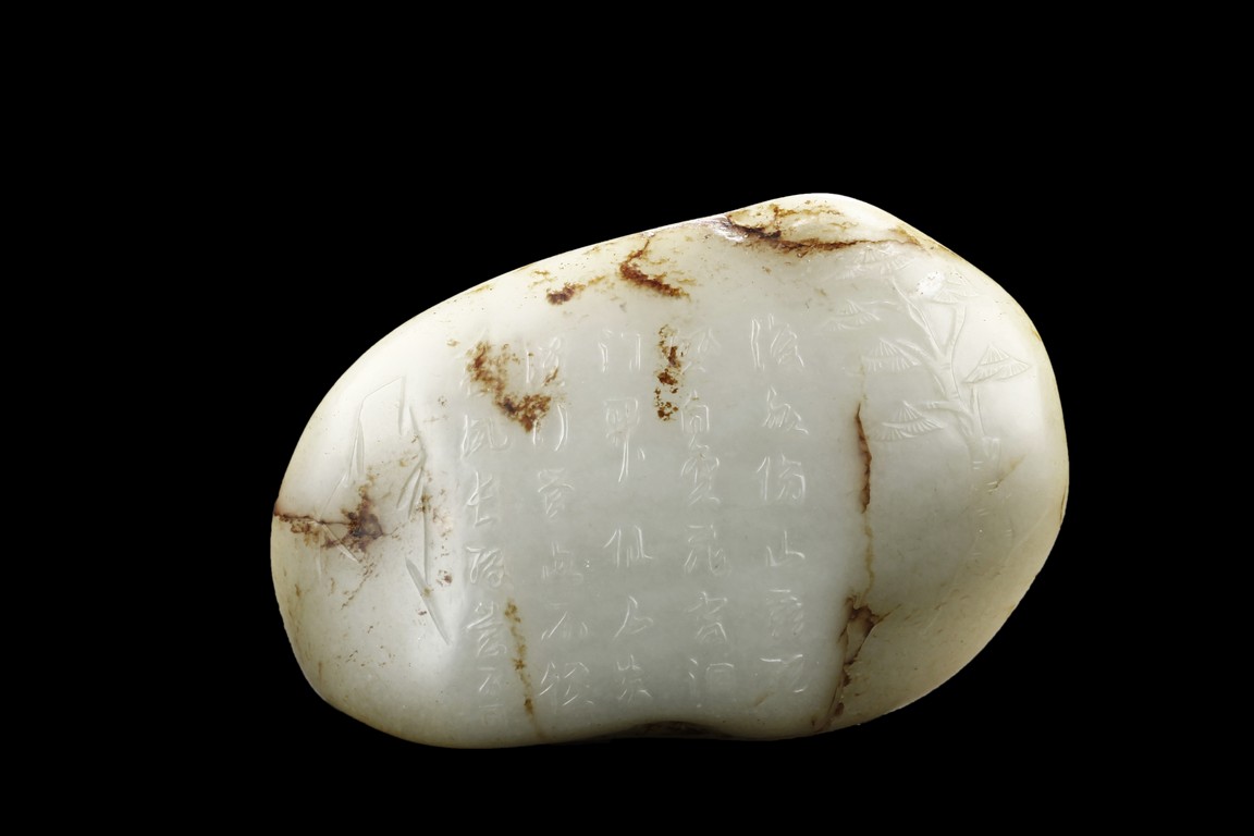 The decorative ornament boulder made from Hetian jade, carved on one side with elder and attendant crossing the bridge in a river scenery, the reverse carved with Chinese poetry, the Hetian jade stone of white color with occasional russet areas. Qing Dyna