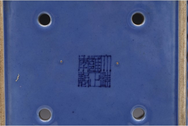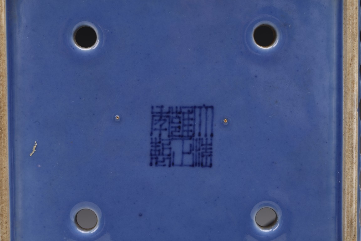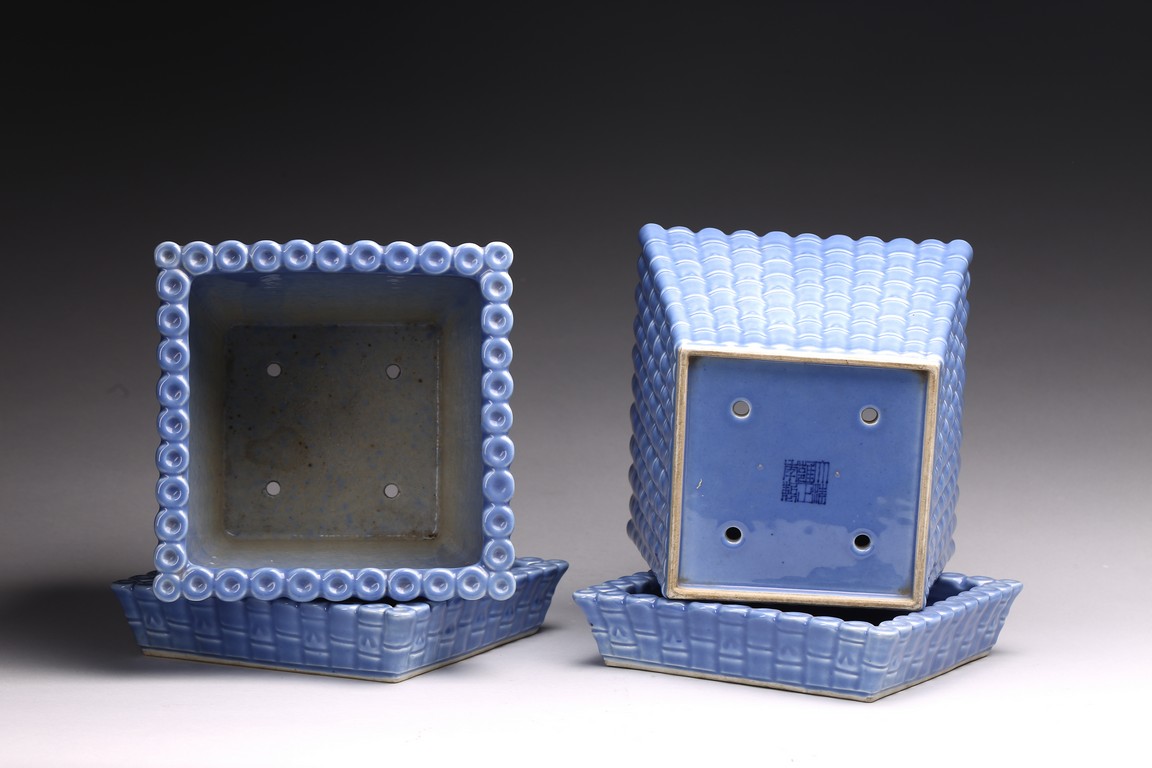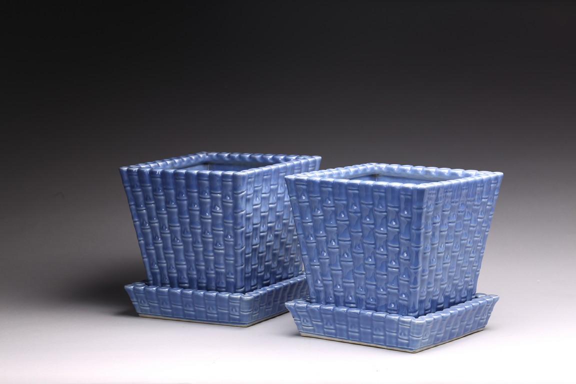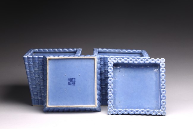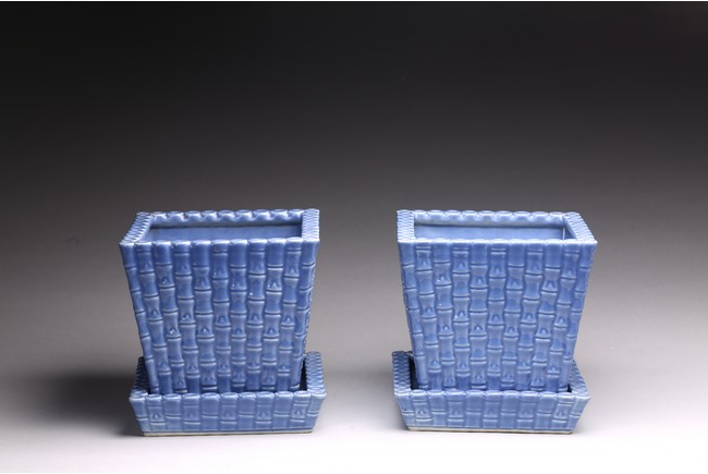 Of square form, modelled in the form of bamboo, all covered in blue tone glaze. Accompanied with two stands.