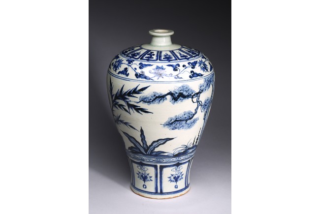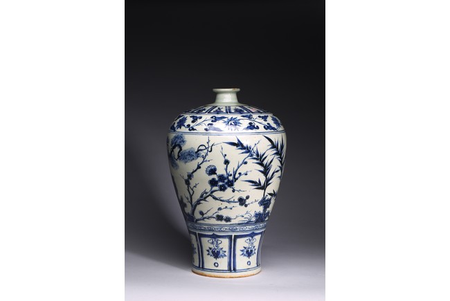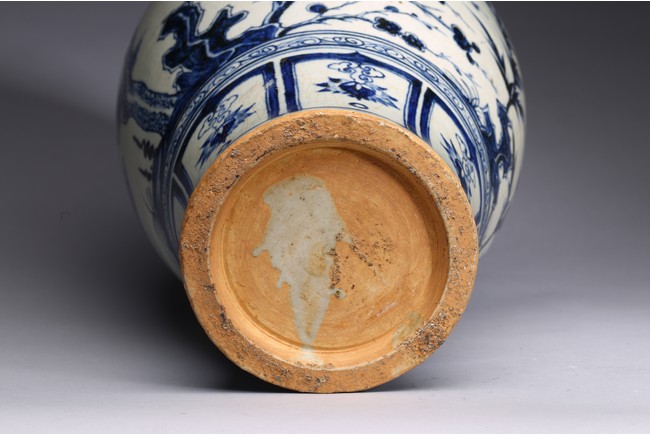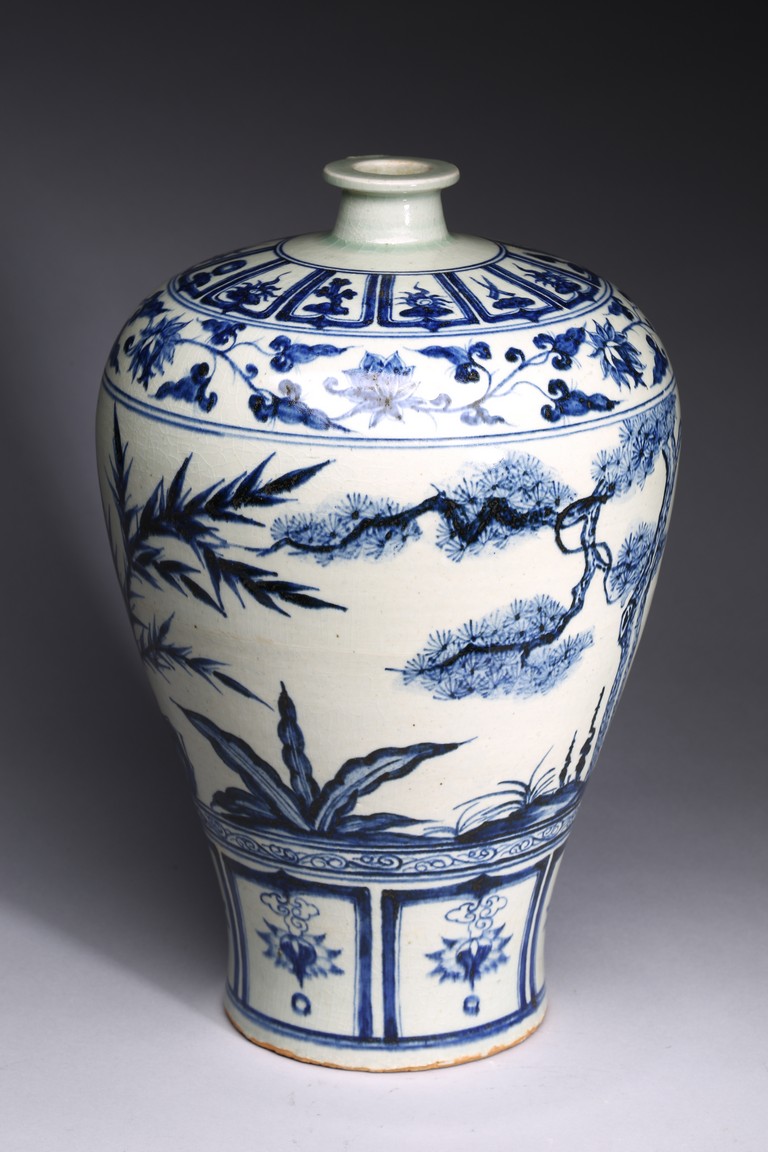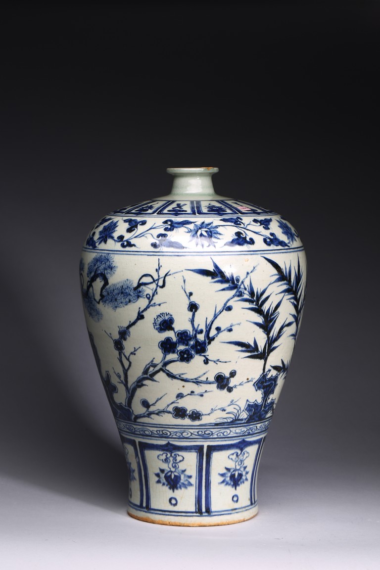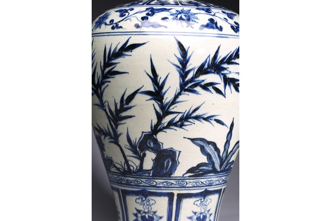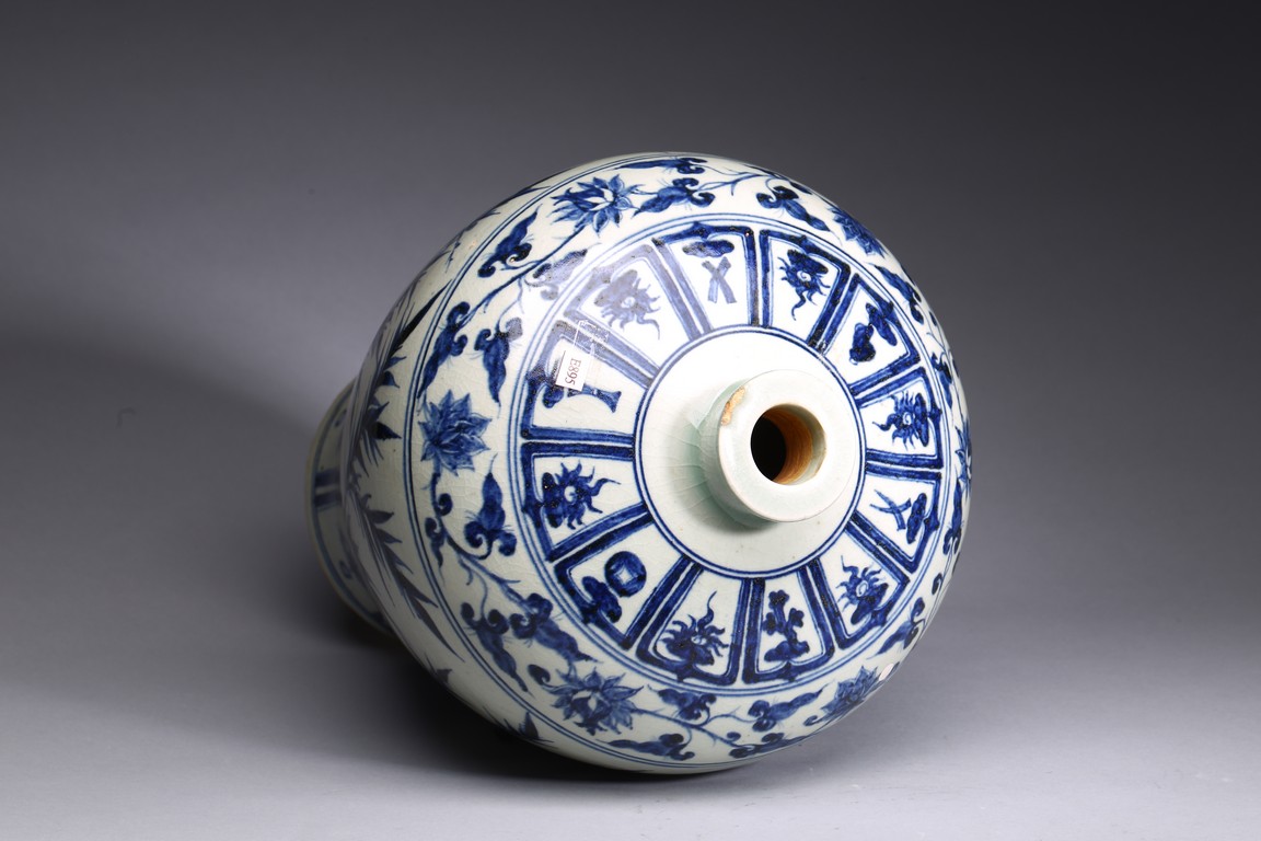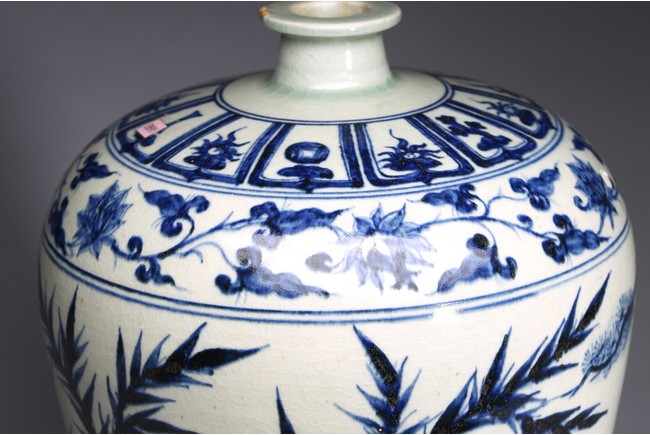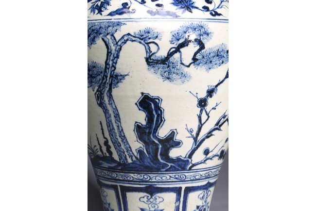 The body tapering from high rounded shoulder to the gently spreading foot, painted blue plants decoration on white ground.Qing Dynasty period