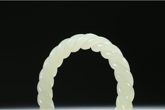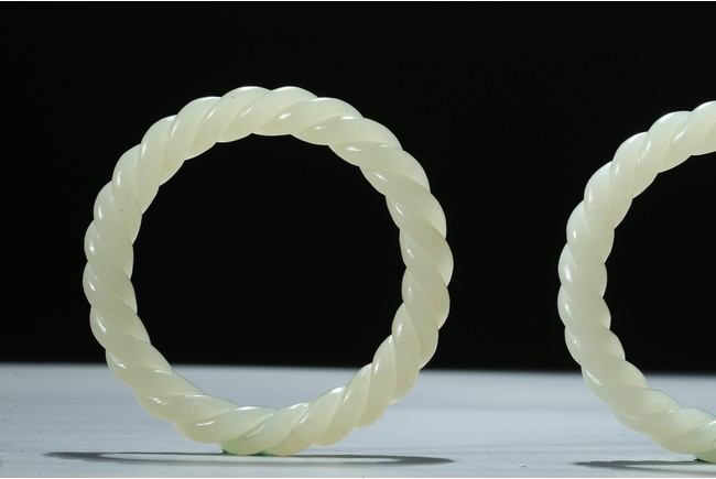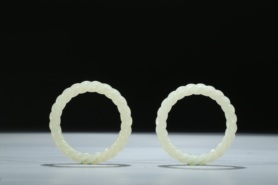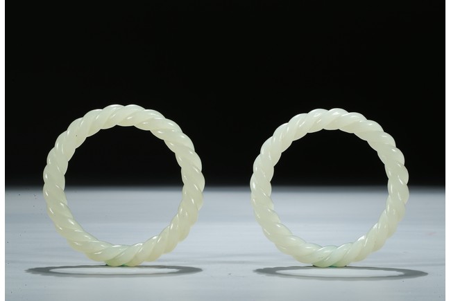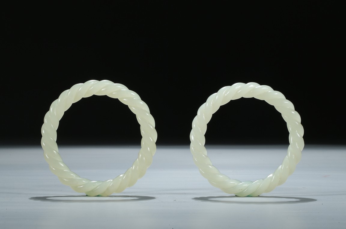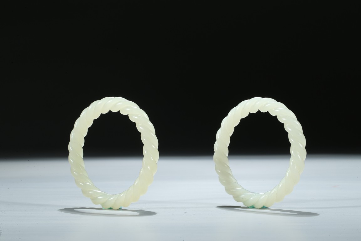 Each bangle is finely carved as two strands of rope twisted together, the stone is of a white even tone. Qing Dynasty period.