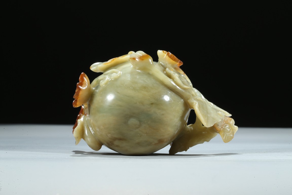 Well carved as a gourd borne on a gnarled stem bearing leafy flowers and tendrils, in which the flowers skillfully carved to utilize the russet patch of the stone. Qing Dynasty period.