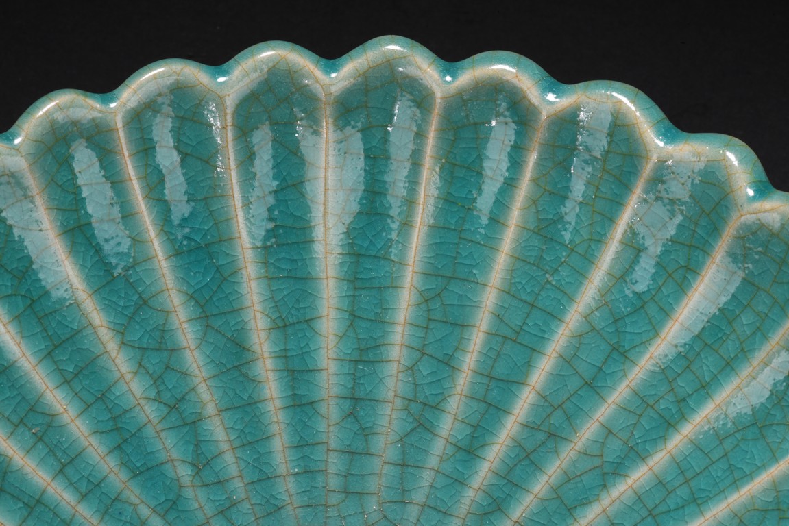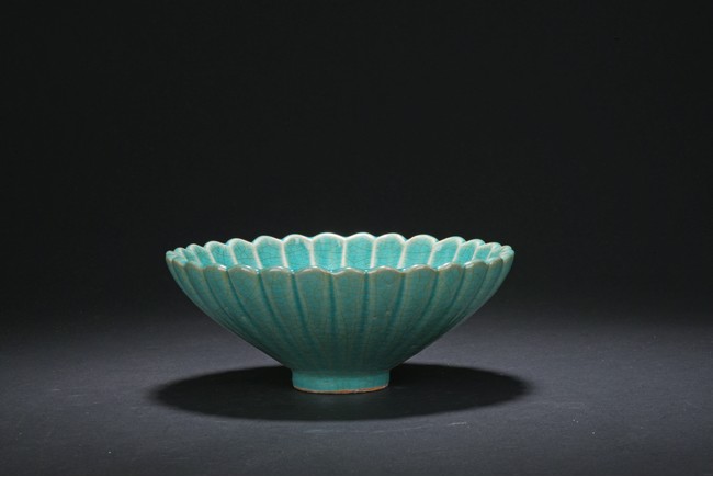 The rounded fluted sides rising from a tapering foot to a scalloped rim, moulded with form of chrysanthemum petals, covered overall in an even dark green glaze.