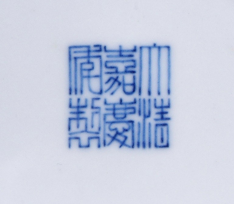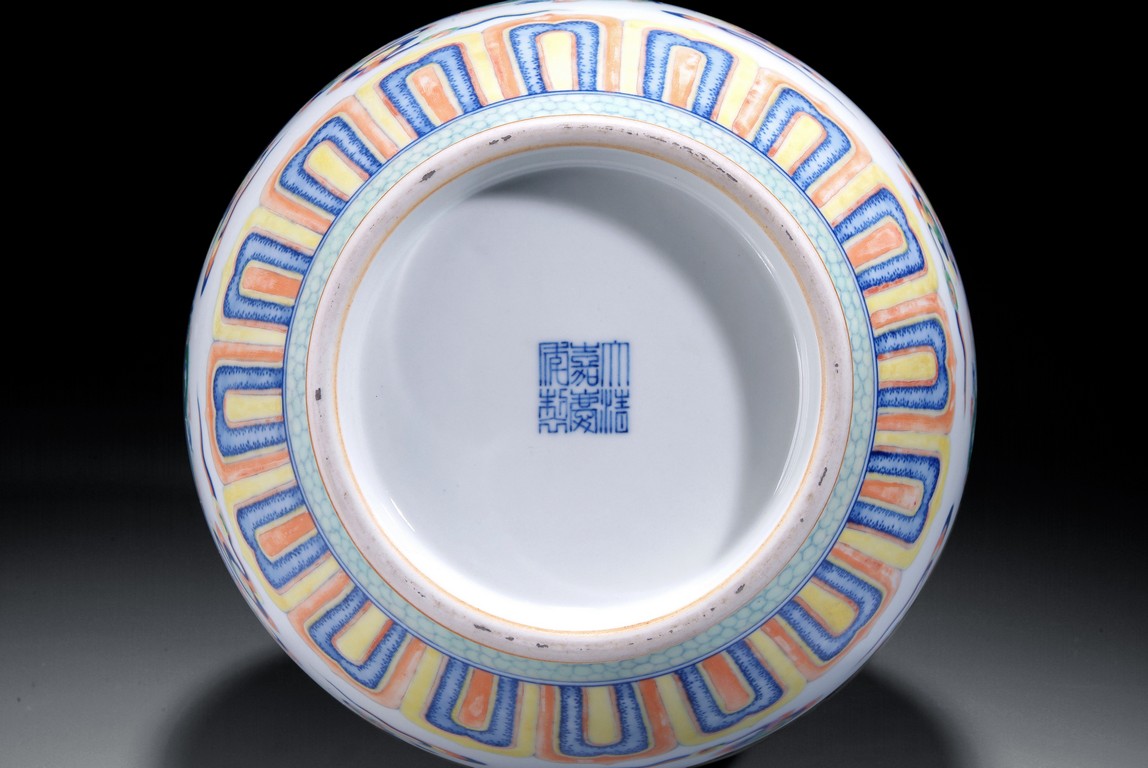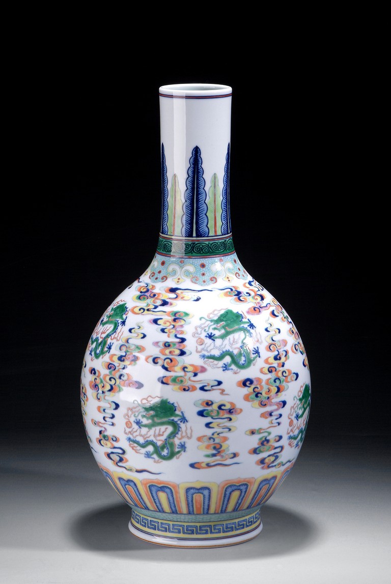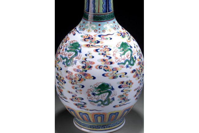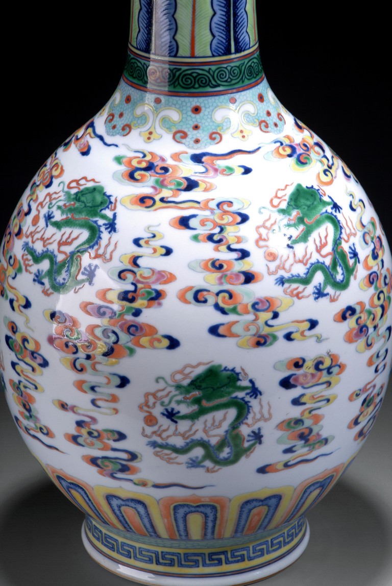 A tall Doucai bottle vase with designs of five clawed dragons and cloud between two bands of lotus petals and banana leaves. The vase is of bulbous form tapering to a cylindrical neck, with a round base. The bottom bears a six characters "JIAQING" mark. Qing Dynasty period.