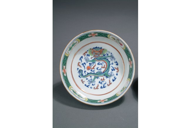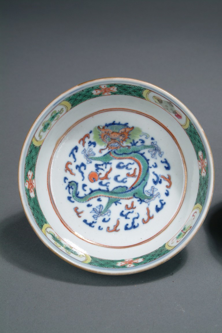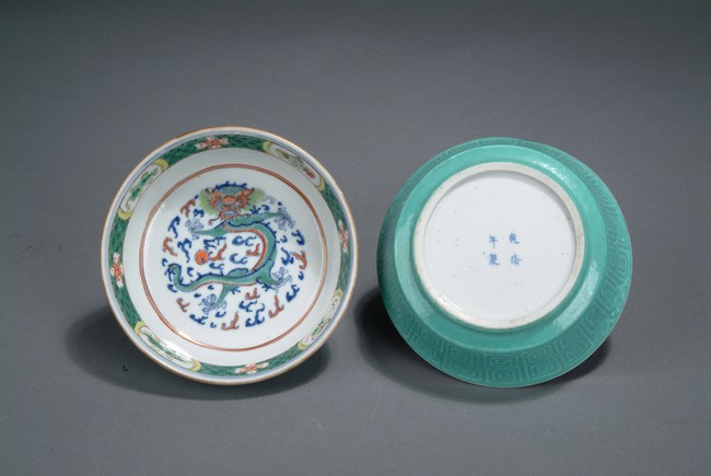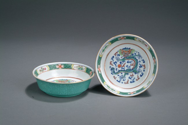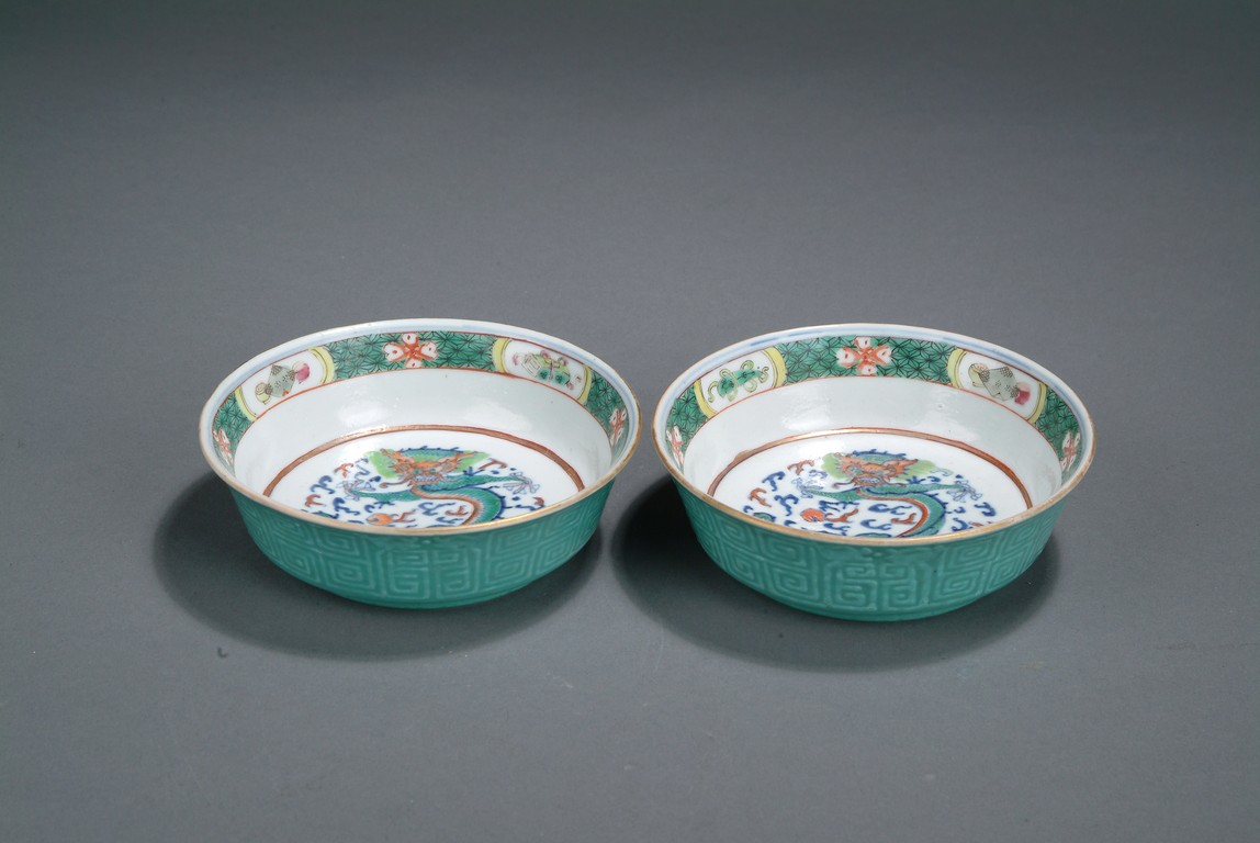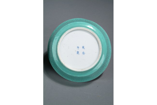 Finely glazed in teal ground on the exterior with key-fret patterns, the interior depicts a five-clawed dragon flying in the clouds, with a band of treasure pattern on the top of the bowl rim. Four character 'QIANLONG' mark on the bottom.