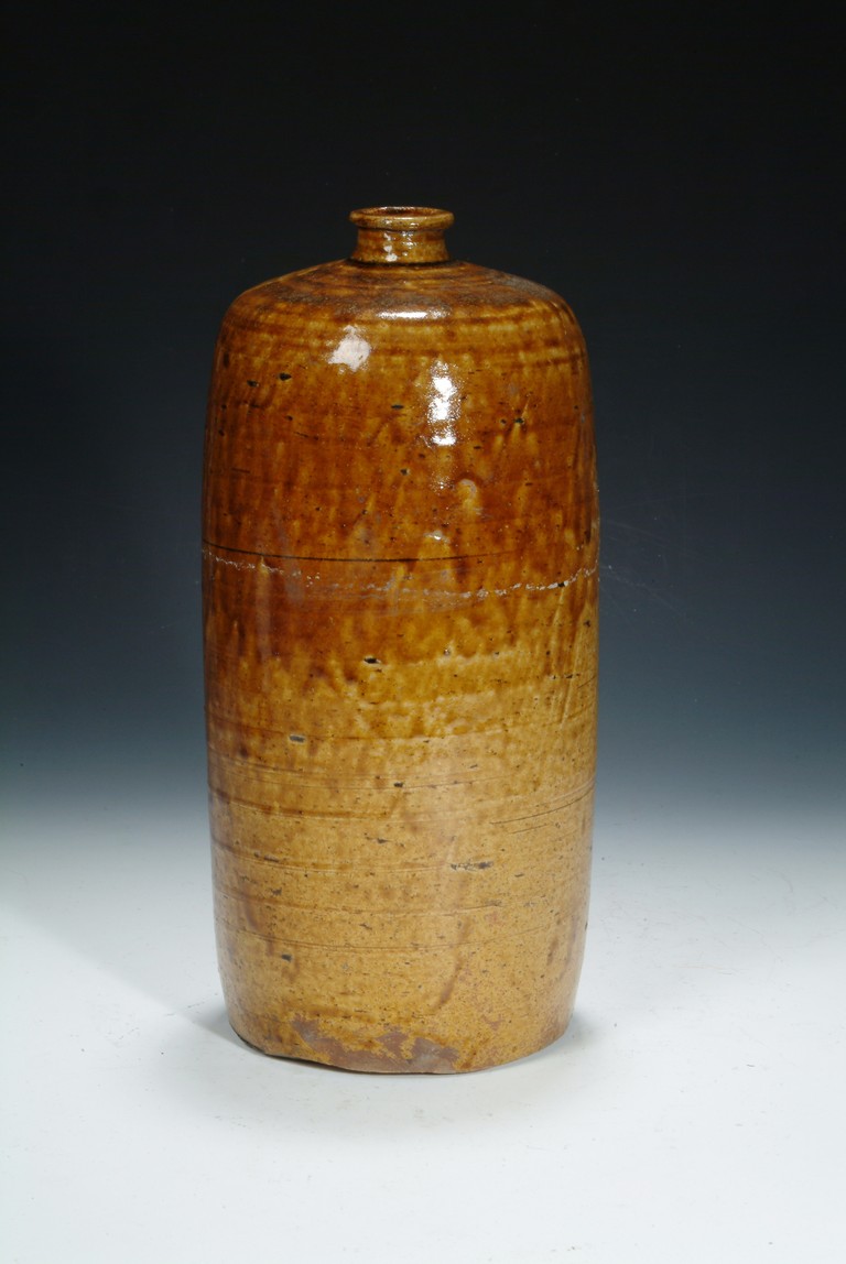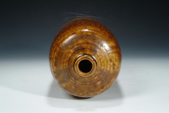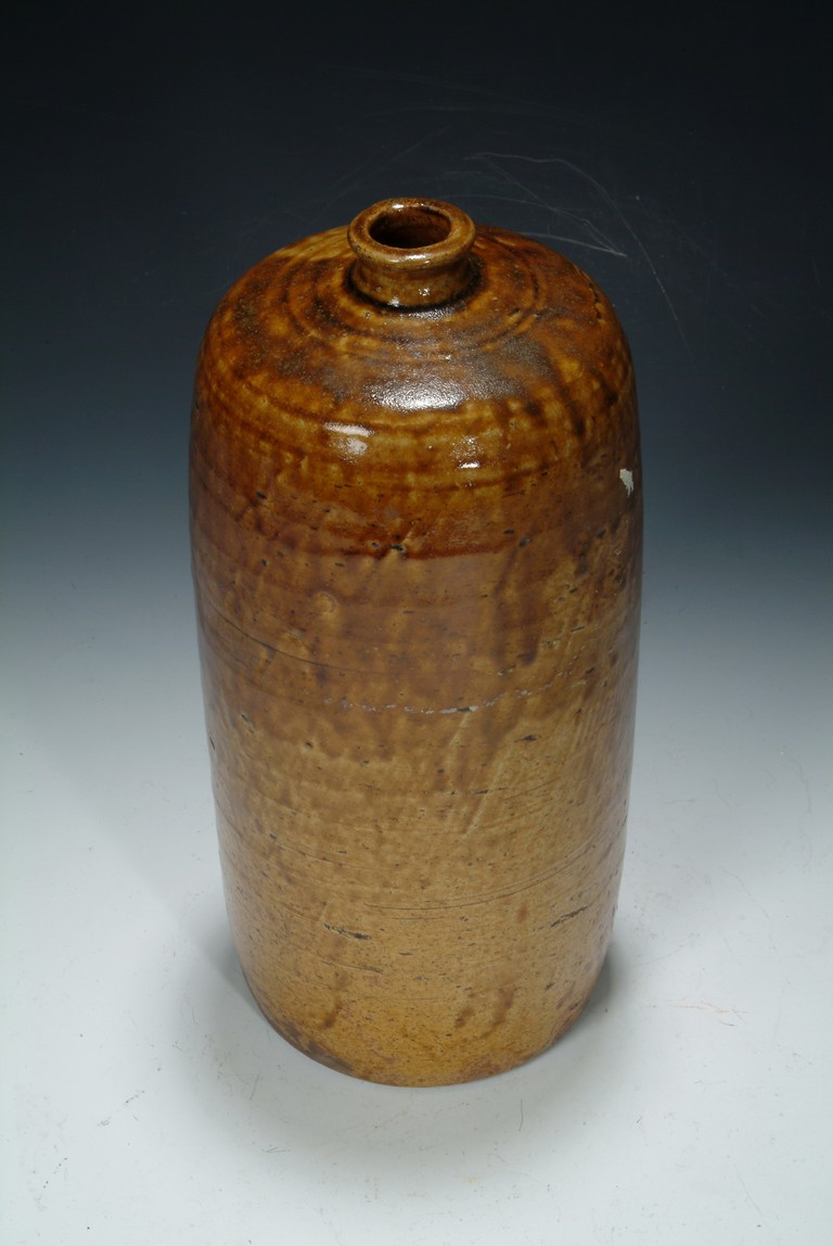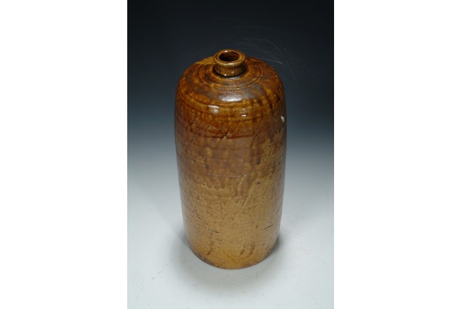 A sleeve shaped bottle covered overall with rich and flowing brown glaze.