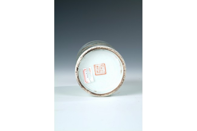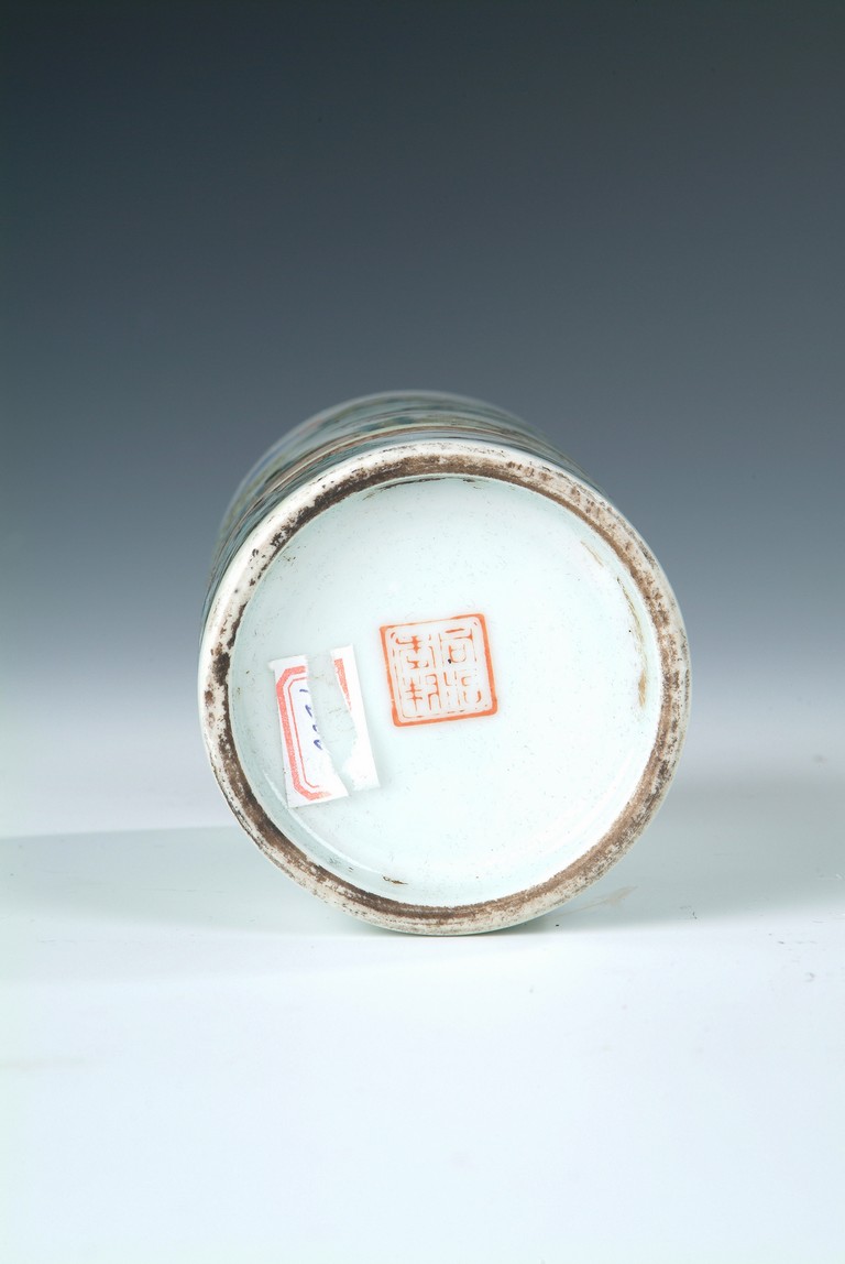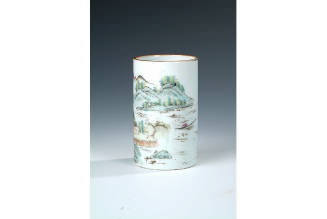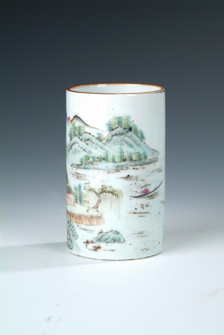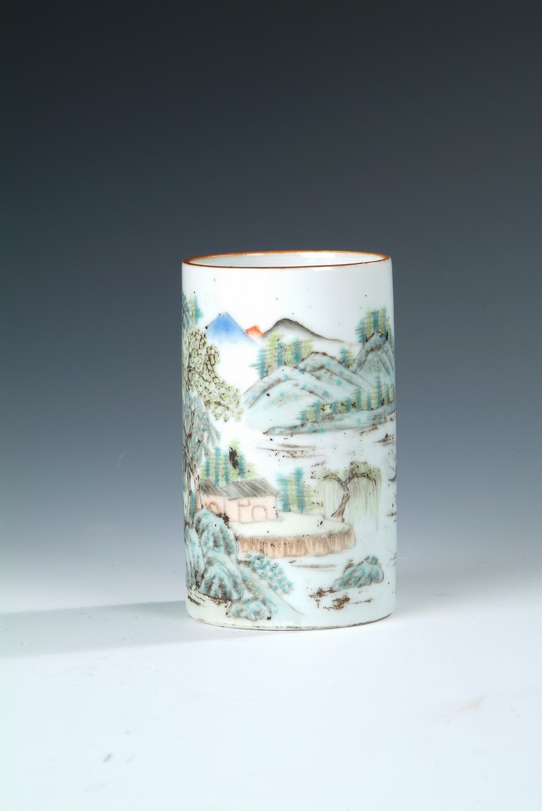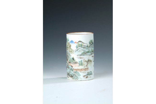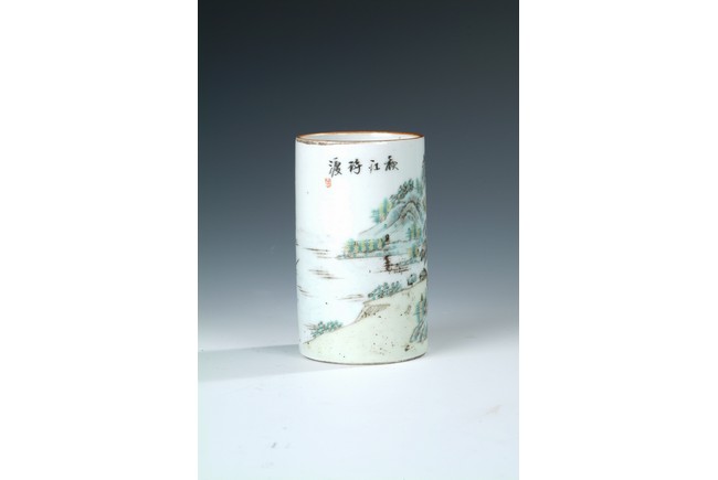 Of cylindrical form, the brush pot depicts an mountain, river, and village scenery, with trees, villagers, and rocks scattered around. Four Chinese characters and artist mark on the top, and four characters 'TONGZHI' mark on bottom. Republic period.