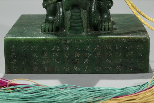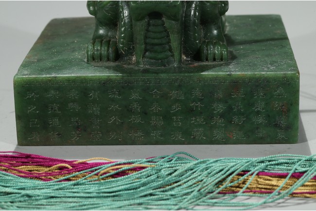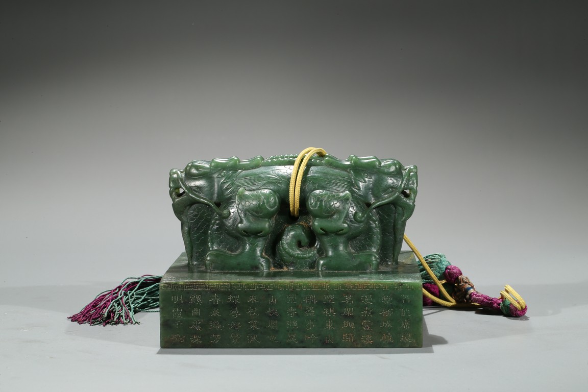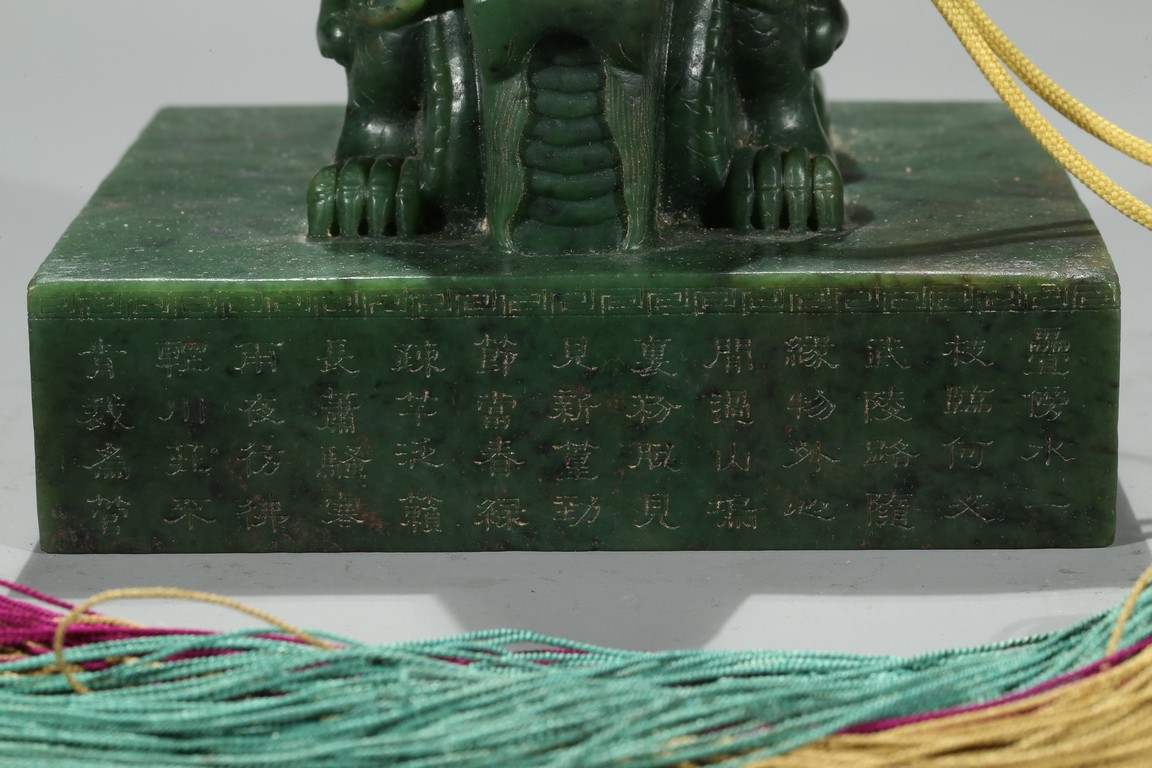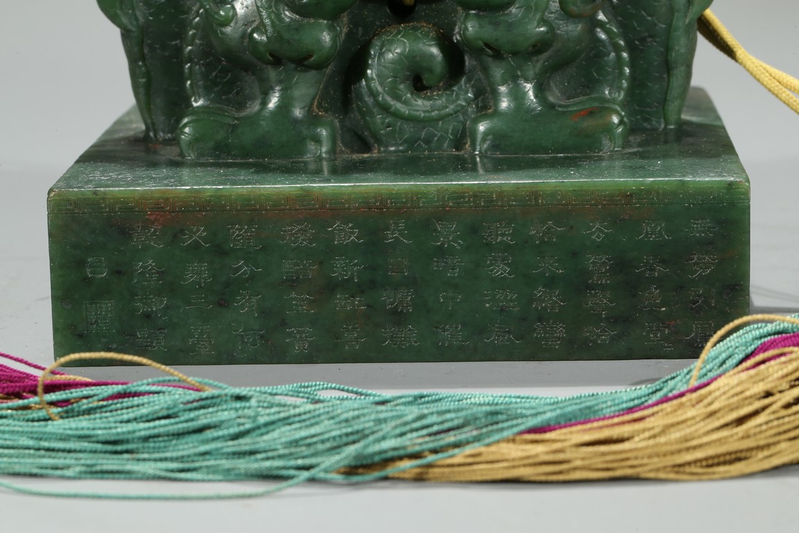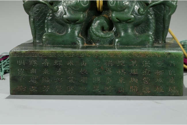 The square seal is surmounted with a mythical double-headed beast carved recumbent with scales and wings, the two pairs of opposing horns conjoining above the articulated spine, the side inscribed in gilt with imperial inscriptions.The seal face carved with six characters. The stone is of spinach green tone with some russet veins.