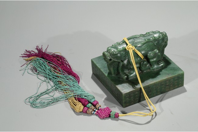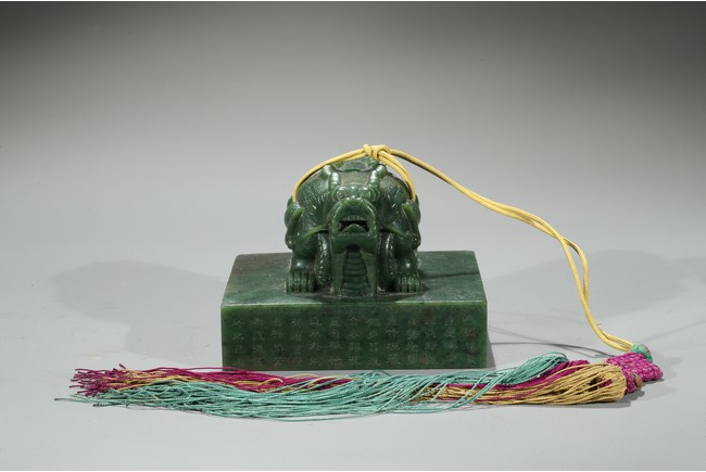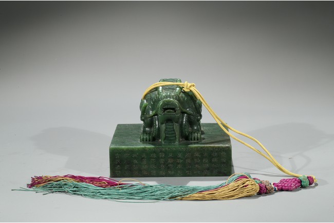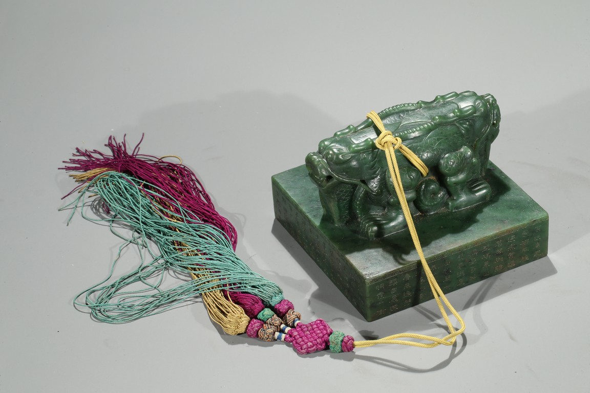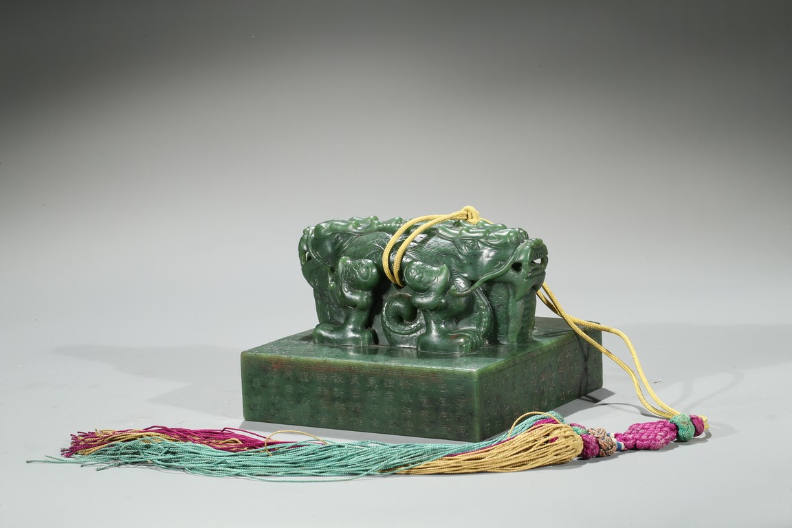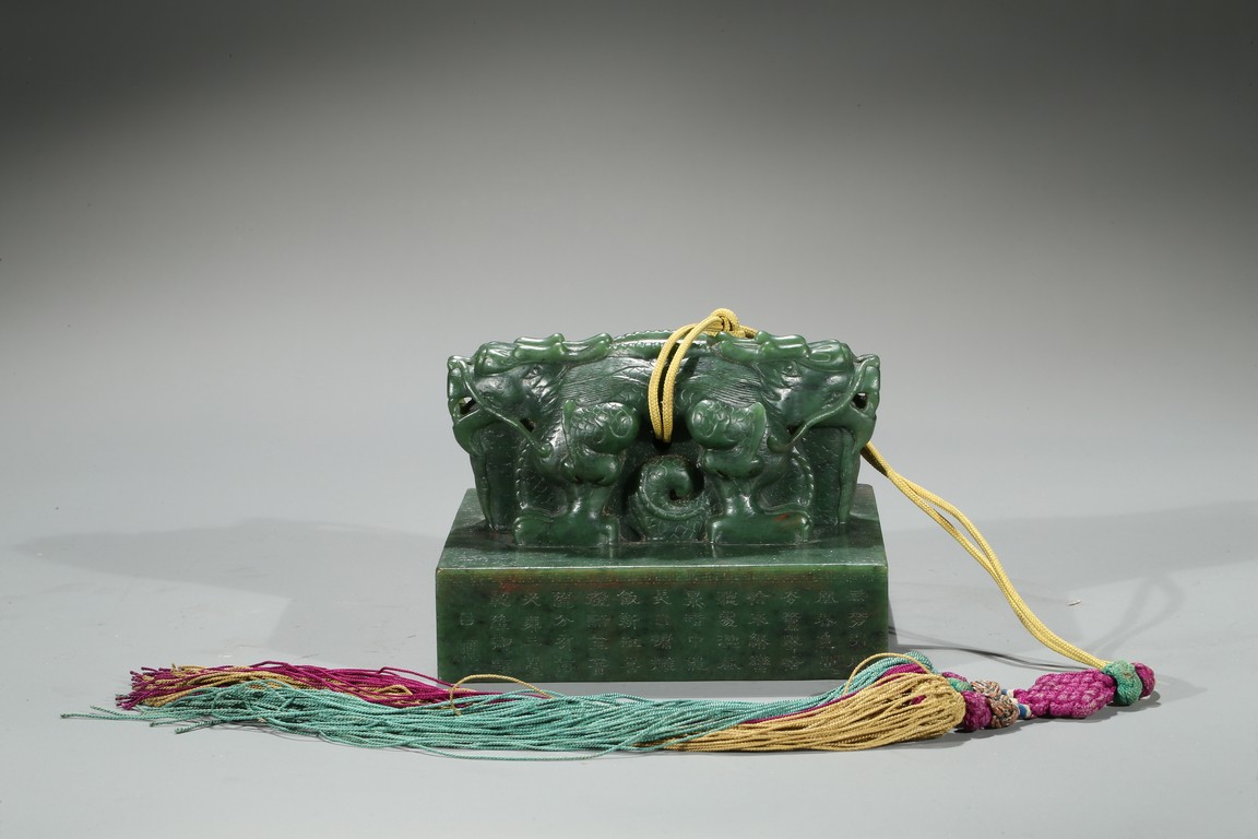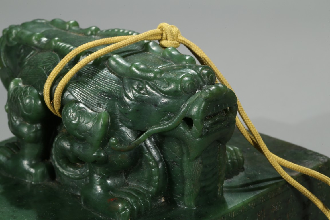 The square seal is surmounted with a mythical double-headed beast carved recumbent with scales and wings, the two pairs of opposing horns conjoining above the articulated spine, the side inscribed in gilt with imperial inscriptions.The seal face carved with six characters. The stone is of spinach green tone with some russet veins.