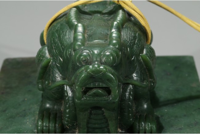此方碧玉雕玉璽雕工一流,用料講究,通體較大氣派。所雕(古稀天子之寶).雕法自然,玉雕上方所雕雙龍敦厚威嚴,玉璽四周為禦題詩所刻棣書。