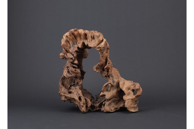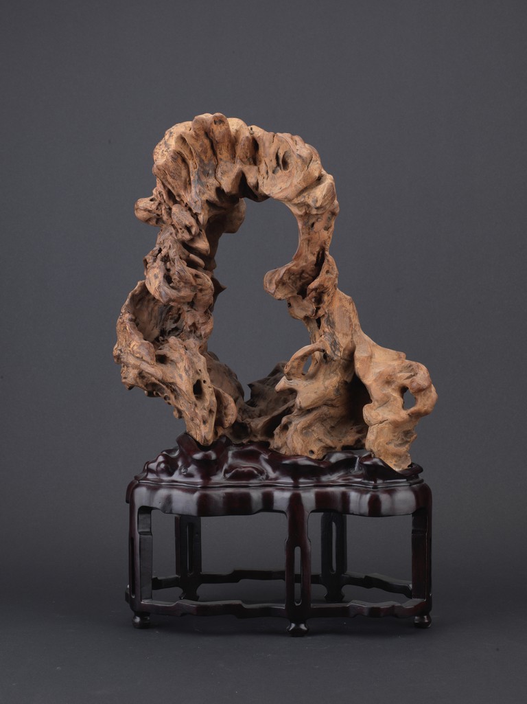 The naturalistic rendered wood with a central aperture and jagged edge, all supported on a wooden stand.