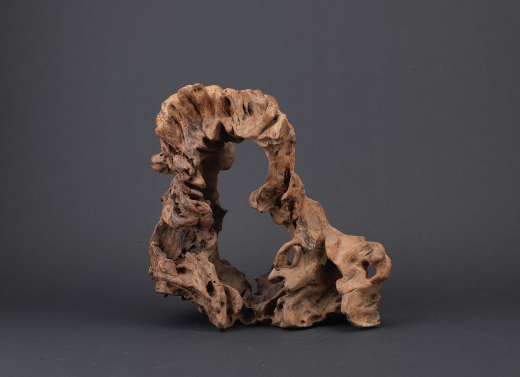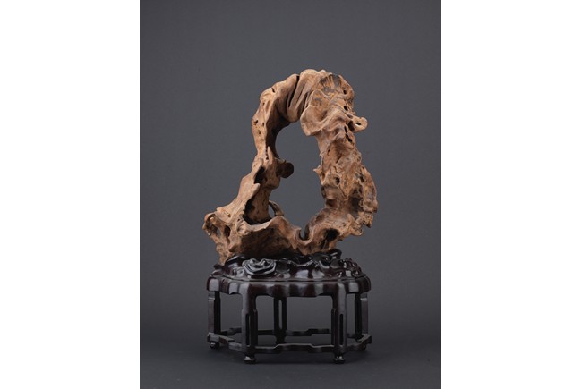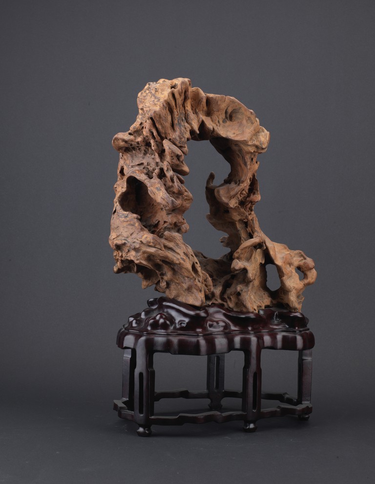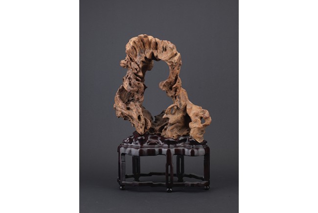 A NATURALISTIC WOOD CARVED 'MOUNTAIN' DISPLAY    清 木雕隨形擺件
