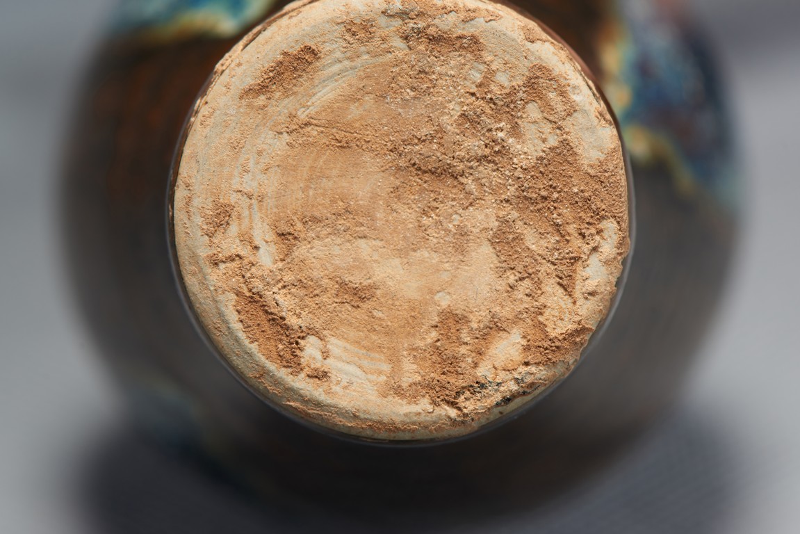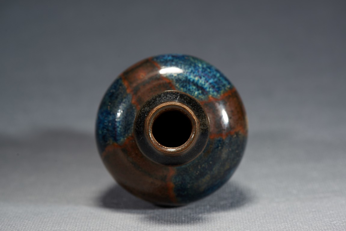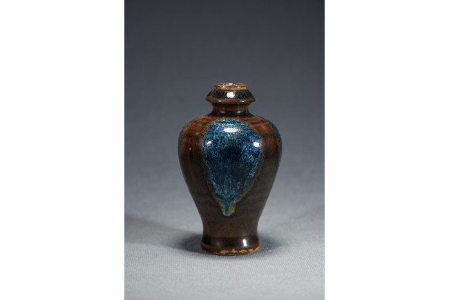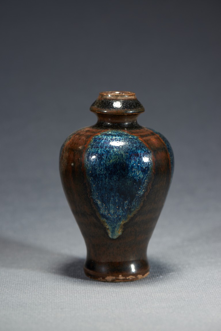 Of high shoulder and rising from spreading foot, the vase is covered with mottled brown and black glaze with each other three large areas of robin-egg blue glaze, the base unglazed. Qing Dynasty period