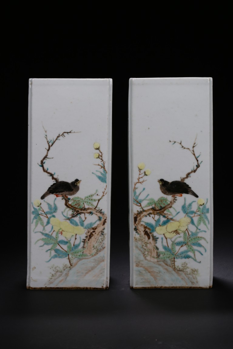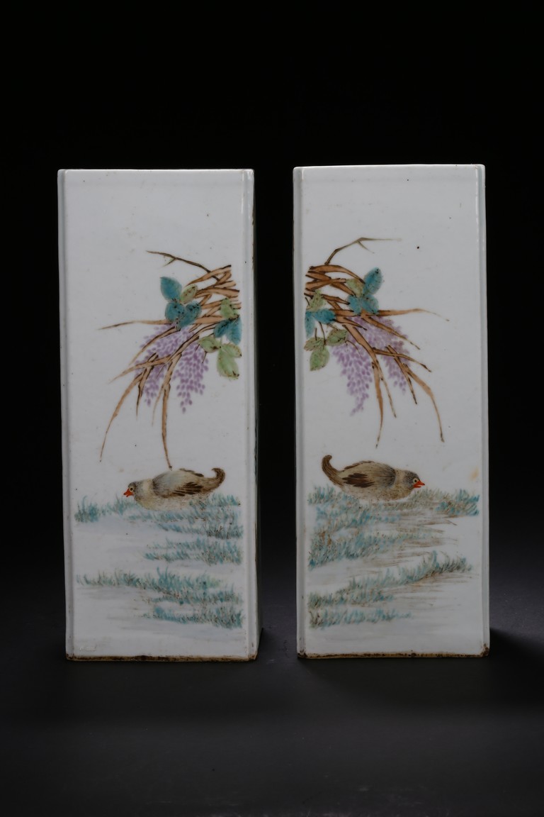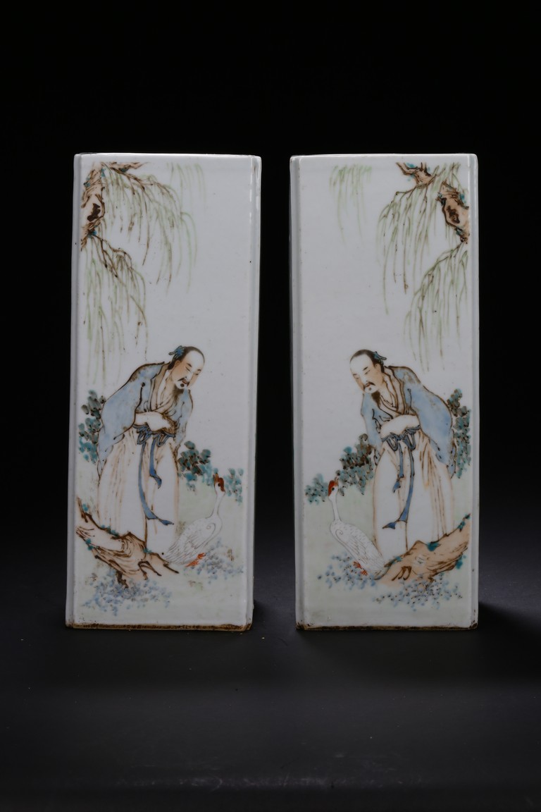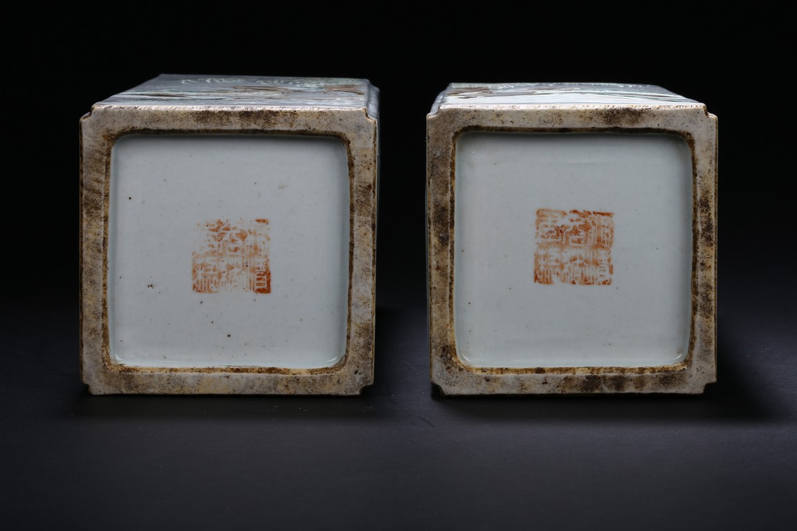 Each of elongated square form, the front side finely enamelled with an elder wearing loose robe under tall willow tree staring at a standing white goose, the reverse with similar setting depicted a farmer bending his waist to feed a white pigeon, the other two sides enamelled with a lack bird perching on gnarled tree branch or a brownish fledgling ramble on the grassy land, the base with a six character mark.