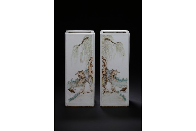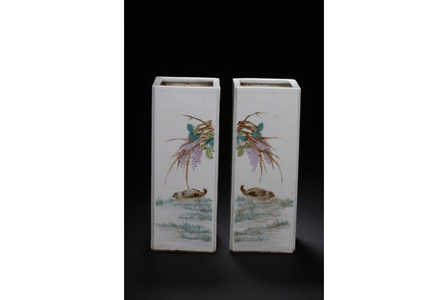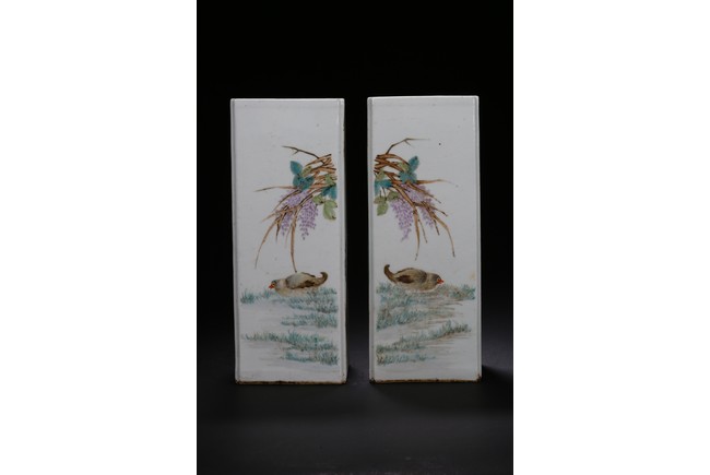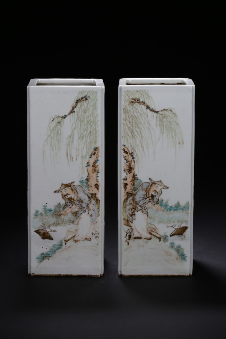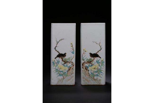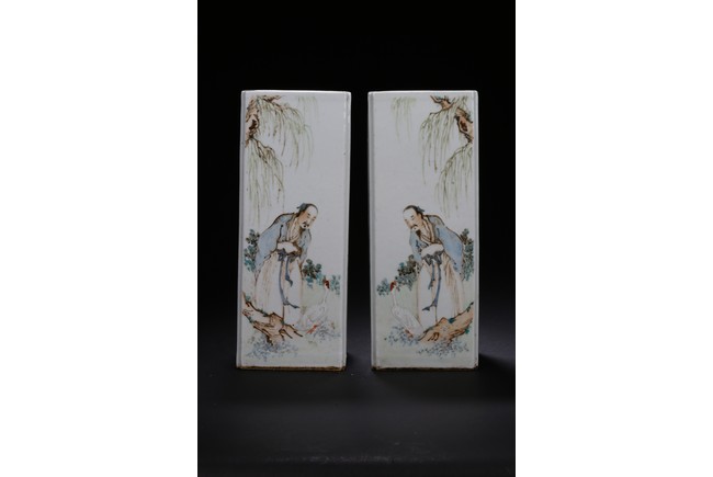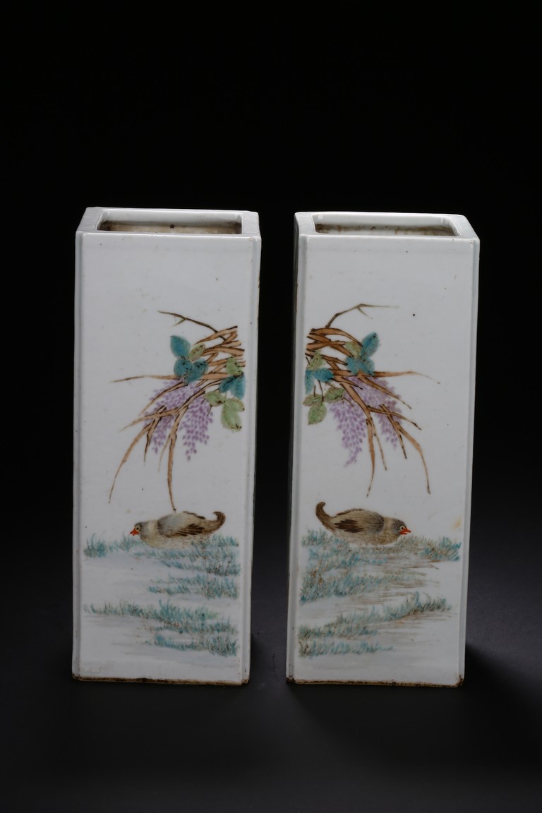 Each of elongated square form, the front side finely enamelled with an elder wearing loose robe under tall willow tree staring at a standing white goose, the reverse with similar setting depicted a farmer bending his waist to feed a white pigeon, the other two sides enamelled with a lack bird perching on gnarled tree branch or a brownish fledgling ramble on the grassy land, the base with a six character mark.