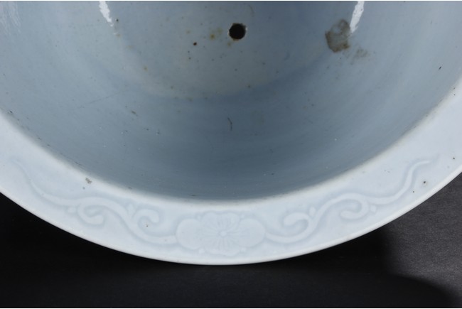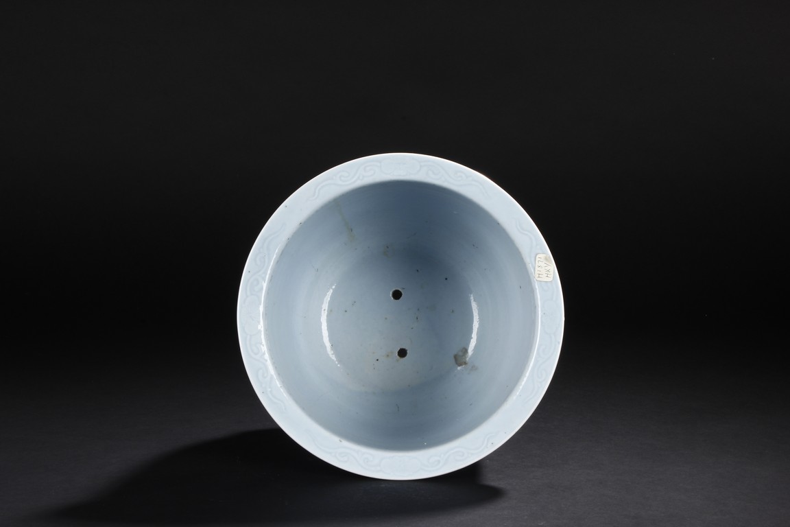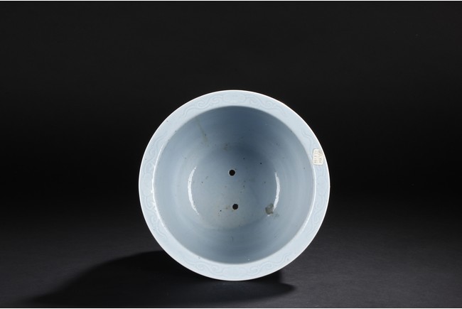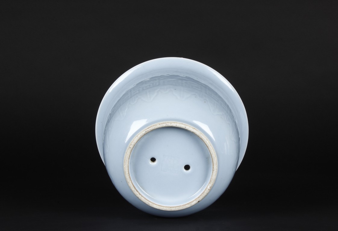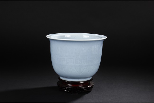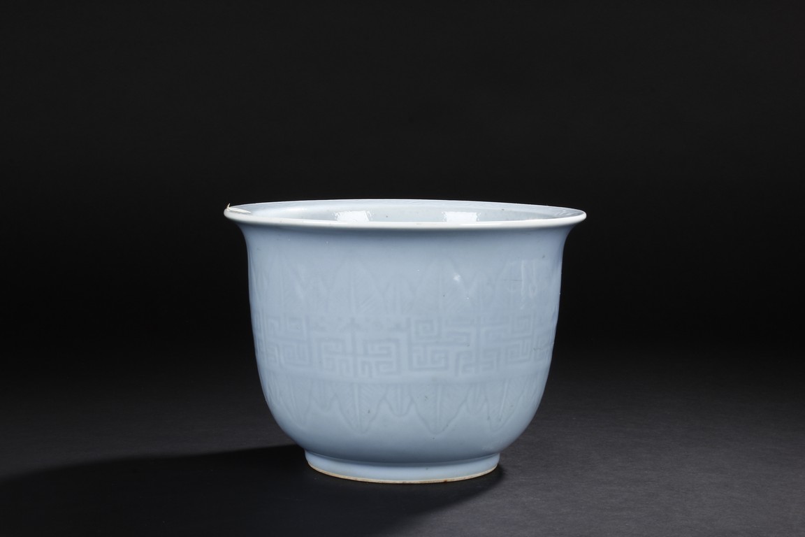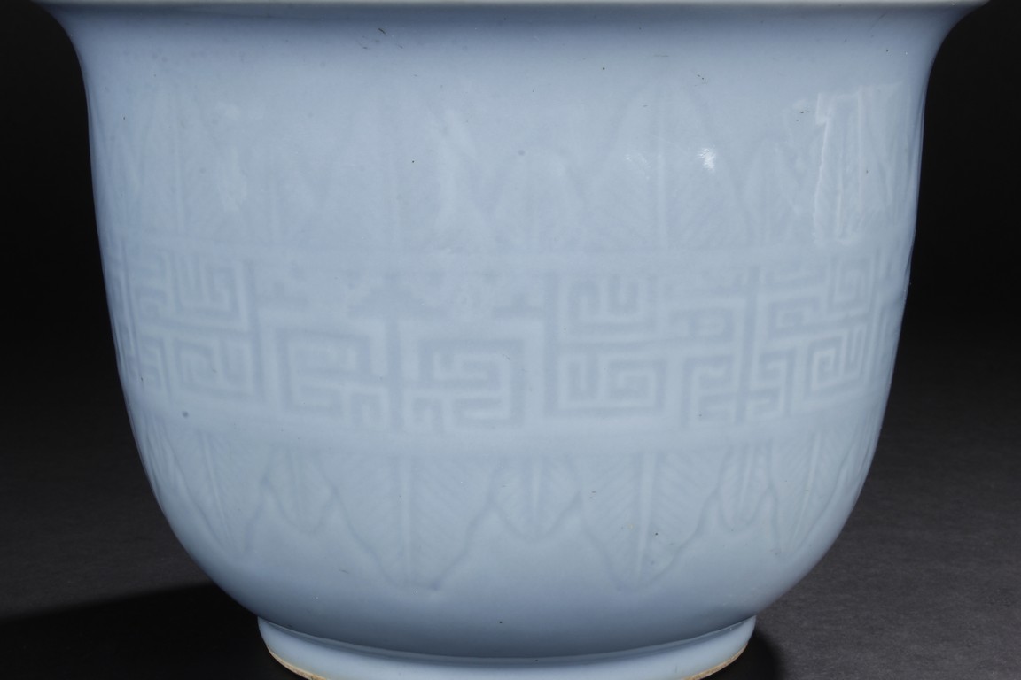 Rising from a short flaring circular base with tapered rounded sides to the everted rim,the exterior is moulded with key-fret pattern flanked by leave motifs,all against the sky blue background. The bottom bears six character 'Qianlong' mark. Qing Dynasty period.